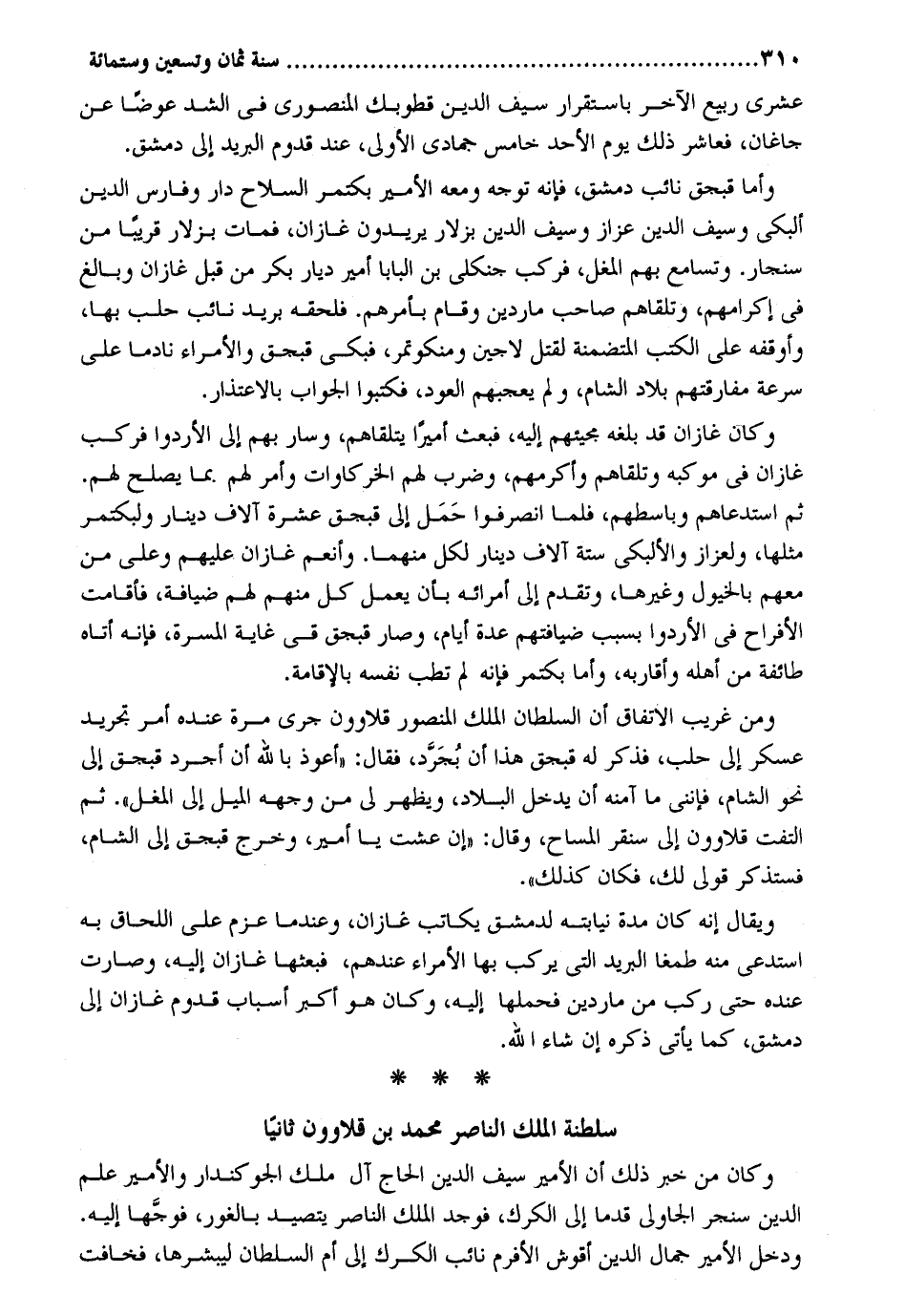 عشرى ربيع الآخر باستقرار سيف الدّين قطوبك المنصوري فِي الشد عوضا عَن جاغان فعاشر ذَلِك يَوْم الْأَحَد خَامِس جُمَادَى الأولى عِنْد قدوم الْبَرِيد إِلَيّ دمشق. وَأما قبجق نَائِب دمشق فَإِنَّهُ توجه وَمَعَهُ الْأَمِير بكتمر السِّلَاح دَار وَفَارِس الدّين ألبكي وَسيف الدّين عزاز وَسيف الدّين بزلار يُرِيدُونَ غازان فَمَاتَ بزلار قَرِيبا من سنجار. وتسامع بهم الْمغل فَركب جنكلي بن البابا أَمِير ديار بكر من قبل غازان وَبَالغ فِي إكرامهم وتلقاهم صَاحب ماردين وَقَامَ بأمرهم. فَلحقه بريد نَائِب حلب بهَا وَأَوْقفهُ على الْكتب المتضمنة لقتل لاجين ومنكوتمر فَبكى قبجق والأمراء نَادِما على سرعَة مفارقتهم بِلَاد الشَّام وَلم يعجبهم الْعود فَكَتَبُوا الْجَواب بالاعتذار. وَكَانَ غازان فد بلغه مجيئهم إِلَيْهِ فَبعث أَمِيرا يتلقاهم وَسَار بهم إِلَى الأردوا فَركب غازان فِي موكبه وتلقاهم وَأكْرمهمْ وَضرب لَهُم الخركاوات وَأمر لَهُم. مِمَّا يصلح لَهُم. ثمَّ استدعاهم وباسطهم فَلَمَّا انصرفوا حمل إِلَيّ قبجق عشرَة آلَاف دِينَار ولبكتمر مثلهَا ولعزاز والألبكي سِتَّة آلَاف دِينَار لكل مِنْهُمَا. وأنعم غازان عَلَيْهِم وعَلى من مَعَهم بالخيول وَغَيرهَا وَتقدم إِلَيّ أمرائه بِأَن يعْمل كل مِنْهُم لَهُم ضِيَافَة فأقامت الأفراح فِي الأردوا بِسَبَب ضيافتهم عدَّة أَيَّام وَصَارَ قبجق قي غَايَة المسمرة فَإِنَّهُ أَتَاهُ طَائِفَة من أَهله وأقاربه وَأما بكتمر فَإِنَّهُ لم تطب نَفسه بِالْإِقَامَةِ. وَمن غَرِيب الِاتِّفَاق أَن السُّلْطَان الْملك الْمَنْصُور قلاوون جري مرّة عِنْده أَمر تَجْرِيد عَسْكَر إِلَيّ حلب فَذكر لَهُ قبجق هَذَا أَن بجرد فَقَالَ: أعوذ بِاللَّه أَن أجرد قبجق إِلَيّ نَحْو الشَّام فإنني مَا أَمنه أَن يدْخل الْبِلَاد وَيظْهر لي من وَجهه الْميل إِلَيّ الْمغل. ثمَّ الْتفت قلاوون إِلَى سنقر المساح وَقَالَ: إِن عِشْت يَا أَمِير وَخرج قبجق إِلَيّ الشَّام فستذكر قولي لَك فَكَانَ كَذَلِك. وَيُقَال إِنَّه كَانَ مُدَّة نيابته لدمشق يُكَاتب غازان وعندما عزم على اللحاق بِهِ استدعى مِنْهُ طمغا الْبَرِيد الَّتِي يركب بهَا الْأُمَرَاء عِنْدهم فبعثها غازان إِلَيْهِ وَصَارَت عِنْده حَتَّى ركب من ماردين فحملها إِلَيْهِ وَكَانَ هُوَ أكبر أَسبَاب قدوم غازان إِلَيّ دمشق كَمَا يَأْتِي ذكره إِن شَاءَ سلطنة الْملك النَّاصِر مُحَمَّد بن قلاوون ثَانِيًا وَكَانَ من خبر ذَلِك أَن الْأَمِير سيف الدّين الْحَاج آل ملك الجوكندار والأمير علم الدّين سنجر الجاولي قدما إِلَى الكرك فَوجدَ الْملك النَّاصِر يتصيد بالغور فوجها إِلَيْهِ. وَدخل الْأَمِير جمال الدّين أقوش الأفرم نَائِب الكرك إِلَيّ أم السُّلْطَان ليبشرها فخافت