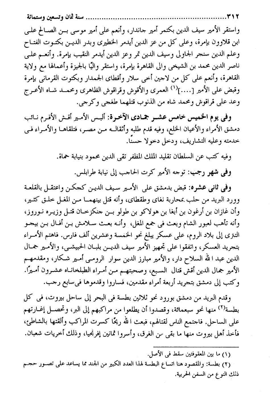 وَاسْتقر الْأَمِير سيف الدّين بكتمر أَمِير جاندار وأنعم على أَمِير مُوسَى بن الصَّالح على ابْن قلاوون بإمرة وعَلى كل من عز الدّين أيدمر الخطيري وَبدر الدّين بكتوت الفتاح وَعلم الدّين سنجر الجاولي وَسيف الدّين تمر وَعز الدّين أيدمر النَّقِيب بإمرة. وأنعم على نَاصِر الدّين مُحَمَّد بن الشيخي وَإِلَى الْقَاهِرَة بإمرة وَاسْتقر واليًا بالجيزة وأعمالها مَعَ ولَايَة الْقَاهِرَة وأنعم على كل من لاجين أخي سلار وأقطاي الجمدار وبكتوت القرماني بإمرة وَقبض على الْأَمِير الْعمريّ والأقوش وقراقوش الظَّاهِرِيّ وَمُحَمّد شاه الْأَعْرَج وعد على قراقوش وَمُحَمّد شاه من الذُّنُوب قَتلهمَا طغجى وكرجي. وإلي يَوْم الْخَمِيس خَامِس عشر جُمَادَى الْآخِرَة: ألبس الْأَمِير أقش الأفرم نَائِب دمشق الْأُمَرَاء والأعيان الْخلْع وَفِيه قدم طلبه وأثقاله من مصر فتلقاها والأمراء فِي خدمته وَعَلِيهِ التشاريف وَدخل دُخُولا حسنا. وَفِيه كتب عَن السُّلْطَان تَقْلِيد الْملك المظفر تَقِيّ الدّين مَحْمُود بنيابة حماة. وَفِي شهر رَجَب: توجه الْأَمِير كرت الْحَاجِب إِلَيّ نِيَابَة طرابلس. وَفِي ثَانِي عشره: قبض بِدِمَشْق على الْأَمِير سيف الدّين كجكن واعتقل بالقلعة وَورد الْبَرِيد من حلب بمحاربة نغاي وطقطاي وَإنَّهُ قتل بَينهمَا من الْمغل خلق كثير وَأَن غازان بن أرغون بن أبغا بن هولاكو بن طولو بن جنكزخان قتل وزيره نوروز وَأَنه تأهب لعبور الشَّام وَبعث فِي جمع الْمغل وَإنَّهُ بعث سلامش بن أفال بن بيجو التتري إِلَى بِلَاد الرّوم على عَسْكَر يبلغ نَحْو الْخَمْسَة وَعشْرين ألف فَارس. فاهتم الْأُمَرَاء بتجريد الْعَسْكَر وَاتَّفَقُوا على تجهيز الْأَمِير سيف الدّين بلبان الحبيشي والأمير جمال الدّين عبد الله السِّلَاح دَار والأمير مبارز الدّين سوارالرومى أَمِير شكار ومقدمهم الْأَمِير جمال الدّين أقش قتال السَّبع وصحبتهم من أُمَرَاء الطبلخاناه عشرُون أَمِيرا. وَكتب إِلَى دمشق بتجريد أَرْبَعَة أُمَرَاء مقدمين فَسَارُوا وقدموها فِي سَابِع رَجَب. وَقدم الْبَرِيد من دمشق بورود نَحْو ثَلَاثِينَ بطسة فِي الْبَحْر إِلَى سَاحل بيروت فِي كل بطسة مِنْهَا نَحْو سَبْعمِائة وقصدوا أَن يطلعوا من مراكبهم إِلَى الْبر وَتحصل إغارتهم على السَّاحِل. فَاجْتمع النَّاس لقتالهم فَبعث الله ريحًا كسرت المراكب وألقتها بالشاطئ فَأخذ أهل بيروت مِنْهَا مَا بقى من الْغَرق وأسروا ثَمَانِينَ إفرنجياً وَذَلِكَ أخريات شعْبَان.