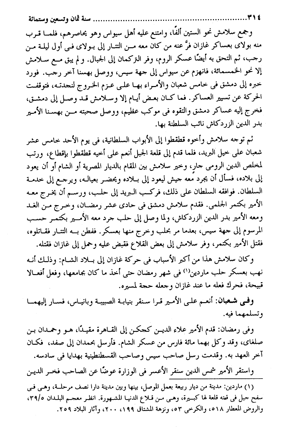 وَجمع سلامش نَحْو السِّتين ألفا وَامْتنع عَلَيْهِ أهل سيواس وَهُوَ يحاصرهم فَلَمَّا قرب مِنْهُ بولاي بعساكر غازان فر عَنهُ من كَانَ مَعَه من التتار إِلَى بولاي فِي أول لَيْلَة من رَجَب ثمَّ الْتحق بِهِ أَيْضا عَسْكَر الرّوم وفر التركمان إِلَى الْجبَال. وَلم يبْق مَعَ سلامش إِلَّا نَحْو الْخَمْسمِائَةِ فإنهزم عَن سيواس إِلَى جِهَة سيس وَوصل بهسنا آخر رَجَب. فورد خَبره إِلَى دمشق فِي خَامِس شعْبَان والأمراء بهَا على عزم الْخُرُوج لنجدته فتوقفت الْحَرَكَة عَن تسيير العساكر. فَمَا كَانَ بعض أَيَّام إِلَّا وسلامش قد وصل إِلَى دمشق فَخرج إِلَيْهِ عَسَاكِر دمشق والتقوه فِي موكب عَظِيم وَوصل صحبته من بهسنا الْأَمِير بدر الدّين الزردكاش نَائِب السلطنة بهَا. ثمَّ توجه سلامش وَأَخُوهُ قطقطوا إِلَى الْأَبْوَاب السُّلْطَانِيَّة فِي يَوْم الْأَحَد خَامِس عشر شعْبَان على خيل الْبَرِيد فَلَمَّا قدم إِلَى قلعة الْجَبَل أنعم على أَخِيه قطقطوا بإقطاع ورتب لمخلص الدّين الرُّومِي جَار وَخير سلامش بَين الْمقَام بالديار المصرية أَو الشَّام أَو أَن يعود إِلَى بِلَاده فَسَالَ أَن يجرد مَعَه جَيش ليعود إِلَى بِلَاده ويحضر بعياله وَيرجع إِلَى خدمه السُّلْطَان. فوافقه السُّلْطَان على ذَلِك فَركب الْبَرِيد إِلَى حلب ورسم أَن يخرج مَعَه الْأَمِير بكتمر الجلمي. فَقدم سلامش دمشق فِي حادي عشر رَمَضَان وَخرج من الْغَد وَمَعَهُ الْأَمِير بدر الدّين الزردكاش وَلما وصل إِلَى حلب جرد مَعَه الْأَمِير بكتمر حسب المرسوم إِلَى جِهَة سيس بَعْدَمَا مر بحلب وَخرج مِنْهَا بعسكر. فَفطن بِهِ التتار فقاتلوه فَقتل الْأَمِير بكتمر وفر سلامش إِلَى بعض القلاع فَقبض عَلَيْهِ وَحمل إِلَى غازان فَقتله. وَكَانَ سلامش هَذَا من أكبر الْأَسْبَاب فِي حَرَكَة غازان إِلَى بِلَاد الشَّام: وَذَلِكَ إِنَّه نهب بعسكر حلب ماردين فِي شهر رَمَضَان حَتَّى أَخذ مَا كَانَ بجامعها وَفعل أفعالاً قبيحة فحرك فعله مَا عِنْد غازان وَجعله حجَّة لمسيره. وَفِي شعْبَان: انْعمْ على الْأَمِير قرا سنقر بنيابة الصبيبة وبانياس فَسَار إِلَيْهِمَا وتسلمهما فِيهِ. وَفِي رَمَضَان: قدم الْأَمِير عَلَاء الدّين كجكن إِلَى الْقَاهِرَة مُقَيّدا هُوَ وحمدان بن صلغاي وَقد وكل بهما مائَة فَارس من عَسْكَر الشَّام. فَأرْسل بحمدان إِلَى صفد فَكَانَ آخر الْعَهْد بِهِ. وقدمت رسل صَاحب سيس وَصَاحب الْقُسْطَنْطِينِيَّة بِهَدَايَا فِي سادسه. وَاسْتقر الْأَمِير شمس الدّين سنقر الأعسر فِي الوزارة عوضا عَن الصاحب فَخر الدّين