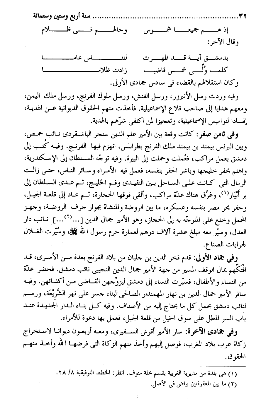 إِذا هم جَمِيعًا شموس وحالهم فِي ظلام وَقَالَ الآخر: بِدِمَشْق آيَة قد ظَهرت للنَّاس عَاما كلما ولي شمس قَاضِيا زَادَت ظلاما وَكَانَ استقلالهم بِالْقضَاءِ فِي سادس جُمَادَى الأولى. وَفِيه وَردت رسل الأنبرور ورسل الفنش ورسل مُلُوك الفرنج ورسل ملك الْيمن وَمَعَهُمْ هَدَايَا إِلَى صَاحب قلاع الإسماعيلية. فَأخذت مِنْهُم الْحُقُوق الديوانية عَن الْهَدِيَّة إفسادا لنواميس الإسماعيلية وتعجيزا لمن اكْتفي شرهم بالهدية. وَفِي ثامن صفر. كَانَت وقْعَة بَين الْأَمِير علم الدّين سنجر الباشقردي نَائِب حمص وَبَين الْبُرْنُس بيمند بن بيمند ملك الفرنج بطرابلس انهزم فِيهَا الفرنج. وَفِيه كتب إِلَى دمشق بِعَمَل مراكب فَعمِلت وحملت إِلَى البيرة. وَفِيه توجه السُّلْطَان إِلَى الْإسْكَنْدَريَّة واهتم بِحَفر خليجها وباشر الْحفر بِنَفسِهِ فَعمل فِيهِ الْأُمَرَاء وَسَائِر النَّاس حَتَّى زَالَت الرمال الَّتِي كَانَت على السَّاحِل بَين النقيدي وفم الخليج ثمَّ عدى السُّلْطَان إِلَى بر أبيار وغرق هُنَاكَ عدَّة مراكب وَألقى فَوْقهَا الْحِجَارَة ثمَّ عَاد إِلَى قلعة الْجَبَل وحفر بَحر مصر بِنَفسِهِ وَعَسْكَره مَا بَين الرَّوْضَة والمنشاة بجوار جرف الرَّوْضَة وجهز الْمحمل وخلع على المتوجه بِهِ إِلَى الْحجاز وَهُوَ الْأَمِير جمال الدّين نَائِب دَار الْعدْل وسير مَعَه مبلغ عشره آلَاف دِرْهَم لعمارة حرم رَسُول الله صلى الله عَلَيْهِ وَسلم وسيرت الغلال لجرايات الصناع. وَفِي جُمَادَى الأولى: قدم فَخر الدّين بن جلبان من بِلَاد الفرنج بعدة من الأسرى قد افتكهم. بِمَال الْوَقْف الْمسير من جِهَة الْأَمِير جمال الدّين النجيبي نَائِب دمشق. فَحَضَرَ عدَّة من النِّسَاء والأطفال فسيرت النِّسَاء إِلَى دمشق ليزوجهن القَاضِي من أكفائهن. وَفِيه سَافر الْأَمِير جمال الدّين بن نَهَار المهمندار الصَّالِحِي لبِنَاء جسر على نهر الشَّرِيعَة ورسم لنائب دمشق بِحمْل كل مَا يحْتَاج إِلَيْهِ من الْأَصْنَاف. وَفِيه كل بِنَاء الدَّار الجديدة عِنْد بَاب السِّرّ المطل على سوق الْخَيل من قلعة الْجَبَل فَعمل بهَا دَعْوَة لِلْأُمَرَاءِ. وَفِي جُمَادَى الْآخِرَة: سَار الْأَمِير أقوش السفيري وَمَعَهُ أَرْبَعُونَ ديوانا لاستخراج زَكَاة عرب بِلَاد الْمغرب فوصل إِلَيْهِم وَأخذ مِنْهُم الزَّكَاة الَّتِي فَرضهَا الله وَأخذ مِنْهُم الْحُقُوق.