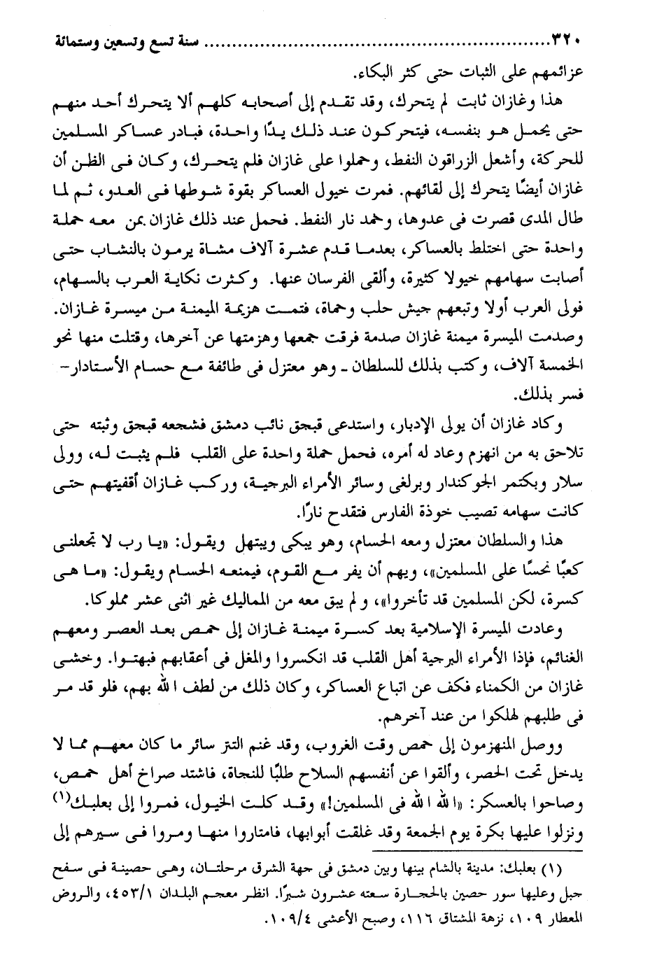 عزائمهم على الثَّبَات حَتَّى كثر الْبكاء. هَذَا وغازان ثَابت لم يَتَحَرَّك وَقد تقدم إِلَى أَصْحَابه كلهم أَلا يَتَحَرَّك أحد مِنْهُم حَتَّى يحمل هُوَ بِنَفسِهِ فيتحركون عِنْد ذَلِك يدا وَاحِدَة فبادر عَسَاكِر الْمُسلمين للحركة وأشعل الزراقون النفط وحملوا على غازان فَلم يَتَحَرَّك وَكَانَ فِي الظَّن أَن غازان أَيْضا يَتَحَرَّك إِلَى لقائهم. فمرت خُيُول العساكر بِقُوَّة شوطها فِي الْعَدو ثمَّ لما طَال المدى قصرت فِي عدوها وخمد نَار النفط. فَحمل عِنْد ذك غازان. بِمن مَعَه حَملَة وَاحِدَة حَتَّى اخْتَلَط بالعساكر بَعْدَمَا قدم عشرَة آلَاف مشَاة يرْمونَ بالنشاب حَتَّى أَصَابَت سِهَامهمْ خيولاً كَثِيرَة وَألقى الفرسان عَنْهَا. وَكَثُرت نكاية الْعَرَب بِالسِّهَامِ فولى الْعَرَب أَولا وتبعهم جَيش حلب وحماة فتمت هزيمَة الميمنة من ميسرَة غازان. وصدمت الميسرة ميمنة غازان صدمة فرقت جمعهَا وهزمتها عَن آخرهَا وَقتلت مِنْهَا نَحْو الْخَمْسَة آلَاف وَكتب بذلك للسُّلْطَان - وَهُوَ معتزل فِي طَائِفَة مَعَ حسام الأستادار - فسر بذلك. وَكَاد غازان أَن يولي الإدبار واستدعى قبجق نَائِب دمشق فشجعه قبجق وثبته حَتَّى تلاحق بِهِ من انهزم وَعَاد لَهُ أمره فَحمل حَملَة وَاحِدَة على الْقلب فَلم يثبت لَهُ وَولى سلار وبكتمر الجوكندار وبرلغى وَسَائِر الْأُمَرَاء البرجية وَركب غازان أقفيتهم حَتَّى كَانَت سهامه تصيب خوذة الْفَارِس فتقدح نَارا. هَذَا وَالسُّلْطَان معتزل وَمَعَهُ الحسام وَهُوَ يبكى ويبتهل وَيَقُول: يَا رب لَا تجعلني كَعْبًا نحساً على الْمُسلمين ويهم أَن يفر مَعَ الْقَوْم فيمنعه الحسام وَيَقُول: مَا هِيَ كسرة لَكِن الْمُسلمين قد تَأَخَّرُوا وَلم يبْق مَعَه من المماليك غير اثنى عشر مَمْلُوكا. وعادت الميسرة الإسلامية بعد كسرة ميمنة غازان إِلَى حمص بعد الْعَصْر وَمَعَهُمْ الْغَنَائِم فَإِذا الْأُمَرَاء البرجية أهل الْقلب قد انكسروا والمغل فِي أَعْقَابهم فَبُهِتُوا. وخشى غازان من الكمناء فَكف عَن اتِّبَاع العساكر وَكَانَ ذَلِك من لطف الله بهم فَلَو قد مر فِي طَلَبهمْ لهلكوا من عِنْد آخِرهم. وَوصل المنهزمون إِلَى حمص وَقت الْغُرُوب وَقد غنم التتر سَائِر مَا كَانَ مَعَهم مِمَّا لَا يدْخل تَحت الْحصْر وألقوا عَن أنفسهم السِّلَاح طلبا للنجاة فَاشْتَدَّ صُرَاخ أهل حمص وصاحوا بالعسكر: الله الله فِي الْمُسلمين وَقد كلت الْخُيُول فَمروا إِلَى بعلبك ونزلوا عَلَيْهَا بكرَة يَوْم الْجُمُعَة وَقد غلقت أَبْوَابهَا فامتاروا مِنْهَا ومروا فِي سيرهم إِلَى