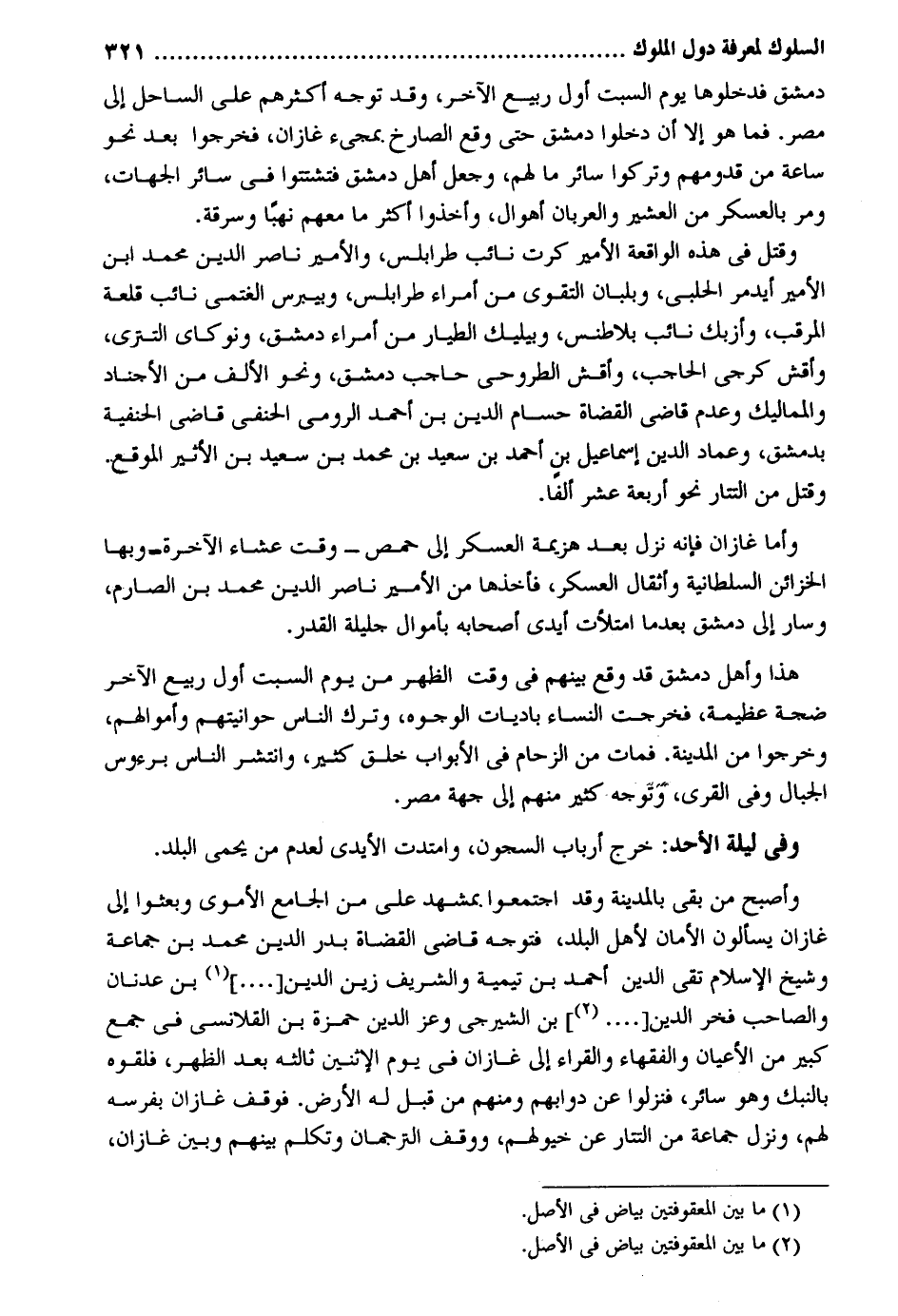 دمشق فَدَخَلُوهَا يَوْم السبت أول ربيع الآخر وَقد توجه أَكْثَرهم على السَّاحِل إِلَى مصر. فَمَا هُوَ إِلَّا أَن دخلُوا دمشق حَتَّى وَقع الصَّارِخ بمجيء غازان فَخَرجُوا بعد نَحْو سَاعَة من قدومهم وَتركُوا سَائِر مَا لَهُم وَجعل أهل دمشق فتشتتوا فِي سَائِر الْجِهَات وَمر بالعسكر من العشير والعربان أهوال وَأخذُوا أَكثر مَا مَعَهم نهباً وسرقة. وَقتل فِي هَذِه الْوَاقِعَة الْأَمِير كرت نَائِب طرابلس والأمير نَاصِر الدّين مُحَمَّد ابْن الْأَمِير أيدمر الْحلَبِي وبلبان التَّقْوَى من أُمَرَاء طرابلس وبيبرس الغتمي نَائِب قلعة المرقب وأزبك نَائِب بلاطنس وبيليك الطيار من أُمَرَاء دمشق ونوكاي التتري وأقش كرجي الْحَاجِب وأقش الطروحي حَاجِب دمشق وَنَحْو الْألف من الأجناد والمماليك وَعدم قَاضِي الْقُضَاة حسام الدّين بن أَحْمد الرُّومِي الْحَنَفِيّ قَاضِي الْحَنَفِيَّة بِدِمَشْق وعماد الدّين إِسْمَاعِيل بن احْمَد بن سعيد بن مُحَمَّد بن سعيد بن الْأَثِير الْموقع. وَقتل من التتار نَحْو أَرْبَعَة عشر ألفا. وَأما غازان فَإِنَّهُ نزل بعد هزيمَة الْعَسْكَر إِلَى حمص - وَقت عشَاء الْآخِرَة - وَبهَا الخزائن السُّلْطَانِيَّة وأثقال الْعَسْكَر فَأَخذهَا من الْأَمِير نَاصِر الدّين مُحَمَّد بن الصارم وَسَار إِلَى دمشق بَعْدَمَا امْتَلَأت أَيدي أَصْحَابه بأموال جليلة الْقدر. هَذَا وَأهل دمشق قد وَقع بَينهم فِي وَقت الظّهْر من يَوْم السبت أول ربيع الآخر ضجة عَظِيمَة فَخرجت النِّسَاء باديات الْوُجُوه وَترك النَّاس حوانيتهم وَأَمْوَالهمْ وَخَرجُوا من الْمَدِينَة. فَمَاتَ من الزحام فِي الْأَبْوَاب خلق كثير وانتش النَّاس برءوس الْجبَال وَفِي الْقرى وَتوجه كثير مِنْهُم إِلَى جِهَة مصر. وَفِي لَيْلَة الْأَحَد: خرج أَرْبَاب السجون وامتدت الْأَيْدِي لعدم من يحمى الْبَلَد. وَأصْبح من بقى بِالْمَدِينَةِ وَقد اجْتَمعُوا بمشهد على من الْجَامِع الْأمَوِي وبعثوا إِلَى غازان يسْأَلُون الْأمان لأهل الْبَلَد فَتوجه قَاضِي الْقُضَاة بدر الدّين مُحَمَّد بن جمَاعَة وَشَيخ الْإِسْلَام تَقِيّ الدّين أَحْمد بن تَيْمِية والشريف زين الدّين بن عدنان والصاحب فَخر الدّين بن الشيرجي وَعز الدّين حَمْزَة بن القلانسي فِي جمع كَبِير من الْأَعْيَان وَالْفُقَهَاء والقراء إِلَى غازان فِي يَوْم الْإِثْنَيْنِ ثالثه بعد الظّهْر فَلَقوهُ بالنبك وَهُوَ سَائِر فنزلوا عَن دوابهم وَمِنْهُم من قبل لَهُ الأَرْض. فَوقف غازان بفرسه لَهُم وَنزل جمَاعَة من التتار عَن خيولهم ووقف الترجمان وَتكلم بَينهم وَبَين غازان
