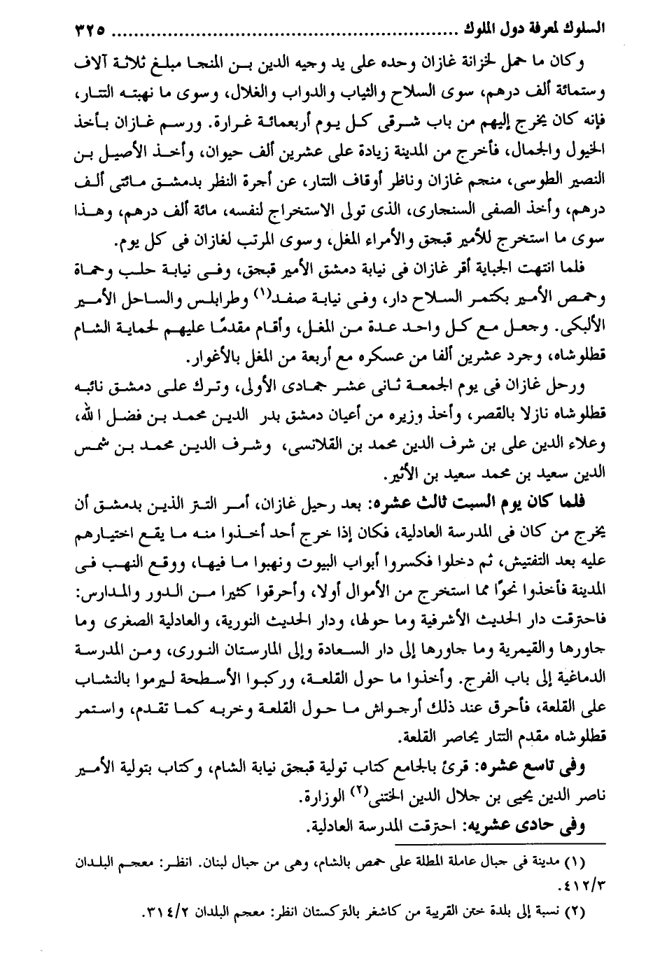 وَكَانَ مَا حمل لخزانة غازان وَحده على يَد وجيه الدّين بن المنجا مبلغ ثَلَاثَة آلَاف وسِتمِائَة ألف دِرْهَم سوى السِّلَاح وَالثيَاب وَالدَّوَاب والغلال وَسوى مَا نهبته التتار فَإِنَّهُ كَانَ يخرج إِلَيْهِم من بَاب شَرْقي كل يَوْم أَرْبَعمِائَة غرارة. ورسم غازان بِأخذ الْخُيُول وَالْجمال فَأخْرج من الْمَدِينَة زِيَادَة على عشْرين ألف حَيَوَان وَأخذ الْأَصِيل بن النصير الطوسي منجم غازان وناظر أوقاف التتار عَن أُجْرَة النّظر بِدِمَشْق مِائَتي ألف دِرْهَم وَأخذ الصفي السنجاري الَّذِي تولى الاستخراج لنَفسِهِ مائَة ألف دِرْهَم وَهَذَا سوى مَا استخرج للأمير قبجق والأمراء الْمغل وَسوى الْمُرَتّب لغازان فِي كل يَوْم. فَلَمَّا انْتَهَت الجباية أقرّ غازان فِي نِيَابَة دمشق الْأَمِير قبجق وَفِي نِيَابَة حلب وحماة وحمص الْأَمِير بكتمر السِّلَاح دَار وَفِي نِيَابَة صفد وطرابلس والساحل الْأَمِير الألبكي. وَجعل مَعَ كل وَاحِد عدَّة من الْمغل وَأقَام مقدما عَلَيْهِم لحماية الشَّام قطلوشاه وجرد عشْرين ألفا من عسكره مَعَ أَرْبَعَة من الْمغل بالأغوار. ورحل غازان فِي يَوْم الْجُمُعَة ثَانِي عشر جُمَادَى الأولى وَترك على دمشق نَائِبه قطلوشاه نازلاً بِالْقصرِ وَأخذ وزيره من أَعْيَان دمشق بدر الدّين مُحَمَّد بن فضل الله وعلاء الدّين على بن شرف الدّين مُحَمَّد بن القلانسي وَشرف الدّين مُحَمَّد بن شمس الدّين سعيد بن مُحَمَّد سعيد بن الْأَثِير. فَلَمَّا كَانَ يَوْم السبت ثَالِث عشره: بعد رحيل غازان أَمر التتر الَّذين بِدِمَشْق أَن يخرج من كَانَ فِي الْمدرسَة العادلية فَكَانَ إِذا خرج أحد أخذُوا مِنْهُ مَا يَقع اختيارهم عَلَيْهِ بعد التفتيش ثمَّ دخلُوا فكسروا أَبْوَاب الْبيُوت ونهبوا مَا فِيهَا وَوَقع النهب فِي الْمَدِينَة فَأخذُوا نَحوا مِمَّا استخرج من الْأَمْوَال أَولا وأحرقوا كثيرا من الدّور والمدارس: فاحترقت دَار الحَدِيث الأشرفية وَمَا حولهَا وَدَار الحَدِيث النورية والعادلية الصُّغْرَى وَمَا جاورها والقيمرية وَمَا جاورها إِلَى دَار السَّعَادَة وَإِلَى المارستان النوري وَمن الْمدرسَة الدماغية إِلَى بَاب الْفرج. وَأخذُوا مَا حول القلعة وركبوا الأسطحة ليرموا بالنشاب على القلعة فَأحرق عِنْد ذَلِك أرجواش مَا حول القلعة وَخَرَّبَهُ كَمَا تقدم وَاسْتمرّ قطلوشاه مقدم التتار يحاصر القلعة. وَفِي تَاسِع عشره: قرئَ بالجامع كتاب تَوْلِيَة قبجق نِيَابَة الشَّام وَكتاب بتولية الْأَمِير نَاصِر الدّين يحيى بن جلال الدّين الختني الوزارة. وَفِي حادي عشريه: احترقت الْمدرسَة العادلية.