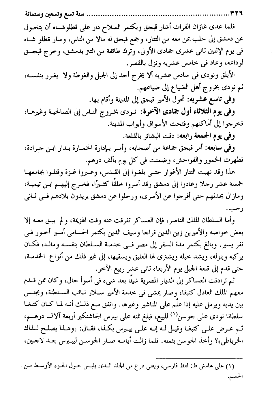 فَلَمَّا عدى غازان الْفُرَات أَشَارَ قبجق وبكتمر السِّلَاح دَار على قطلوشاه أَن يتَحَوَّل عَن دمشق إِلَى حلب بِمن مَعَه من التتار وَجمع قبجق لَهُ مَالا من النَّاس وَسَار قطلوشاه فِي يَوْم الْإِثْنَيْنِ ثَانِي عشرى جُمَادَى الأولى وَترك طَائِفَة من التتر بِدِمَشْق وَخرج قبجق لوداعه وَعَاد فِي خَامِس عشريه وَنزل بِالْقصرِ. الأبلق وَنُودِيَ فِي سادس عشريه أَلا يخرج أحد إِلَى الْجَبَل والغوطة وَلَا يغرر بِنَفسِهِ ثمَّ نُودي بِخُرُوج أهل الضّيَاع إِلَى ضياعهم. وَفِي تَاسِع عشريه: تحول الْأَمِير قبجق إِلَى الْمَدِينَة وَأقَام بهَا. وَفِي يَوْم الثُّلَاثَاء أول جُمَادَى الْآخِرَة: نُودي بِخُرُوج النَّاس إِلَى الصالحية وَغَيرهَا فَخَرجُوا إِلَى أماكنهم وَفتحت الْأَسْوَاق وأبواب الْمَدِينَة. وَفِي يَوْم الْجُمُعَة رابعه: دقَّتْ البشائر بالقلعة. وَفِي سابعه: أَمر قبجق جمَاعَة من أَصْحَابه وَأمر بإدارة الخمارة بدار ابْن جَرَادَة فظهرت الْخُمُور وَالْفَوَاحِش وضمنت فِي كل يَوْم بِأَلف دِرْهَم. هَذَا وَقد نهبت التتار الأغوار حَتَّى بلغُوا إِلَى الْقُدس وعبروا غَزَّة وَقتلُوا بجامعها خَمْسَة عشر رجلا وعادوا إِلَى دمشق وَقد أَسرُّوا خلقا كثيرا فَخرج إِلَيْهِم ابْن تَيْمِية ومازال يُحَدِّثهُمْ حَتَّى أفرجوا عَن الأسرى ورحلوا عَن دمشق يُرِيدُونَ بِلَادهمْ فِي ثَانِي رَجَب. وَأما السُّلْطَان الْملك النَّاصِر فَإِن العساكر تَفَرَّقت عَنهُ وَقت الْهَزِيمَة وَلم يبْق مَعَه إِلَّا بعض خواصه والأميرين زين الدّين قراجا وَسيف الدّين بكتمر الحسامي أَمِير أخور فِي نفر يسير. وَبَالغ بكتمر مُدَّة السّفر إِلَى مصر فِي خدمَة السُّلْطَان بِنَفسِهِ وَمَاله فَكَانَ يركبه وينزله ويشد خيله وَيَشْتَرِي لَهَا العليق ويسقيها إِلَى غير ذَلِك من أَنْوَاع الْخدمَة حَتَّى قدم إِلَى قلعة الْجَبَل يَوْم الْأَرْبَعَاء ثَانِي عشر ربيع الآخر. ثمَّ ترادفت العساكر إِلَى الديار المصرية شَيْئا بعد شَيْء فِي أَسْوَأ حَال وَكَانَ مِمَّن قدم مَعَهم الْملك الْعَادِل كتبغا وَصَارَ يمشي فِي خدمَة الْأَمِير سلار نَائِب السلطة وَيجْلس بَين يَدَيْهِ ويرمل عَلَيْهِ إِذا علم على المناشير وَغَيرهَا. وَاتفقَ مَعَ ذَلِك إِنَّه لما كَانَ كتبغا سُلْطَانا نُودي على جوسن للْبيع فَبلغ ثمنه على بيبرس الجاشنكير أَرْبَعَة آلَاف دِرْهَم ثمَّ عرض على كتبغا وَقيل لَهُ إِنَّه على بيبرس بِكَذَا فَقَالَ: وَهَذَا يصلح لذاك الخرياطي وَأخذ الجوسن بِثمنِهِ. فَلَمَّا زَالَت أَيَّامه صَار الجوسن لبيبرس بعد لاجين
