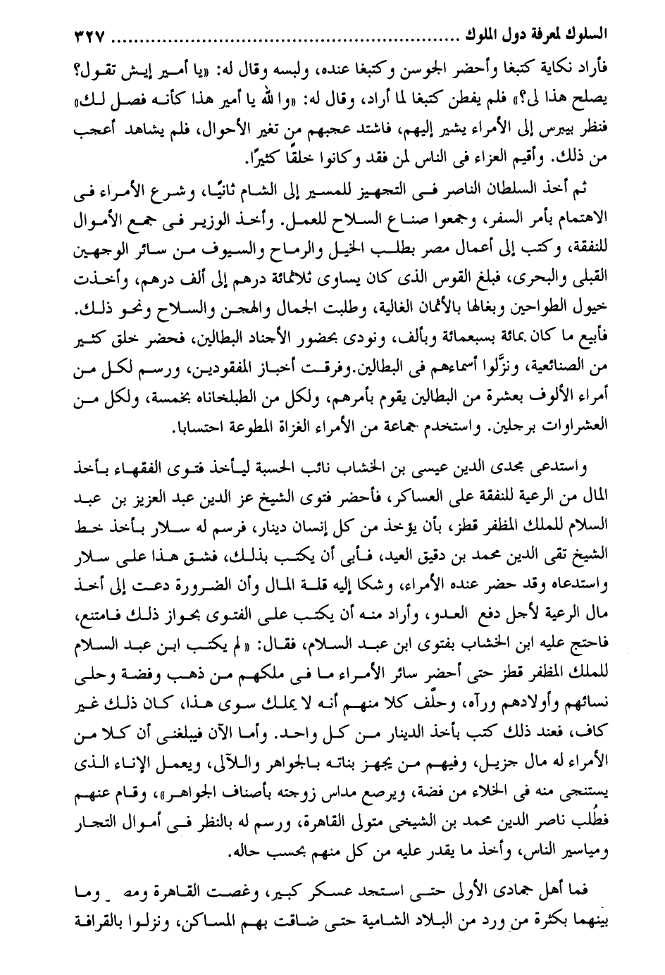 فَأَرَادَ نكاية كتبغا وأحضر الجوسن وكتبغا عِنْده ولبسه وَقَالَ لَهُ: يَا أَمِير إيش تَقول يصلح هَذ لي فَلم يفْطن كتبغا لما أَرَادَ وَقَالَ لَهُ: وَالله يَا أَمِير هَذَا كَأَنَّهُ فصل لَك فَنظر بيبرس إِلَى الْأُمَرَاء يُشِير إِلَيْهِم فَاشْتَدَّ عجبهم من تغير الْأَحْوَال فَلم يُشَاهد أعجب من ذَلِك. وأقيم العزاء فِي النَّاس لمن فقد وَكَانُوا خلقا كثيرا. ثمَّ أَخذ السُّلْطَان النَّاصِر فِي التَّجْهِيز للمسير إِلَى الشَّام ثَانِيًا وَشرع الْأُمَرَاء فِي الاهتمام بِأَمْر السّفر وجمعوا صناع السِّلَاح للْعَمَل. وَأخذ الْوَزير فِي جمع الْأَمْوَال للنَّفَقَة وَكتب إِلَى أَعمال مصر بِطَلَب الْخَيل والرماح وَالسُّيُوف من سَائِر الْوَجْهَيْنِ القبلي والبحري فَبلغ الْقوس الَّذِي كَانَ يُسَاوِي ثَلَاثمِائَة دِرْهَم إِلَى ألف دِرْهَم وَأخذت خُيُول الطواحين وبغالها بالأثمان الغالية وَطلبت الْجمال والهجن وَالسِّلَاح وَنَحْو ذَلِك. فأبيع مَا كَانَ. بِمِائَة بسبعمائة وبألف وَنُودِيَ بِحُضُور الأجناد البطالين فَحَضَرَ خلق كثير من الصنائعية ونزلوا أَسْمَاءَهُم فِي البطالين. وَفرقت أخباز المفقودين ورسم لكل من أُمَرَاء الألوف بِعشْرَة من البطالين يقوم بأمرهم وَلكُل من الطبلخاناه بِخَمْسَة وَلكُل من العشراوات برجلَيْن. واستخدم جمَاعَة من الْأُمَرَاء الْغُزَاة المطوعة احتساباً. واستدعى مجدي الدّين عِيسَى بن الخشاب نَائِب الْحِسْبَة ليَأْخُذ فَتْوَى الْفُقَهَاء بِأخذ المَال من الرّعية للنَّفَقَة على العساكر فأحضر فَتْوَى الشَّيْخ عز الدّين عبد الْعَزِيز بن عبد السَّلَام للْملك المظفر قطز بِأَن يُؤْخَذ من كل إِنْسَان دِينَار فرسم لَهُ سلار بِأخذ خطّ الشَّيْخ تَقِيّ الدّين مُحَمَّد بن دَقِيق الْعِيد فأبي أَن يكْتب بذلك فشق هَذَا على سلار واستدعاه وَقد حضر عِنْده الْأُمَرَاء وشكا إِلَيْهِ قلَّة المَال وَأَن الضَّرُورَة دعت إِلَى أَخذ مَال الرّعية لأجل دفع الْعَدو وَأَرَادَ مِنْهُ أَن يكْتب على الْفَتْوَى بِجَوَاز ذَلِك فَامْتنعَ فاحتج عَلَيْهِ ابْن الخشاب بفتوى ابْن عبد السَّلَام فَقَالَ: لم يكْتب ابْن عبد السَّلَام للْملك المظفر قطز حَتَّى أحضر سَائِر الْأُمَرَاء مَا فِي ملكهم من ذهب وَفِضة وحلي نِسَائِهِم وَأَوْلَادهمْ هم ورأه وَحلف كلا مِنْهُم إِنَّه لَا يملك سوى هَذَا كَانَ ذَلِك غير كَاف فَعِنْدَ ذَلِك كتب بِأخذ الدِّينَار من كل وَاحِد. وَأما الْآن فيبلغني أَن كلا من الْأُمَرَاء لَهُ مَال جزيل وَفِيهِمْ من يُجهز بَنَاته بالجواهر واللآلئ وَيعْمل الْإِنَاء الَّذِي يستنجي مِنْهُ فِي الْخَلَاء من فضَّة ويرصع مداس زَوجته بأصناف الْجَوَاهِر وَقَامَ عَنْهُم فَطلب نَاصِر الدّين مُحَمَّد بن الشيخي مُتَوَلِّي الْقَاهِرَة ورسم لَهُ بِالنّظرِ فِي أَمْوَال التُّجَّار ومياسير النَّاس وَأخذ مَا يقدر عَلَيْهِ من كل مِنْهُم بِحَسب حَاله. فَمَا أهل جُمَادَى الأولى حَتَّى استجد عَسْكَر كَبِير وغصت الْقَاهِرَة ومصر وَمَا بَينهمَا بِكَثْرَة من ورد من الْبِلَاد الشامية حَتَّى ضَاقَتْ بهم المساكن ونزلوا بالقرافة