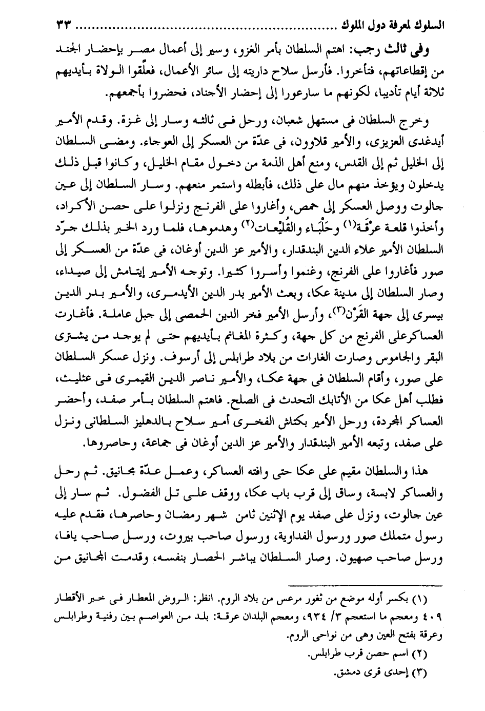 وَفِي ثَالِث رَجَب: اهتم السُّلْطَان بِأَمْر الْغَزْو وسير إِلَى أَعمال مصر بإحضار الْجند من إقطاعاتهم فتأخروا. فَأرْسل سلَاح داريته إِلَى سَائِر الْأَعْمَال فعلقوا الْوُلَاة بِأَيْدِيهِم ثَلَاثَة أَيَّام تأديبا لكَوْنهم مَا سارعورا إِلَى إِحْضَار الأجناد فَحَضَرُوا بأجمعهم. وَخرج السُّلْطَان فِي مستهل شعْبَان ورحل فِي ثالثه وَسَار إِلَى غَزَّة. وَقدم الْأَمِير أيدغدي العزيزي والأمير قلاوون فِي عدَّة من الْعَسْكَر إِلَى العوجاء. وَمضى السُّلْطَان إِلَى الْخَلِيل ثمَّ إِلَى الْقُدس وَمنع أهل الذِّمَّة من دُخُول مقَام الْخَلِيل وَكَانُوا قبل ذَلِك يدْخلُونَ وَيُؤْخَذ مِنْهُم مَال على ذَلِك فأبطله وَاسْتمرّ مَنعهم. وَسَار السُّلْطَان إِلَى عين جالوت وَوصل الْعَسْكَر إِلَى حمص وأغاروا على الفرنج ونزلوا على حصن الأكراد وَأخذُوا قلعة عرقة وحلباء والقليعات وهدموها فَلَمَّا ورد الْخَبَر بذلك جرد السُّلْطَان الْأَمِير عَلَاء الدّين البندقدار والأمير عز الدّين أوغان فِي عدَّة من الْعَسْكَر إِلَى صور فَأَغَارُوا على الفرنج وغنموا وأسروا كثيرا. وَتوجه الْأَمِير إيتامش إِلَى صيداء وَصَارَ السُّلْطَان إِلَى مَدِينَة عكا وَبعث الْأَمِير بدر الدّين الأيدمري والأمير بدر الدّين بيسري إِلَى جِهَة الْقرن وَأرْسل الْأَمِير فَخر الدّين الْحِمصِي إِلَى جبل عاملة. فأغارت العساكر على الفرنج من كل جِهَة وَكَثْرَة الْمَغَانِم بِأَيْدِيهِم حَتَّى لم يُوجد من يَشْتَرِي الْبَقر والجاموس وَصَارَت الغارات من بِلَاد طرابلس إِلَى أرسوف. وَنزل عَسْكَر السُّلْطَان على صور وَأقَام السُّلْطَان فِي جِهَة عكا وَالْأَمر نَاصِر الدّين القيمري فِي عثليث فَطلب أهل عكا من الأتابك التحدث فِي الصُّلْح. فاهتم السُّلْطَان بِأَمْر صفد وأحضر العساكر الْمُجَرَّدَة ورحل الْأَمِير بكتاش الفخري أَمِير سلَاح بالدهليز السلطاني وَنزل على صفد وَتَبعهُ الْأَمِير البندقدار والأمير عز الدّين أوغان فِي جمَاعَة وحاصروها. هَذَا وَالسُّلْطَان مُقيم على عكا حَتَّى وافته العساكر وَعمل عدَّة مجانيق. ثمَّ رَحل والعساكر لابسة وسَاق إِلَى قرب بَاب عكا ووقف على تل الفضول. ثمَّ سَار إِلَى عين جالوت وَنزل على صفد يَوْم الْإِثْنَيْنِ ثامن شهر رَمَضَان وحاصرها فَقدم عَلَيْهِ رَسُول متملك صور ورسل الفداوية وَرَسُول صَاحب بيروت وَرَسُول صَاحب يافا ورسل صَاحب صهيون. وَصَارَ السُّلْطَان يُبَاشر الْحصار بِنَفسِهِ وقدمت المجانيق من