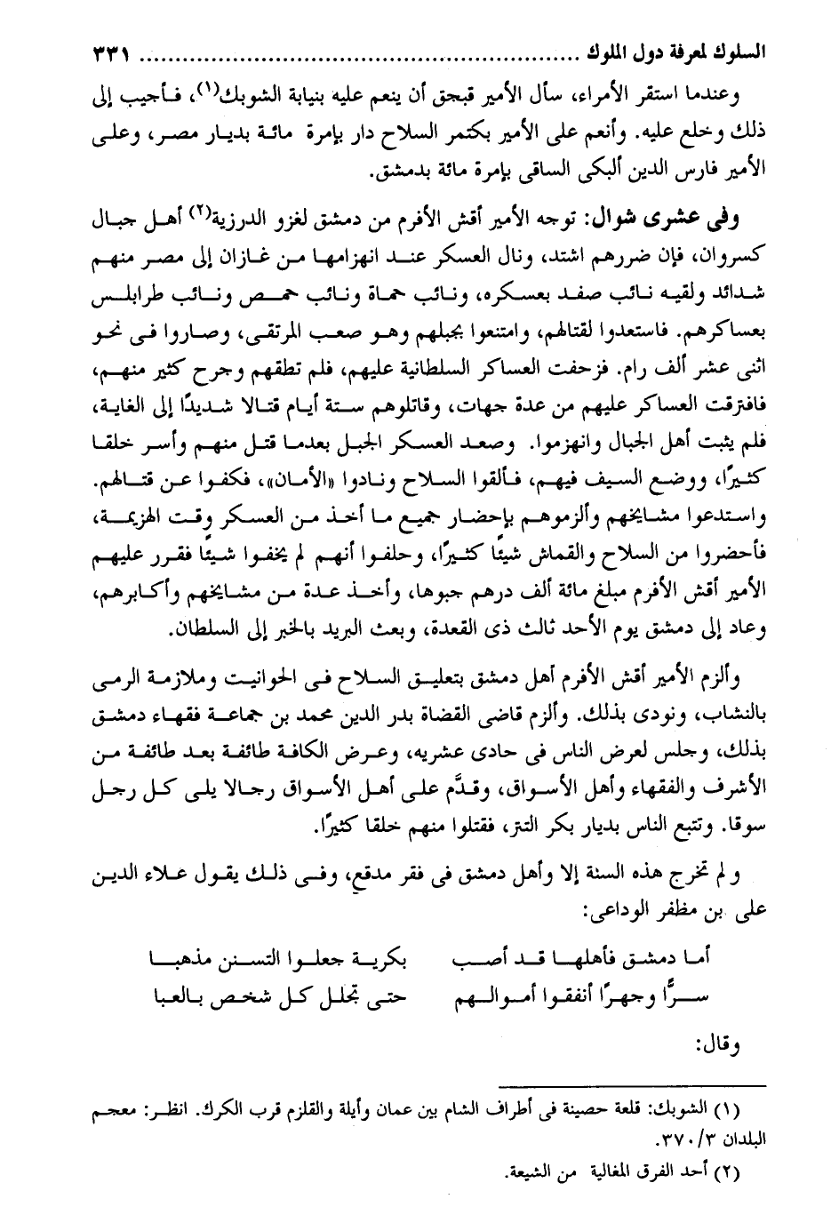 وعندما اسْتَقر الْأُمَرَاء سَأَلَ الْأَمِير قبجق أَن ينعم عَلَيْهِ بنيابة الشوبك فَأُجِيب إِلَى ذَلِك وخلع عَلَيْهِ. وأنعم على الْأَمِير بكتمر السِّلَاح دَار بإمرة مائَة بديار مصر وعَلى الْأَمِير فَارس الدّين ألبكي الساقي بإمرة مائَة بِدِمَشْق. وَفِي عشرى شَوَّال: توجه الْأَمِير أقش الأفرم من دمشق لغزو الدرزية أهل جبال كسروان فَإِن ضررهم اشْتَدَّ ونال الْعَسْكَر عِنْد إنهزامها من غازان إِلَى مصر مِنْهُم شَدَائِد ولقيه نَائِب صفد بعسكره ونائب حماة ونائب حمص ونائب طرابلس بعساكرهم. فَاسْتَعدوا لقتالهم وامتنعوا بجبلهم وَهُوَ صَعب المرتقى وصاروا فِي نَحْو اثْنَي عشر آلف رام. فزحفت العساكر السُّلْطَانِيَّة عَلَيْهِم فَلم تطقهم وجرح كثير مِنْهُم فافترقت العساكر عَلَيْهِم من عدَّة جِهَات وقاتلوهم سِتَّة أَيَّام قتالًا شَدِيدا إِلَى الْغَايَة فَلم يثبت أهل الْجبَال وانهزموا. وَصعد الْعَسْكَر الْجَبَل بَعْدَمَا قتل مِنْهُم وَأسر خلقا كثيرا وَوضع السَّيْف فيهم فالقوا السِّلَاح وَنَادَوْا الْأمان فكفوا عَن قِتَالهمْ. واستدعوا مشايخهم وألزموهم بإحضار جَمِيع مَا أَخذ من الْعَسْكَر وَقت الْهَزِيمَة فأحضروا من السِّلَاح والقماش شَيْئا كثيرا وحلفوا إِنَّهُم لم يخفوا شَيْئا فقرر عَلَيْهِم الْأَمِير أقش الأفرم مبلغ مائَة ألف دِرْهَم جبوها وَأخذ عدَّة من مشايخهم وأكابرهم وَعَاد إِلَى دمشق يَوْم الْأَحَد ثَالِث ذِي الْقعدَة وَبعث الْبَرِيد بالْخبر إِلَى السُّلْطَان. وألزم الْأَمِير أقش الأفرم أهل دمشق بتعليق السِّلَاح فِي الحوانيت وملازمة الرَّمْي بالنشاب وَنُودِيَ بذلك. وألزم قَاضِي الْقُضَاة بدر الدّين مُحَمَّد بن جمَاعَة فُقَهَاء دمشق بذلك وَجلسَ لعرض النَّاس فِي حادي عشريه وَعرض الكافة طَائِفَة بعد طَائِفَة من الْأَشْرَاف وَالْفُقَهَاء وَأهل الْأَسْوَاق وَقدم على أهل الْأَسْوَاق رجَالًا يَلِي كل رجل سوقاً. وتتبع النَّاس بديار بكر التتر فَقتلُوا مِنْهُم وَلم تخرج هَذِه السّنة إِلَّا وَأهل دمشق فِي فقر مدقع وَفِي ذَلِك يَقُول عَلَاء الدّين على ابْن مظفر الوداعي: أما دمشق فأهلها قد أصب بكرية جعلُوا التسنن مذهبا سرا وجهراً أَنْفقُوا أَمْوَالهم حَتَّى تجلل كل شخص بالعبا