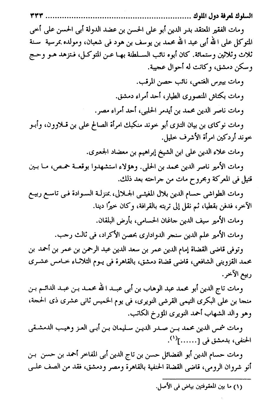 وَمَات الْفَقِير المعتقد بدر الدّين أَبُو على الْحسن بن عضد الدولة أبي الْحسن على أخي المتَوَكل على الله أبي عبد الله مُحَمَّد بن يُوسُف بن هود فِي شعْبَان ومولده بمرسية سنة ثَلَاث وَثَلَاثِينَ وسِتمِائَة كَانَ أَبوهُ نَائِب السلطنة بهَا عَن المتَوَكل فتزهد هُوَ وَحج وَسكن دمشق وَكَانَت لَهُ أَحْوَال عَجِيبَة. وَمَات بيبرس الغتمي نَائِب حصن المرقب. وَمَات بكتاش المنصوري الطيار أحد أُمَرَاء دمشق. وَمَات نَاصِر الدّين مُحَمَّد بن أيدمر الْحلَبِي أحد أُمَرَاء مصر. وَمَات نوكاي بن بَيَان التتري أَبُو خوند منكبك امْرَأَة الصَّالح على بن قلاوون وَأَبُو خوند أردكين امْرَأَة الْأَشْرَف خَلِيل. وَمَات عَلَاء الدّين على ابْن الشَّيْخ إِبْرَاهِيم بن معضاد الجعبري. وَمَات الْأَمِير نَاصِر الدّين مُحَمَّد بن الْحلِيّ. وَهَؤُلَاء اسْتشْهدُوا بوقعة حمص مَا بَين قَتِيل فِي المعركة ومجروح مَاتَ من جراحته بعد ذَلِك. وَمَات الطواشي حسام الدّين بِلَال المغيثي الجلالي. بِمَنْزِلَة السوادة فِي تَاسِع ربيع الآخر فَدفن بقطيا ثمَّ نقل إِلَى تربته بالقرافة وَكَانَ خيرا دينا. وَمَات الْأَمِير سيف الدّين جاغان الحسامي بِأَرْض البلقان. وَتُوفِّي قَاضِي الْقُضَاة إِمَام الدّين عمر بن سعد الدّين عبد الرَّحْمَن بن عمر بن أَحْمد بن مُحَمَّد الْقزْوِينِي الشَّافِعِي قَاضِي قُضَاة دمشق بِالْقَاهِرَةِ فِي يَوْم الثُّلَاثَاء خَامِس عشرى ربيع الآخر. وَمَات تَاج الدّين أَبُو مُحَمَّد عبد الْوَهَّاب بن أبي عبد الله مُحَمَّد بن عبد الدَّائِم بن منجا بن على الْبكْرِيّ التَّيْمِيّ الْقرشِي النويري فِي يَوْم الْخَمِيس ثَانِي عشرى ذِي الْحجَّة وَهُوَ وَالِد الشهَاب أَحْمد النويري المؤرخ الْكَاتِب. وَمَات شمس الدّين مُحَمَّد بن صدر الدّين سُلَيْمَان بن أبي الْعِزّ وهيب الدِّمَشْقِي الْحَنَفِيّ بِدِمَشْق فِي. وَمَات حسام الدّين أَبُو الْفَضَائِل حسن بن تَاج الدّين أبي المفاخر أَحْمد بن حسن بن أَبُو شَرّ وان الرُّومِي قَاضِي الْقُضَاة الْحَنَفِيَّة بِالْقَاهِرَةِ ومصر ودمشق فقد من الصَّفّ على