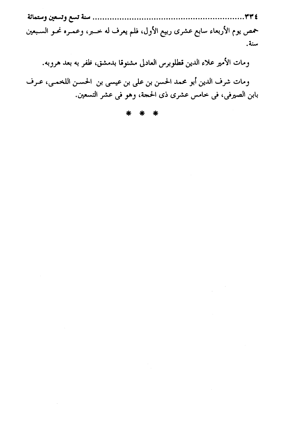 حمص يَوْم الْأَرْبَعَاء سَابِع عشرى ربيع الأول فَلم يعرف لَهُ خبر وعمره نَحْو السّبْعين سنة. وَمَات الْأَمِير عَلَاء الدّين قطلوبرس العادلي مشنوقاً بِدِمَشْق ظفر بِهِ بعد هروبه. وَمَات شرف الدّين أَبُو مُحَمَّد الْحسن بن على بن عِيسَى بن الْحسن اللَّخْمِيّ عرف بِابْن الصَّيْرَفِي فِي خَامِس عشرى ذِي الْحجَّة وَهُوَ فِي عشر التسعين.