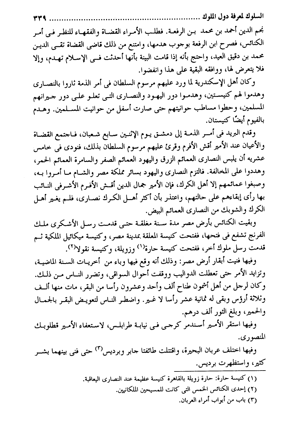 نجم الدّين أَحْمد بن مُحَمَّد بن الرّفْعَة. فَطلب الْأُمَرَاء الْقُضَاة وَالْفُقَهَاء للنَّظَر فِي أَمر الْكَنَائِس فَصرحَ ابْن الرّفْعَة بِوُجُوب هدمها وَامْتنع من ذَلِك قَاضِي الْقُضَاة تَقِيّ الدّين مُحَمَّد بن دَقِيق الْعِيد وَاحْتج بِأَنَّهُ إِذا قَامَت الْبَيِّنَة بِأَنَّهَا أحدثت فِي الْإِسْلَام تهدم وَإِلَّا فَلَا يتَعَرَّض لَهَا وَوَافَقَهُ الْبَقِيَّة على هَذَا وانفضوا. وَكَانَ أهل الْإسْكَنْدَريَّة لما ورد عَلَيْهِم مرسوم السُّلْطَان فِي أَمر الذِّمَّة ثَارُوا بالنصارى وهدموا لَهُم كنيستين وهدموا دور الْيَهُود وَالنَّصَارَى الَّتِي تعلو على دور جيرانهم الْمُسلمين وحطوا مساطب حوانيتهم حَتَّى صَارَت أَسْفَل من حوانيت الْمُسلمين. وَهدم بالفيوم أَيْضا كنيستان. وَقدم الْبَرِيد فِي أَمر الذِّمَّة إِلَى دمشق يَوْم الْإِثْنَيْنِ سَابِع شعْبَان فَاجْتمع الْقُضَاة والأعيان عِنْد الْأَمِير أقش الأفرم وَقُرِئَ عَلَيْهِم مرسوم السُّلْطَان بذلك فَنُوديَ فِي خَامِس عشريه أَن يلبس النَّصَارَى العمائم الزرق وَالْيَهُود العمائم الصفر والسامرة العمائم الْحمر وهددوا على الْمُخَالفَة. فالتزم النَّصَارَى وَالْيَهُود بِسَائِر مملكة مصر وَالشَّام مَا أمروا بِهِ وصبغوا عمائمهم إِلَّا أهل الكرك فَإِن الْأَمِير جمال الدّين أقش الأفرم الأشرفي النَّائِب بهَا رأى إبقاءهم على حالتهم وَاعْتذر بِأَن أَكثر أهل الكرك نَصَارَى فَلم يُغير أهل الكرك والشوبك من النَّصَارَى العمائم الْبيض. وَبقيت الْكَنَائِس بِأَرْض مصر مُدَّة سنة مغلقة حَتَّى قدمت رسل الأشكري ملك الفرنج تشفع فِي فتحهَا ففتحت كَنِيسَة الْمُعَلقَة بِمَدِينَة مصر وكنيسة مِيكَائِيل الملكية ثمَّ قدمت رسل مُلُوك آخر ففتحت كَنِيسَة حارة وزويلة وكنيسة نقولا. وفيهَا فنيت أبقار أَرض مصر: وَذَلِكَ إِنَّه وَقع فِيهَا وباء من أخريات السّنة الْمَاضِيَة وتزايد الْأَمر حَتَّى تعطلت الدواليب ووقفت أَحْوَال السواقي وتضرر النَّاس من ذَلِك. وَكَانَ لرجل من أهل أشمون طناح ألف وَأحد وَعِشْرُونَ رَأْسا من الْبَقر مَاتَ مِنْهَا ألف وَثَلَاثَة أرؤس وَبَقِي لَهُ ثَمَانِيَة عشر رَأْسا لَا غير. واضطر النَّاس لتعويض الْبَقر بالجمال وَالْحمير وَبلغ الثور ألف دِرْهَم. وفيهَا اسْتَقر الْأَمِير أسندمر كرجي فِي نِيَابَة طرابلس لاستعفاء الأميرة قطلوبك المنصوري. وفيهَا اخْتلف عربان الْبحيرَة واقتتلت طائفتا جَابر وبرديس حَتَّى فني بَينهمَا بشر كثير واستظهرت برديس.