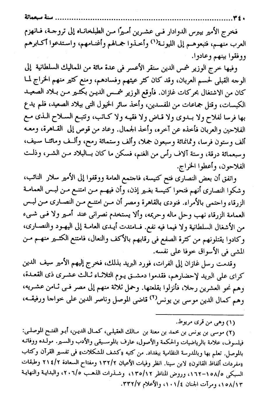 فَخرج الْأَمِير بيبرس الدوادار فِي عشْرين أَمِيرا من الطبلخاناه إِلَى تروجة فَانْهَزَمَ الْعَرَب مِنْهُم فتبعوهم إِلَى الليونة وَأخذُوا جمَالهمْ وأغنامهم واستدعوا أكابرهم ووفقوا بَينهم وعادوا. وفيهَا خرج الْوَزير شمس الدّين سنقر الأعسر فِي عدَّة مائَة من المماليك السُّلْطَانِيَّة إِلَى الْوَجْه القبلي لحسم العربان وَقد كَانَ كثر عيثهم وفسادهم وَمنع كثير مِنْهُم الْخراج لما كَانَ من الِاشْتِغَال بحركات غازان. فأوقع الْوَزير شمس الدّين بِكَثِير من بِلَاد الصَّعِيد الكبسات وَقتل جماعات من المفسدين وَأخذ سَائِر الْخُيُول الَّتِي بِبِلَاد الصَّعِيد فَلم يدع بهَا فرسا لفلاح وَلَا بدوي وَلَا قَاض وَلَا فَقِيه وَلَا كَاتب وتتبع السِّلَاح الَّذِي مَعَ الفلاحين والعربان فَأَخذه عَن آخِره وَأخذ الْجمال. وَعَاد من قوص إِلَى الْقَاهِرَة وَمَعَهُ ألف وَسِتُّونَ فرسا وَثَمَانمِائَة وَسَبْعُونَ جملا وَألف وسِتمِائَة رمح وَألف وَمِائَتَا سيف وَسَبْعمائة درقة وَسِتَّة آلَاف رَأس من الْغنم فسكن مَا كَانَ بالبلاد من الشَّرّ وذلت الفلاحون وأعطوا الْخراج. وَاتفقَ أَن بعض النَّصَارَى فتح كَنِيسَة فَاجْتمع الْعَامَّة ووقفوا إِلَى الْأَمِير سلار النَّائِب وَشَكوا النَّصَارَى أَنهم فتحُوا كَنِيسَة بِغَيْر إِذن وَأَن فيهم من امْتنع من لبس الْعِمَامَة الزَّرْقَاء واحتمى بالأمراء. فَنُوديَ بِالْقَاهِرَةِ ومصر أَن من امْتنع من النَّصَارَى من لبس الْعِمَامَة الزَّرْقَاء نهب وَحل مَاله وحريمه وَألا يستخدم نَصْرَانِيّ عِنْد أَمِير وَلَا فِي شَيْء من الأشغال السُّلْطَانِيَّة وَلَا فِيمَا فِيهِ نفع. فامتدت أَيدي الْعَامَّة إِلَى الْيَهُود وَالنَّصَارَى وكادوا يَقْتُلُونَهُمْ من كَثْرَة الصفع فِي رقابهم بالأكف وَالنعال فَامْتنعَ الْكثير مِنْهُم من الْمُضِيّ فِي الْأَسْوَاق خوفاًُعلى نَفسه. وقدمت رسل غازان إِلَى الْفُرَات فورد الْبَرِيد بذلك فَخرج إِلَيْهِم الْأَمِير سيف الدّين كراي على الْبَرِيد لإحضارهم فقدموا دمشق يَوْم الثلائاء ثَالِث عشرى ذِي الْقعدَة وهم نَحْو الْعشْرين رجلا فأنزلوا بقلعتها. وَحمل ثَلَاثَة مِنْهُم إِلَى مصر فِي ثامن عشريه وهم كَمَال الدّين مُوسَى بن يُونُس قَاضِي الْموصل وناصر الدّين على خواجا ورفيقه