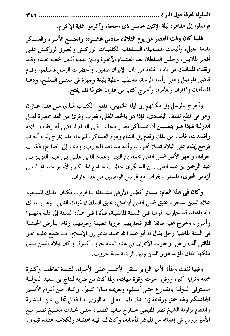 فوصلوا إِلَى الْقَاهِرَة لَيْلَة الْإِثْنَيْنِ خَامِس ذِي الْحجَّة وأكرموا غَايَة الْإِكْرَام. فَلَمَّا كَانَ وَقت الْعَصْر من يَوْم الثُّلَاثَاء سادس عشره: وَاجْتمعَ الْأُمَرَاء والعسكر بقلعة الْجَبَل وألبست المماليك السُّلْطَانِيَّة الكلفيات الزركش والطرز الزركش على أَفْخَر الملابس وَجلسَ السُّلْطَان بعد الْعشَاء الْآخِرَة وَبَين يَدَيْهِ ألف شمعة تعد وَقد وقفت المماليك من بَاب القلعة من بَاب الإيوان صفّين. وأحضرت الرُّسُل فَسَلمُوا وَقَامَ قَاضِي الْموصل وعَلى رَأسه طرحة فَخَطب خطْبَة بليغة وجيزة فِي معنى الصُّلْح ودعا للسُّلْطَان ولغازان وللأمراء وَأخرج كتابا من غازان مَخْتُومًا فَلم يفتح. وَأخرج بالرسل إِلَى مكانهم إِلَى لَيْلَة الْخَمِيس فَفتح الْكتاب الَّذِي من عِنْد غازا وَهُوَ فِي قطع نصف الْبَغْدَادِيّ فَإِذا هُوَ بالخط المغلي فعرب وَقُرِئَ من الْغَد بِحَضْرَة أهل الدولة فَإِذا هُوَ يتَضَمَّن أَن عَسَاكِر مصر دخلت فِي الْعَام الْمَاضِي أَطْرَاف بِلَاده وأفسدت فَأَنف من ذَلِك وَقدم إِلَى الشَّام وَهزمَ العساكر ثمَّ عَاد فَلم يخرج إِلَيْهِ أحد فَرجع إبْقَاء على الْبِلَاد لِئَلَّا تخرب وَأَنه مستعد للحرب ودعا إِلَى الصُّلْح فَكتب جَوَابه وجهز الْأَمِير شمس الدّين مُحَمَّد بن التيتي وعماد الدّين على بن عبد الْعَزِيز بن عبد الرَّحْمَن بن عبد الْعلي بن السكرِي خطب جَامع الْحَاكِم والأمير حسام الدّين أزدمر المجيري للسَّفر بِالْجَوَابِ مَعَ الرُّسُل الواصلين من عِنْد غازان. وَكَانَ هَذَا عَام: سَائِر أقطار الأَرْض مشتغلة بِالْحَرْبِ فَكَانَ الْملك المسعود عَلَاء الدّين سنجر - عَتيق شمس الدّين أيتمش عَتيق السُّلْطَان غياث الدّين - وَهُوَ ملك دله بِالْهِنْدِ قد حَارب قوما فِي السّنة الْمَاضِيَة فَأتوا فِي هَذِه السّنة إِلَى دله ونهبوا وأسروا وَخرج عَلَيْهِ طَائِفَة التتر فحاربهم حروباً عَظِيمَة وَهَزَمَهُمْ. وَقَامَ بِأَرْض الْحَبَشَة فِي السّنة الْمَاضِيَة رجل يُقَال لَهُ أَبُو عبد الله مُحَمَّد يَدْعُو إِلَى الْإِسْلَام فَاجْتمع عَلَيْهِ نَحْو المائتي ألف رجل. وَحَارب الأمحري فِي هَذِه السّنة حروباً كَثِيرَة. وَكَانَ بِبِلَاد الْيمن بَين ملكهَا الْملك الْمُؤَيد هزبر الدّين وَبَين الزيدية عدَّة حروب. وفيهَا ثقلت وَطْأَة الْأَمِير الْوَزير سنقر الأعسر على الْأُمَرَاء لشد تعاظمه وَكثر شمعه وتزايد كبره ووفور حرمته وَقُوَّة مهابته وَلما كَانَ من ضربه للتاج بن سعيد الدولة مُسْتَوْفِي الدولة بالمقارع حَتَّى أسلم وتغريمه مَالا كَبِيرا وَكَانَ من ألزام الْأَمِير الجاشنكير وَفِيه حمق ورقاعة زَائِدَة. فَلَمَّا فعل بِهِ الْوَزير مَا فعل نحلى عَن الْمُبَاشرَة وَانْقطع بزاوية الشَّيْخ نصر المنبجي خَارج بَاب النَّصْر حَتَّى تحدث الشَّيْخ نصر مَعَ الْأَمِير بيبرس فِي إعفائه من الْمُبَاشر فَأَجَابَهُ وَكَانَ لَهُ فِيهِ اعْتِقَاد ولكلامه عِنْده قبُول.