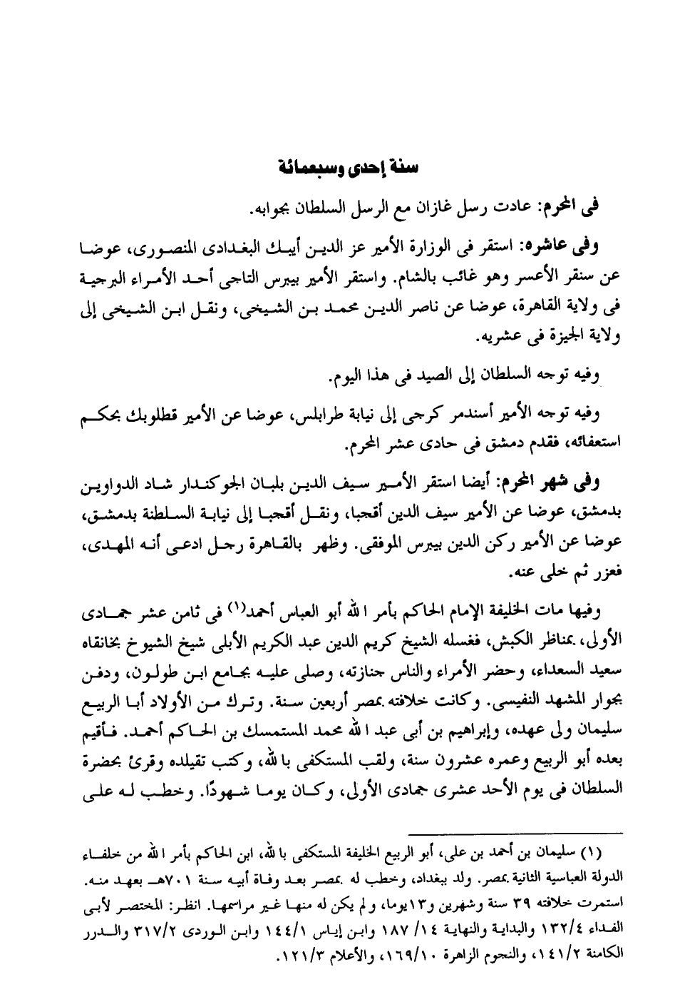 سنة إِحْدَى وَسَبْعمائة فِي الْمحرم: عَادَتْ رسل غازان مَعَ الرُّسُل السُّلْطَان بجوابه. وَفِي عاشره: اسْتَقر فِي الوزارة الْأَمِير عز الدّين أيبك الْبَغْدَادِيّ المنصوري عوضا عَن سنقر الأعسر وَهُوَ غَائِب بِالشَّام. وَاسْتقر الْأَمِير بيبرس التاجي أحد الْأُمَرَاء البرجية فِي ولَايَة الْقَاهِرَة عوضا عَن نَاصِر الدّين مُحَمَّد بن الشيخي وَنقل ابْن الشيخي إِلَى ولَايَة الجيزة فِي عشريه. وَفِيه توجه السُّلْطَان إِلَى الصَّيْد فِي هَذَا الْيَوْم. وَفِيه توجه الْأَمِير أسندمر كرجي إِلَى نِيَابَة طرابلس عوضا عَن الْأَمِير قطلوبك بِحكم استعفائه فَقدم دمشق فِي حادي عشر الْمحرم. وَفِي شهر الْمحرم: أَيْضا اسْتَقر الْأَمِير سيف الدّين بلبان الجوكندار شاد الدَّوَاوِين بِدِمَشْق عوضا عَن الْأَمِير سيف الدّين أقجبا وَنقل أقجبا إِلَى نِيَابَة السلطنة بِدِمَشْق عوضا عَن الْأَمِير ركن الدّين بيبرس الموفقي. وَظهر بِالْقَاهِرَةِ رجل ادّعى أَنه الْمهْدي فعزر ثمَّ خلى عَنهُ. وفيهَا مَاتَ الْخَلِيفَة الإِمَام الْحَاكِم بِأَمْر الله أَبُو الْعَبَّاس أَحْمد فِي ثامن عشر جُمَادَى الأولى. بمناظر الْكَبْش فَغسله الشَّيْخ كريم الدّين عبد الْكَرِيم الأبلي شيخ الشُّيُوخ بخانقاه سعيد السُّعَدَاء وَحضر الْأُمَرَاء وَالنَّاس جنَازَته وَصلى عَلَيْهِ بِجَامِع ابْن طولون وَدفن بجوار المشهد النفيسي. وَكَانَت خِلَافَته بِمصْر أَرْبَعِينَ سنة. وَترك من الْأَوْلَاد أَبَا الرّبيع سُلَيْمَان ولي عَهده وَإِبْرَاهِيم بن أبي عبد الله مُحَمَّد المستمسك بن الْحَاكِم أَحْمد. فأقيم بعده أَبُو الرّبيع وعمره عشرُون سنة ولقب المستكفي بِاللَّه وَكتب تَقْلِيده وَقُرِئَ بِحَضْرَة السُّلْطَان فِي يَوْم الْأَحَد عشرى جُمَادَى الأولى وَكَانَ يَوْمًا مشهوداً. وخطب لَهُ على