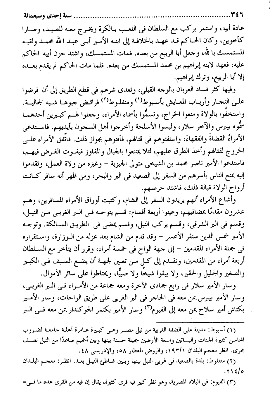 عَادَة أَبِيه وَاسْتمرّ يركب مَعَ السُّلْطَان فِي اللّعب بالكرة وَيخرج مَعَه للصَّيْد وصارا كأخوين وَكَانَ الْحَاكِم قد عهد بالخلافة إِلَى ابْنه الْأَمِير أبي عبد الله مُحَمَّد ولقبه المستمسك بِاللَّه وَجعل أَبَا الرّبيع من بعده. فَمَاتَ المستمسك وَاشْتَدَّ حزن أَبِيه الْحَاكِم عَلَيْهِ فعهد لِابْنِهِ إِبْرَاهِيم بن مُحَمَّد المستمسك من بعده. فَلَمَّا مَاتَ الْحَاكِم لم يقدم بعده إِلَّا أَبَا الرّبيع وَترك إِبْرَاهِيم. وفيهَا كثر فَسَاد العربان بِالْوَجْهِ القبلي وتعدى شرهم فِي قطع الطَّرِيق إِلَى أَن فرضوا على التُّجَّار وأرباب المعايش بأسيوط ومنفلوط فَرَائض جبوها شبه الجمالية. واستخفوا بالولاة وَمنعُوا الْخراج وتسموا بأسماء الْأُمَرَاء وَجعلُوا لَهُم كبيرين أَحدهمَا سموهُ بيبرس وَالْآخر سلار ولبسوا الأسلحة وأخرجوا أهل السجون بِأَيْدِيهِم. فاستدعى االأمراء الْقُضَاة وَالْفُقَهَاء واستفتوهم فِي قِتَالهمْ فأفتوهم بِجَوَاز ذَلِك. فاتفق الْأُمَرَاء على الْخُرُوج لقتالهم وَأخذ الطّرق عَلَيْهِم لِئَلَّا يمتنعوا بالجبال والمفاوز فَيفوت الْغَرَض فيهم فاستدعوا الْأَمِير نَاصِر مُحَمَّد بن الشيخي مُتَوَلِّي الجيزية - وَغَيره من وُلَاة الْعَمَل وتقدموا إِلَيْهِ بِمَنْع النَّاس بأسرهم من السّفر إِلَى وأشاع الْأُمَرَاء إِنَّهُم يُرِيدُونَ السّفر إِلَى الشَّام وكتبت أوراق الْأُمَرَاء الْمُسَافِرين وهم عشرُون مقدما بمضافيهم وعينوا أَرْبَعَة أَقسَام: قسم يتَوَجَّه فِي الْبر الغربي من النّيل وَقسم فِي الْبر الشَّرْقِي وَقسم يركب النّيل وَقسم يمضى فِي الطَّرِيق السالكة. وَتوجه الْأَمِير شمس الدّين سنقر الأعسر - وَقد قدم من الشَّام بعد عَزله من الوزارة واستقراره فِي جملَة الْأُمَرَاء المقدمين - إِلَى جِهَة أَلْوَاح فِي خَمْسَة أُمَرَاء وَقرر أَن يتَأَخَّر مَعَ السُّلْطَان أَرْبَعَة أُمَرَاء من المقدمين وَتقدم إِلَى كل من تعين لجِهَة أَن يضع السَّيْف فِي الْكَبِير وَالصَّغِير والجليل والحقير وَلَا يبقوا شَيخا وَلَا صَبيا ويحتاطوا على سَائِر الْأَمْوَال. وَسَار الْأَمِير سلار فِي رَابِع جُمَادَى الْآخِرَة وَمَعَهُ جمَاعَة من الْأُمَرَاء فِي الْبر الغربي وَسَار الْأَمِير بيبرس بِمن مَعَه فِي الحاجر فِي الْبر الغربي على طَرِيق الواحات وَسَار الْأَمِير بكتاش أَمِير سلَاح بِمن مَعَه إِلَى الفيوم وَسَار الْأَمِير بكتمر الجوكندار بِمن مَعَه فِي الْبر