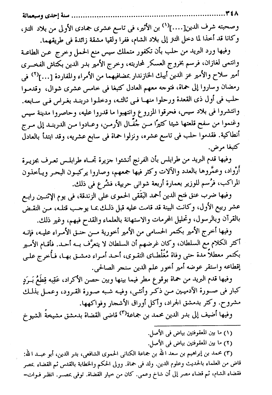 وصحبته شرف الدّين بن الْأَثِير فِي تَاسِع عشرى جُمَادَى الأولى من بِلَاد التتر وَكَانَا قد أخذا لما دخل التتر إِلَى بِلَاد الشَّام ففرا ولقيا مشقة زَائِدَة فِي طريقهما. وفيهَا ورد الْبَرِيد من حلب بِأَن تكفور متملك سيس منع الْحمل وَخرج عَن الطَّاعَة وانتمى لغازان فرسم بِخُرُوج الْعَسْكَر لمحاربته وَخرج الْأَمِير بدر الدّين بكتاش الفخري أَمِير سلَاح والأمير عز الدّين أيبك الخازندار بمضافيهما من الْأُمَرَاء والمفاردة فِي رَمَضَان وَسَارُوا إِلَى حماة فَتوجه مَعَهم الْعَادِل كتبغا فِي خَامِس عشرى شَوَّال وَقدمُوا حلب فِي أول ذِي الْقعدَة ورحلوا مِنْهَا فِي ثالثه ودخلوا دربند بغراس فِي سابعه. وانتشروا فِي بِلَاد سيس فحرقوا المزروع انتهبوا مَا قدرُوا عَلَيْهِ وحاصروا مَدِينَة سيس وغنموا من سفح قلعتها شيثاً كثيرا من جفال الأرمن وعادوا من الدربند إِلَى مرج أنطاكية. فقدموا حلب فِي تَاسِع عشره ونزلوا حماة فِي وفيهَا قدم الْبَرِيد من طرابلس بِأَن الفرنج أنشئوا جَزِيرَة تجاه طرابلس تعرف بجريرة أرواد وعمروها بِالْعدَدِ والآلات وَكثر فِيهَا جمعهم وصاروا يركبون الْبَحْر وَيَأْخُذُونَ المراكب فرسم للوزير بعمارة أَرْبَعَة شواني حربية فشرع فِي ذَلِك. وفيهَا ضرب عنق فتح الدّين أَحْمد البققي الحمري على الزندقة فِي يَوْم الْإِثْنَيْنِ رَابِع عشر ربيع الأول وَكَانَت الْبَيِّنَة قد قَامَت عَلَيْهِ قبل ذَلِك. مِمَّا يُوجب قَتله من النَّقْض بِالْقُرْآنِ وبالرسول وَتَحْلِيل الْمُحرمَات والاستهانة بالعلماء والقدح فيهم وَغير ذَلِك. وفيهَا أخرج الْأَمِير بكتمر الحسامي من الْأَمِير أخورية من حنق الْأُمَرَاء عَلَيْهِ فَإِنَّهُ أَكثر الْكَلَام مَعَ السُّلْطَان وَكَانَ غرضهم أَن السُّلْطَان لَا يتعرف بِهِ أحد. فَأَقَامَ الْأَمِير بكتمر معطلاً مُدَّة حمى وَفَاة مغلطاى التقوي أحد أُمَرَاء دمشق بهَا فَأخْرج على إقطاعه وَاسْتقر عوضه أَمِير أخور علم الدّين سنجر الصَّالِحِي. وفيهَا قدم الْبَرِيد من حماة بِوُقُوع مطر فِيمَا بَينهَا وَبَين حصن الأكراد عقبه قطع برد كبار فِي صُورَة الْآدَمِيّين من ذكر وَأُنْثَى وَفِيه شبه صُورَة القرود وَعمل بذلك مشروح. وَكثر بِدِمَشْق الْجَرَاد وَأكل أوراق الْأَشْجَار وفواكهها. وفيهَا أضيف إِلَى بدر الدّين مُحَمَّد بن جمَاعَة قَاضِي الْقُضَاة بِدِمَشْق مشيخة الشُّيُوخ