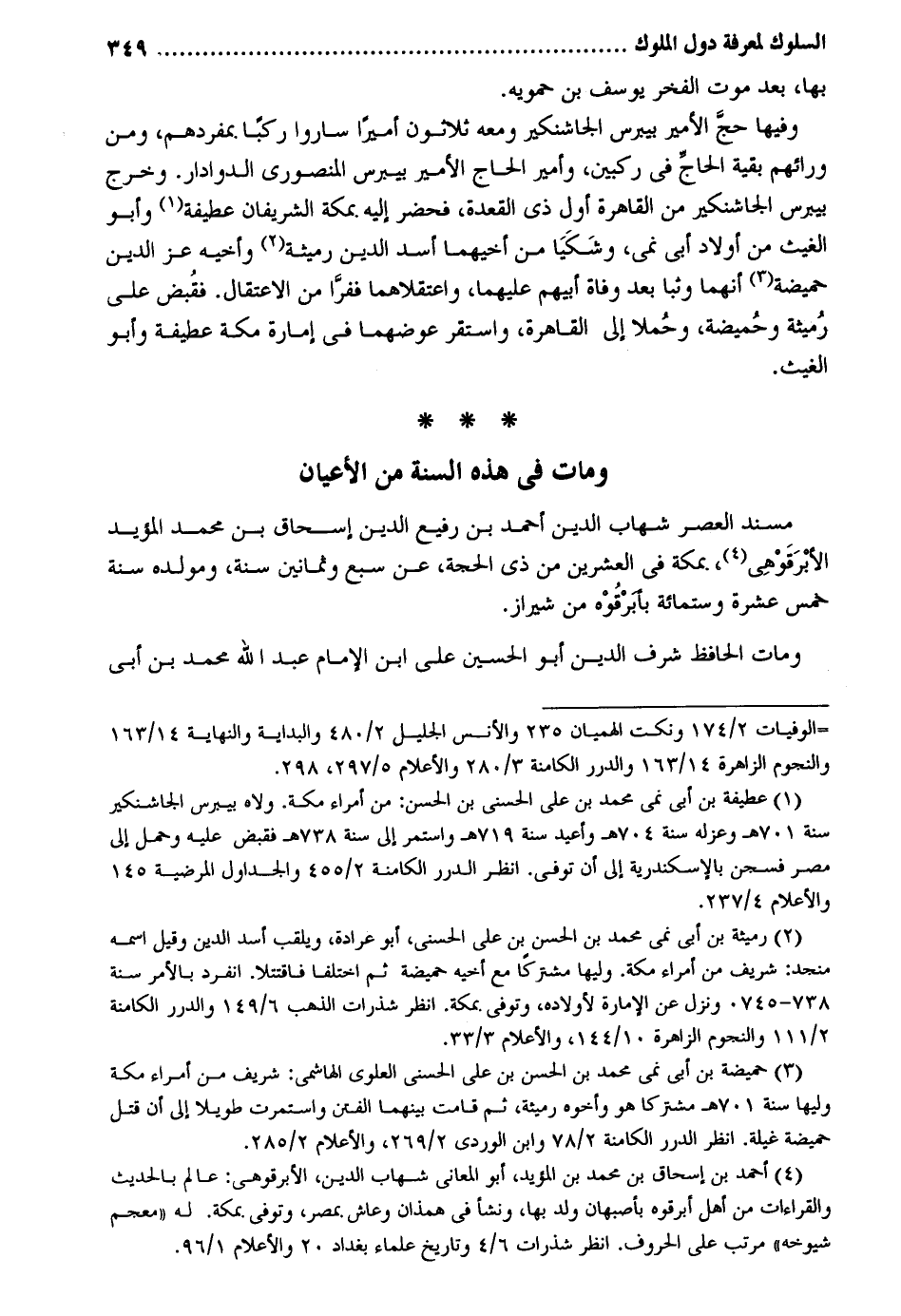 بهَا بعد موت الْفَخر يُوسُف بن حمويه وفيهَا حج الْأَمِير بيبرس الجاشنكير وَمَعَهُ ثَلَاثُونَ أَمِيرا سَارُوا ركباً بمفردهم وَمن ورائهم بَقِيَّة الْحَاج فِي ركبين وأمير الْحَاج الْأَمِير بيبرس المنصوري الدوادار. وَخرج بيبرس الجاشنكير من الْقَاهِرَة أول ذِي الْقعدَة فَحَضَرَ إِلَيْهِ بِمَكَّة الشريفان عطفة وَأَبُو الْغَيْث من أَوْلَاد أبي نمى وشكيا من أخيهما أَسد الدّين رميثة وأخيه عز الدّين حميضة إنَّهُمَا وثبا بعد وَفَاة أَبِيهِم عَلَيْهِمَا واعتقلاهما ففرا من الاعتقال. فَقبض على رميثة وخميضة وحملا إِلَى الْقَاهِرَة وَاسْتقر عوضهما فِي إِمَارَة مَكَّة عطفة وَأَبُو الْغَيْث. وَمَات فِي هَذِه السّنة من الْأَعْيَان مُسْند الْعَصْر شهَاب الدّين أَحْمد بن رفيع الدّين إِسْحَاق بن مُحَمَّد الْمُؤَيد الأبرقوهي بِمَكَّة فِي الْعشْرين من ذِي الْحجَّة عَن سبع وَثَمَانِينَ سنة ومولده سنة خمس عشرَة وسِتمِائَة بأبرقوه من شيراز. وَمَات الْحَافِظ شرف الدّين أَبُو الْحُسَيْن على ابْن الإِمَام عبد الله مُحَمَّد بن أبي