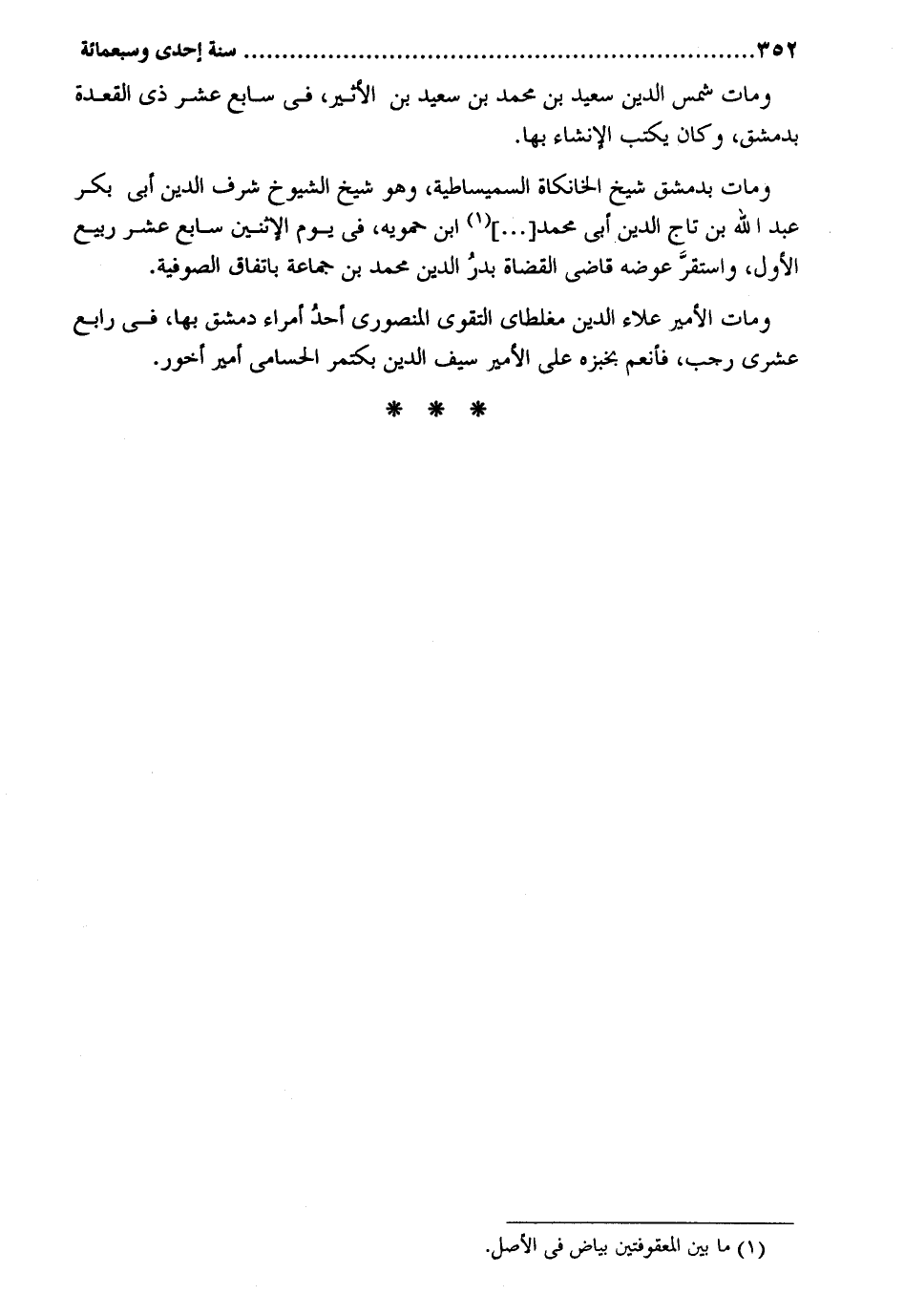 وَمَات شمس الدّين سعيد بن مُحَمَّد بن سعيد بن الْأَثِير فِي سَابِع عشر ذِي الْقعدَة بِدِمَشْق وَكَانَ يكْتب الْإِنْشَاء بهَا. وَمَات بِدِمَشْق شيخ الخانكاة السميساطية وَهُوَ شيخ الشُّيُوخ شرف الدّين أبي بكر عبد الله بن تَاج الدّين أبي مُحَمَّد ابْن حمويه فِي يَوْم الْإِثْنَيْنِ سَابِع عشر ربيع الأول وَاسْتقر عوضه قَاضِي الْقُضَاة بدر الدّين مُحَمَّد بن جمَاعَة بِاتِّفَاق الصُّوفِيَّة. وَمَات الْأَمِير عَلَاء الدّين مغلطاى التقوي المنصوري أحد أُمَرَاء دمشق بهَا فِي رَابِع عشرى رَجَب فانعم بخبزه على الْأَمِير سيف الدّين بكتمر الحسامي أَمِير أخور.
