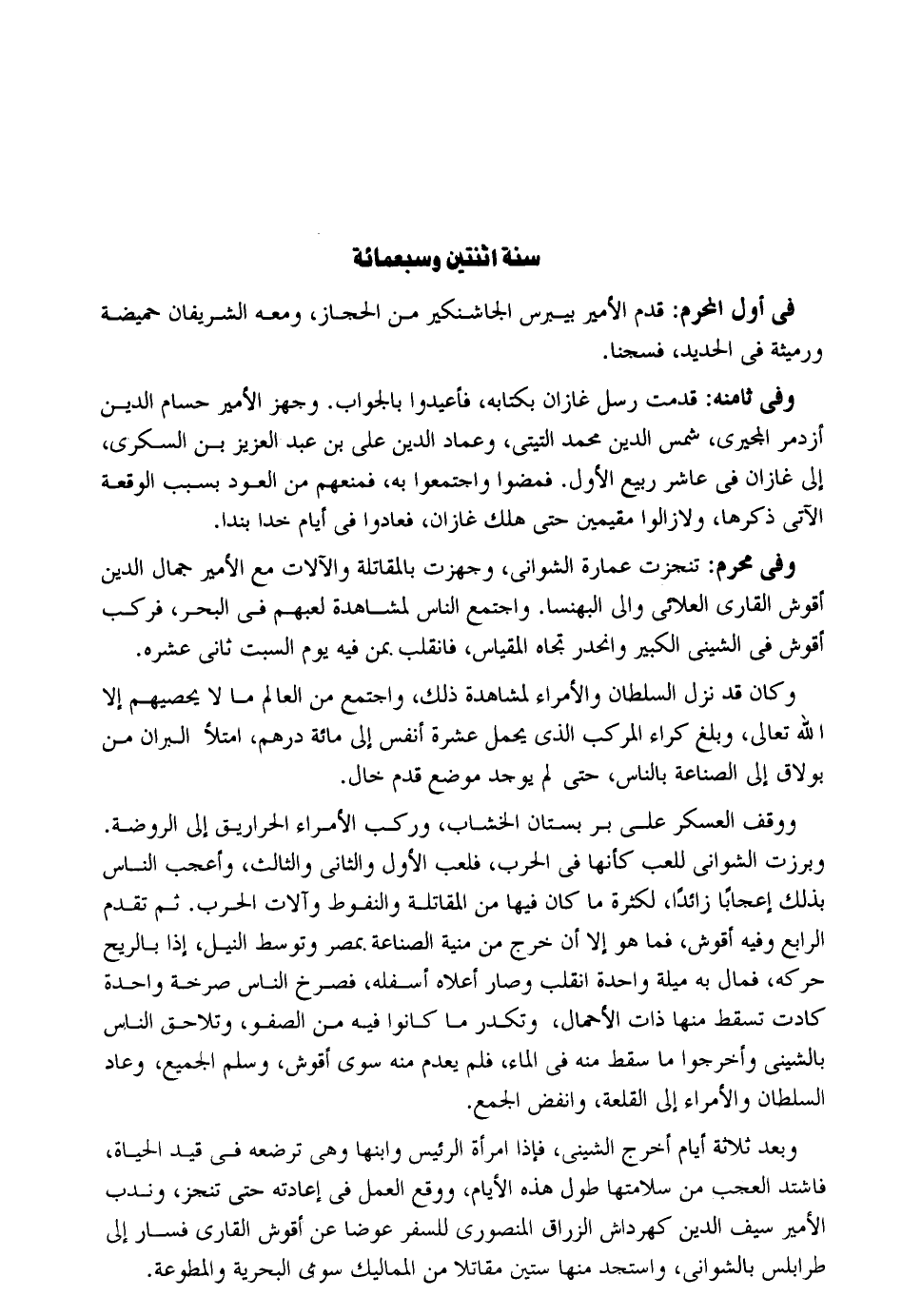 سنة اثْنَتَيْنِ وَسَبْعمائة فِي أول الْمحرم: قدم الْأَمِير بيبرس الجاشنكير من الْحجاز وَمَعَهُ الشريفان حميضة ورميثة فِي الْحَدِيد فسجنا. وَفِي ثامنه: قدمت رسل غازان بكتابه فأعيدوا بِالْجَوَابِ. وجهز الْأَمِير حسام الدّين ازدمر المجيري شمس الدّين مُحَمَّد التيتي وعماد الدّين على بن عبد الْعَزِيز بن السكرِي إِلَى غازان فِي عَاشر ربيع الأول. فَمَضَوْا واجتمعوا بِهِ فَمَنعهُمْ من الْعود بِسَبَب الْوَقْعَة الآتى ذكرهَا ولازالوا مقيمين حَتَّى هلك غازان فعادوا فِي أَيَّام خدا بندا. وَفِي محرم: تنجزت عمَارَة الشواني وجهزت بالمقاتلة والآلات مَعَ الْأَمِير جمال الدّين أقوش الْقَارِي العلائي وَالِي البهنسا. وَاجْتمعَ النَّاس لمشاهدة لعبهم فِي الْبَحْر فَركب أقوش فِي الشينى الْكَبِير وَانْحَدَرَ تجاه المقياس فَانْقَلَبَ مِمَّن فِيهِ يَوْم السبت ثَانِي عشره. وَكَانَ قد نزل السُّلْطَان والأمراء لمشاهدة ذَلِك وَاجْتمعَ من الْعَالم مَا لَا يحصيهم إِلَّا الله تَعَالَى وَبلغ كِرَاء الْمركب الَّذِي يحمل عشرَة أنفس إِلَى مائَة دِرْهَم امْتَلَأَ البران من بولاق إِلَى الصِّنَاعَة بِالنَّاسِ حَتَّى لم يُوجد مَوضِع قدم خَال. ووقف الْعَسْكَر على بر بُسْتَان الخشاب وَركب الْأُمَرَاء الحراريق إِلَى الرَّوْضَة. وبرزت الشواني للعب كَأَنَّهَا فِي الْحَرْب فلعب الأول وَالثَّانِي وَالثَّالِث واعجب النَّاس بذلك إعجاباً زَائِدا لِكَثْرَة مَا كَانَ فِيهَا من الْمُقَاتلَة والنفوط وآلالات الْحَرْب. ثمَّ تقدم الرَّابِع وَفِيه أقوش فَمَا هُوَ إِلَّا أَن خرج من منية الصِّنَاعَة. بِمصْر وتوسط النّيل إِذا بِالرِّيحِ حركه فَمَال بِهِ مَيْلَة وَاحِدَة انْقَلب وَصَارَ أَعْلَاهُ أَسْفَله فَصَرَخَ النَّاس صرخة وَاحِدَة كَادَت تسْقط مِنْهَا ذَات الْأَحْمَال وتكدر مَا كَانُوا فِيهِ من الصفو وتلاحق النَّاس بالشيني وأخرجوا مَا سقط مِنْهُ فِي المَاء فَلم يعْدم مِنْهُ سوى أقوش وَسلم الْجَمِيع وَعَاد السُّلْطَان والأمراء إِلَى القلعة وانفض الْجمع. وَبعد ثَلَاثَة أَيَّام أخرج الشيني فَإِذا امْرَأَة الرئيس وَابْنهَا وَهِي ترْضِعه فِي قيد الْحَيَاة فَاشْتَدَّ الْعجب من سلامتها طول هَذِه الْأَيَّام وَوَقع الْعَمَل فِي إِعَادَته حَتَّى تنجز وَندب الْأَمِير سيف الدّين كهرداش الزراق المنصوري للسَّفر عوضا عَن أقوش الْقَارِي فَسَار إِلَى طرابلس بالشواني واستجد مِنْهَا سِتِّينَ مُقَاتِلًا من المماليك سوى البحرية والمطوعة.