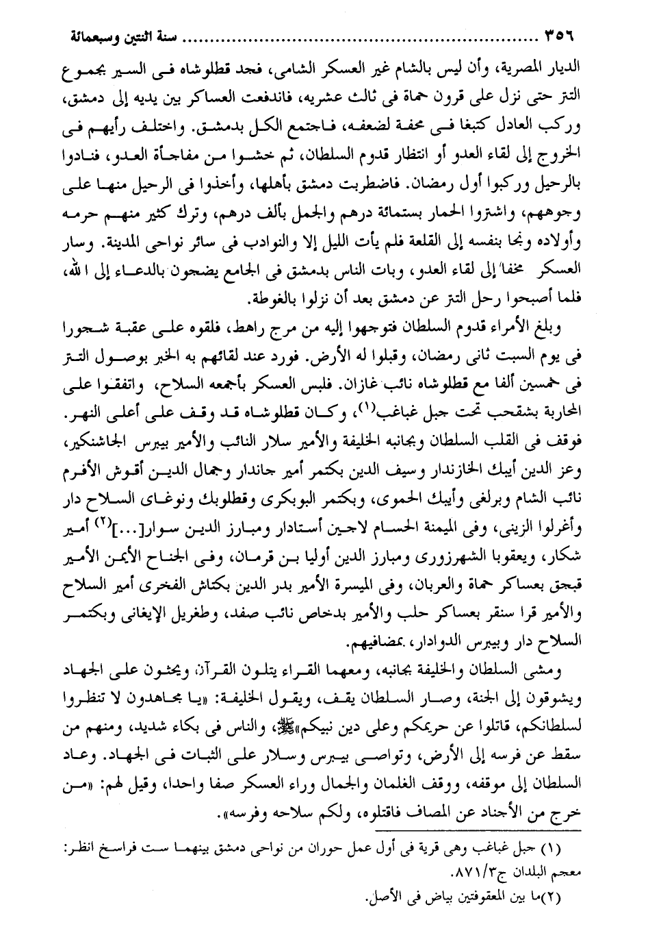 الديار المصرية وَأَن لَيْسَ بِالشَّام غير الْعَسْكَر الشَّامي فجد قطلوشاه فِي السّير بجموع التتر حَتَّى نزل على قُرُون حماة فِي ثَالِث عشريه فاندفعت العساكر بَين يَدَيْهِ إِلَى دمشق وَركب الْعَادِل كتبغا فِي محفة لضَعْفه فَاجْتمع الْكل بِدِمَشْق. وَاخْتلف رَأْيهمْ فِي الْخُرُوج إِلَى لِقَاء الْعَدو أَو انْتِظَار قدوم السُّلْطَان ثمَّ خَشوا من مفاجأة الْعَدو فَنَادوا بالرحيل وركبوا أول رَمَضَان. فاضطربت دمشق بِأَهْلِهَا وَأخذُوا فِي الرحيل مِنْهَا على وُجُوههم واشتروا الْحمار بستمائة دِرْهَم والجمل بِأَلف دِرْهَم وَترك كثير مِنْهُم حرمه وَأَوْلَاده وَنَجَا بِنَفسِهِ إِلَى القلعة فَلم يَأْتِ اللَّيْل إِلَّا والنوادب فِي سَائِر نواحي الْمَدِينَة. وَسَار الْعَسْكَر مخفاً إِلَى لِقَاء الْعَدو وَبَات النَّاس بِدِمَشْق فِي الْجَامِع يضجون بِالدُّعَاءِ إِلَى الله فَلَمَّا أَصْبحُوا رَحل التتر عَن دمشق بعد أَن نزلُوا بالغوطة. وَبلغ الْأُمَرَاء قدوم السُّلْطَان فتوجهوا إِلَيْهِ من مرج راهط فَلَقوهُ على عقبَة شجورا فِي يَوْم السبت ثَانِي رَمَضَان وقبلوا لَهُ الأَرْض. فورد عِنْد لقائهم بِهِ الْخَبَر بوصول التتر فِي خمسين الْفَا مَعَ قطلوشاه نَائِب غازان. فَلبس الْعَسْكَر بأجمعه السِّلَاح وَاتَّفَقُوا على الْمُحَاربَة بشقحب تَحت جبل غباغب وَكَانَ قطلوشاه قد وقف على أَعلَى النَّهر. فَوقف فِي الْقلب السُّلْطَان وبجانبه الْخَلِيفَة والأمير سلار النَّائِب والأمير بيبرس الجاشنكير وَعز الدّين أيبك الخازندار وَسيف الدّين بكتمر أَمِير جاندار وجمال الدّين أقوش الأفرم نَائِب الشَّام وبرلغي وايبك الْحَمَوِيّ وبكتمر البوبكري وقطلوبك ونوغاي السِّلَاح دَار وأغرلوا الزيني وَفِي الميمنة الحسام لاجين أستادار ومبارز الدّين سوار أَمِير شكار ويعقوبا الشهرزوري ومبارز الدّين أوليا بن قرمان وَفِي الْجنَاح الْأَيْمن الْأَمِير قبجق بعساكر حماة والعربان وَفِي الميسرة الْأَمِير بدر الدّين بكتاش الفخري أَمِير السِّلَاح والامير قرا سنفر بعساكر حلب والأمير بدخاص نَائِب صفد وطغريل الإيغاني وبكتمر السِّلَاح دَار وبيبرس الدوادار بمضافيهم. وَمَشى السُّلْطَان والخليفة بجانبه ومعهما الْقُرَّاء يَتلون الْقُرْآن ويحثون على الْجِهَاد ويشوقون إِلَى الْجنَّة وَصَارَ السُّلْطَان يقف وَيَقُول الْخَلِيفَة: يَا مجاهدون لَا تنظروا لسلطانكم قَاتلُوا عَن حريمكم وعَلى دين نَبِيكُم صلى اله عَلَيْهِ وَسلم وَالنَّاس فِي بكاء شَدِيد وَمِنْهُم من سقط عَن فرسه إِلَى الأَرْض وَتوَاصى بيبرس وسلار على الثَّبَات فِي الْجِهَاد. وَعَاد السُّلْطَان إِلَى موقفه ووقف الغلمان وَالْجمال وَرَاء الْعَسْكَر صفا وَاحِدًا وَقيل لَهُم: من خرج من الأجناد عَن المصاف فَاقْتُلُوهُ وَلكم سلاحه وفرسه.