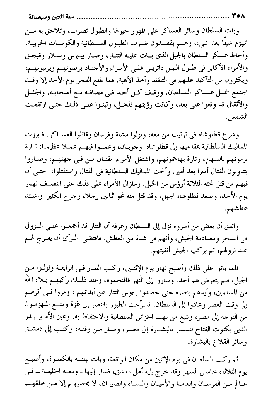 وَبَات السُّلْطَان وَسَائِر العساكر على ظُهُور خيولها والطبول تضرب وتلاحق بِهِ من إنهزم شَيْئا بعد شَيْء وهم يقصدون ضرب الطبول السُّلْطَانِيَّة والكوسات الحربية. وأحاط عَسْكَر السُّلْطَان بِالْجَبَلِ الَّذِي بَات عَلَيْهِ التتار وَصَارَ بيبرس وسلار وقبجق والأمراء الأكابر فِي طول اللَّيْل دائرين على الْأُمَرَاء والأجناد يرصونهم ويرتبونهم ويكثرون من التَّأْكِيد عَلَيْهِم فِي التيقظ وَأخذ الأهبة. فَمَا طلع الْفجْر يَوْم الْأَحَد إِلَّا وَقد اجْتمع كل عَسَاكِر السُّلْطَان ووقف كل أحد فِي مصافه مَعَ أَصْحَابه والجفل والأثقال قد وقفُوا على بعد وَكَانَت رُؤْيَتهمْ تذهل وثبتوا على ذَلِك حَتَّى ارْتَفَعت الشَّمْس. وَشرع قطلوشاه فِي تَرْتِيب من مَعَه ونزلوا مشَاة وفرسان وقاتلوا العساكر. فبرزت المماليك السُّلْطَانِيَّة بمقدميها إِلَى قطلوشاه وجوبان وَعمِلُوا فيهم عملا عَظِيما: تَارَة يرمونهم بِالسِّهَامِ وَتارَة يهاجمونهم واشتغل الْأُمَرَاء بِقِتَال من فِي جهتهم وصاروا يتناولون الْقِتَال أَمِيرا بعد أَمِير. وألحت المماليك السُّلْطَانِيَّة فِي الْقِتَال واستقتلوا حَتَّى أَن فيهم من قتل تَحْتَهُ الثَّلَاثَة أرؤس من الْخَيل. ومازال الْأُمَرَاء على ذَلِك حَتَّى انتصف نَهَار يَوْم الْأَحَد وَصعد قطلوشاه الْجَبَل وَقد قتل مِنْهُ نَحْو ثَمَانِينَ رجلا وجرح الْكثير وَاشْتَدَّ عطشهم. وَاتفقَ أَن بعض من أسروه نزل إِلَى السُّلْطَان وعرفه أَن التتار قد أَجمعُوا على النُّزُول فِي السحر ومصادمة الْجَيْش وَأَنَّهُمْ فِي شدَّة من الْعَطش. فَاقْتضى الرَّأْي أَن يفرج لَهُم عِنْد نزولهم ثمَّ يركب الْجَيْش أقفيتهم. فَلَمَّا باتوا على ذَلِك وَأصْبح نَهَار يَوْم الْإِثْنَيْنِ ركب التتار فِي الرَّابِعَة ونزلوا من الْجَبَل فَلم يتَعَرَّض لَهُم أحد. وَسَارُوا إِلَى النَّهر فاقتحموه وَعند ذَلِك ركبهمْ بلَاء الله من الْمُسلمين وأيدهم بنصره حَتَّى حصدوا رُؤُوس التتار عَن أبدانهم ومروا فِي أَثَرهم إِلَى وَقت الْعَصْر وعادوا إِلَى السُّلْطَان. فسرحت الطُّيُور بالنصر إِلَى غَزَّة وَمنع المنهزمون من التَّوَجُّه إِلَى مصر وتتبع من نهب الخزائن السُّلْطَانِيَّة والاحتفاظ بِهِ. وَعين الْأَمِير بدر الدّين بكتوت الفتاح للمسير بالبشارة إِلَى مصر وَسَار من وقته وَكتب إِلَى دمشق وَسَائِر القلاع بالبشارة. ثمَّ ركب السُّلْطَان فِي يَوْم الْإِثْنَيْنِ من مَكَان الْوَاقِعَة وَبَات ليلته بالكسوة وَأصْبح يَوْم الثلائاء خَامِس الشَّهْر وَقد خرج إِلَيْهِ أهل دمشق فَسَار إِلَيْهَا - وَمَعَهُ الْخَلِيفَة - فِي عَالم من الفرسان والعامة والأعيان وَالنِّسَاء وَالصبيان لَا يحصيهم إِلَّا من خلقهمْ