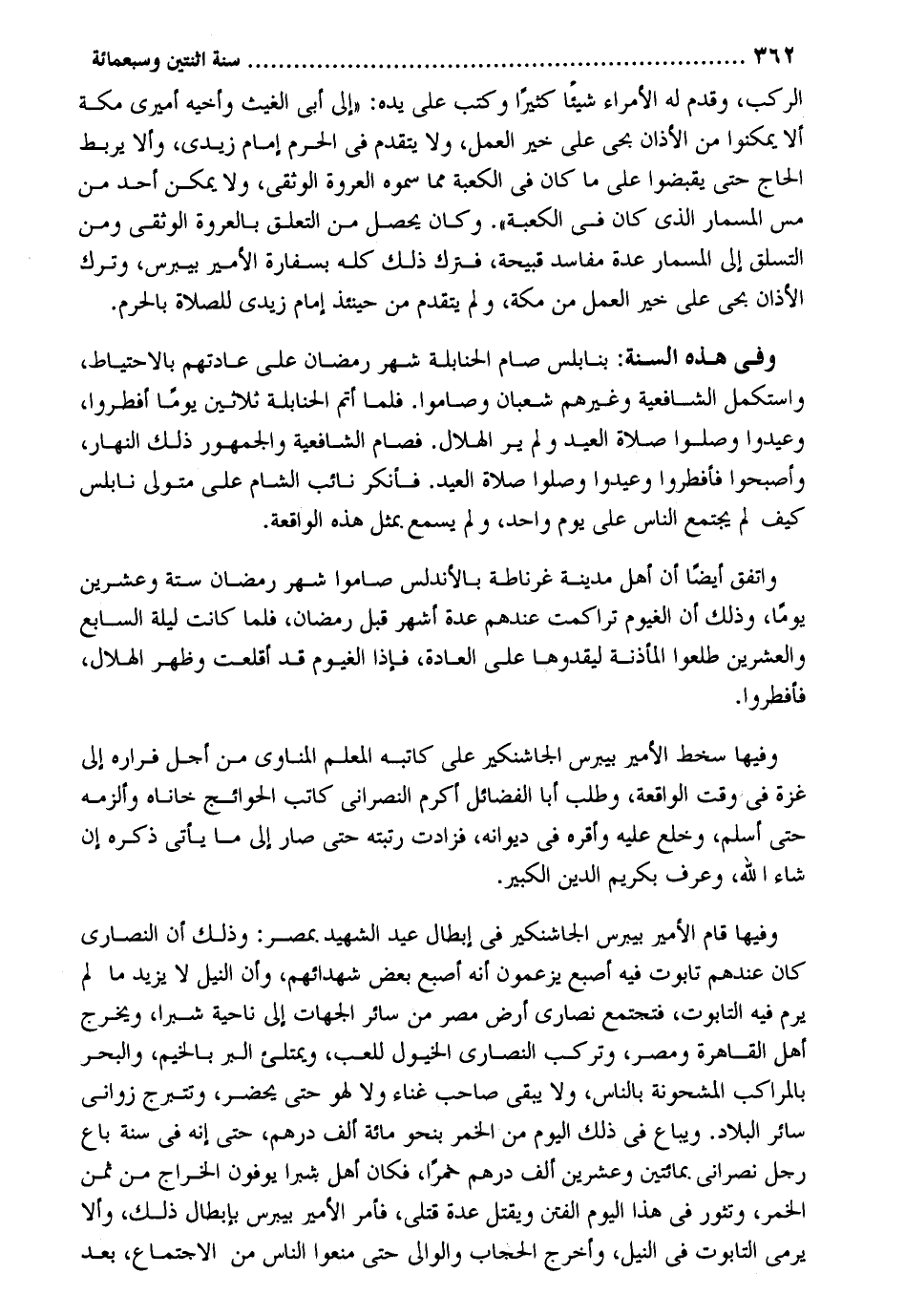 بنابلس صَامَ الْحَنَابِلَة شهر رَمَضَان على عَادَتهم بِالِاحْتِيَاطِ واستكمل الشَّافِعِيَّة وَغَيرهم شعْبَان وصاموا. فَلَمَّا أتم الْحَنَابِلَة ثَلَاثِينَ يَوْمًا أفطروا وعيدوا وصلوا صَلَاة الْعِيد وَلم ير الْهلَال. فصَام الشَّافِعِيَّة وَالْجُمْهُور ذَلِك النَّهَار وَأَصْبحُوا فافطروا وعيدوا وصلوا صَلَاة الْعِيد. فَأنْكر نَائِب الشَّام على مُتَوَلِّي نابلس كَيفَ لم يجْتَمع النَّاس على يَوْم وَاحِد وَلم يسمع. بِمثل هَذِه الْوَاقِعَة. وَاتفقَ أَيْضا أَن أهل مَدِينَة غرناطة بالأندلس صَامُوا شهر رَمَضَان سِتَّة وَعشْرين يَوْمًا وَذَلِكَ أَن الغيوم تراكمت عِنْدهم عدَّة أشهر قبل رَمَضَان فَلَمَّا كَانَت لَيْلَة السَّابِع وَالْعِشْرين طلعوا المأذنة ليقدوها على الْعَادة فَإِذا الغيوم قد أقلعت وَظهر الْهلَال فافطروا. وفيهَا سخط الْأَمِير بيبرس الجاشنكير على كَاتبه الْمعلم الْمَنَاوِيّ من أجل فراره إِلَى غَزَّة فِي وَقت الْوَاقِعَة وَطلب أَبَا الْفَضَائِل أكْرم النَّصْرَانِي كَاتب الْحَوَائِج خاناه وألزمه حَتَّى أسلم وخلع عَلَيْهِ وَأقرهُ فِي ديوانه فزادت رتبته حَتَّى صَار إِلَى مَا يَأْتِي ذكره أَن شَاءَ الله وَعرف بكريم الدّين الْكَبِير. وفيهَا قَامَ الْأَمِير بيبرس الجاشنكير فِي إبِْطَال عيد الشَّهِيد بِمصْر: وَذَلِكَ أَن النَّصَارَى كَانَ عِنْدهم تَابُوت فِيهِ إِصْبَع يَزْعمُونَ إِنَّه أصْبع بعض شهدائهم وَأَن النّيل لَا يزِيد مَا لم يرم فِيهِ التابوت فتجتمع نَصَارَى أَرض مصر من سَائِر الْجِهَات إِلَى نَاحيَة شبْرًا وَيخرج أهل الْقَاهِرَة ومصر وتركب النَّصَارَى الْخُيُول للعب ويمتلي الْبر بالخيم وَالْبَحْر بالمراكب المشحونة بِالنَّاسِ وَلَا يبْقى صَاحب غناء وَلَا لَهو حَتَّى يحضر وتتبرج زواني سَائِر الْبِلَاد. وَيُبَاع فِي ذَلِك الْيَوْم من الْخمر بِنَحْوِ مائَة ألف دِرْهَم حَتَّى إِنَّه فِي سنة بَاعَ رجل نَصْرَانِيّ بمائتين وَعشْرين ألف دِرْهَم خمرًا فَكَانَ أهل شبْرًا يُوفونَ الْخراج من مِمَّن الْخمر وتثور فِي هَذَا الْيَوْم الْفِتَن وَيقتل عدَّة قَتْلَى فَأمر الْأَمِير بيبرس بِإِبْطَال ذَلِك وَألا يرْمى التابوت فِي النّيل وَأخرج الْحجاب وَالْوَلِيّ حَتَّى منعُوا النَّاس من الِاجْتِمَاع بعد