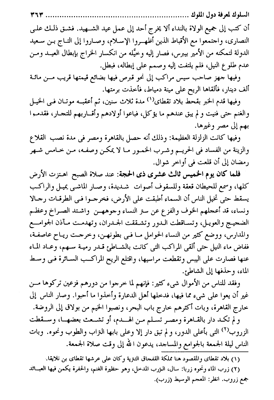 أَن كتب إِلَى جَمِيع الْوُلَاة بالنداء إِلَّا يحرج أحد إِلَى عمل عيد الشَّهِيد. فشق ذَلِك على النَّصَارَى واجتمعوا مَعَ الأقباط الَّذين أظهرُوا الْإِسْلَام وصاروا إِلَى التَّاج بن سعيد الدولة لتمكنه من الْأَمِير بيبرس فَصَارَ إِلَيْهِ وخيله من انكسار الْخراج بِإِبْطَال الْعِيد وَمن عدم طُلُوع النّيل فَلم يلْتَفت إِلَيْهِ وصمم على إِبْطَاله فَبَطل. وفيهَا جهز صَاحب سيس مراكب إِلَى نَحْو قبرص فِيهَا بضائع قيمتهَا قريب من مائَة ألف دِينَار فألقاها الرّيح على مينة دمياط فَأخذت برمتها. وفيهَا قدم الْخَبَر بقحط بِلَاد تقطاي مُدَّة ثَلَاث سِنِين ثمَّ أعقبه موتان فِي الْخَيل وَالْغنم حَتَّى فنيت وَلم يبْق عِنْدهم مَا يُؤْكَل فباعوا أَوْلَادهم وأقاربهم للتجار فقدموا بهم إِلَى مصر وَغَيرهَا. وفيهَا كَانَت الزلزلة الْعَظِيمَة: وَذَلِكَ إِنَّه حصل بِالْقَاهِرَةِ ومصر فِي مُدَّة نصب القلاع والزينة من الْفساد فِي الْحَرِيم وَشرب الْخُمُور مَا لَا يُمكن وَصفه من خَامِس شهر رَمَضَان إِلَى أَن قلعت فِي فَلَمَّا كَانَ يَوْم الْخَمِيس ثَالِث عشرى ذِي الْحجَّة: عِنْد صَلَاة الصُّبْح اهتزت الأَرْض كلهَا وَسمع للحيطان قعقة وللسقوف أصوات شَدِيدَة وَصَارَ الْمَاشِي يمِيل والراكب يسْقط حَتَّى تخيل النَّاس أَن السَّمَاء أطبقت على الأَرْض فَخَرجُوا فِي الطرقات رجَالًا وَنسَاء قد أعجلهم الْخَوْف والفزع عَن ستر النِّسَاء وجوههن وَاشْتَدَّ الصُّرَاخ وَعظم الضجيج والعويل وتساقطت الدّور وتشققت الجدران وتهدمت مأذن الْجَوَامِع والمدارس وَوضع كثير من النِّسَاء الْحَوَامِل مَا فِي بطونهن وخرحت ريَاح عَاصِفَة فَفَاضَ مَاء النّيل حَتَّى ألْقى المراكب الَّتِي كَانَت بالشاطئ قدر رمية سهم وَعَاد المَاء عَنْهَا فَصَارَت على اليبس وتقطعت مراسيها واقتلع الرّيح المراكب السائرة فِي وسط المَاء وحذفها إِلَى الشاطئ. وفقد للنَّاس من الْأَمْوَال شيىء كثير: فَإِنَّهُم لما خَرجُوا من دُورهمْ فزعين تركوها من غير أَن يعوا على شيىء مِمَّا فِيهَا فَدَخلَهَا أهل الدعارة وَأخذُوا مَا أَحبُّوا. وَصَارَ النَّاس إِلَى خَارج الْقَاهِرَة وَبَات أَكْثَرهم خَارج بَاب الْبَحْر ونصبوا الخيم من بولاق إِلَى الرَّوْضَة. وَلم تكد دَار بِالْقَاهِرَةِ ومصر تسلم من الْهدم أَو تشعث بَعْضهَا وَسَقَطت الزروب الَّتِي بِأَعْلَى الدّور وَلم تبْق دَار إِلَّا وعَلى بَابهَا التُّرَاب والطوب وَنَحْوه. وَبَات النَّاس لَيْلَة الْجُمُعَة بالجوامع والمساجد يدعونَ الله إِلَى وَقت صَلَاة الْجُمُعَة.