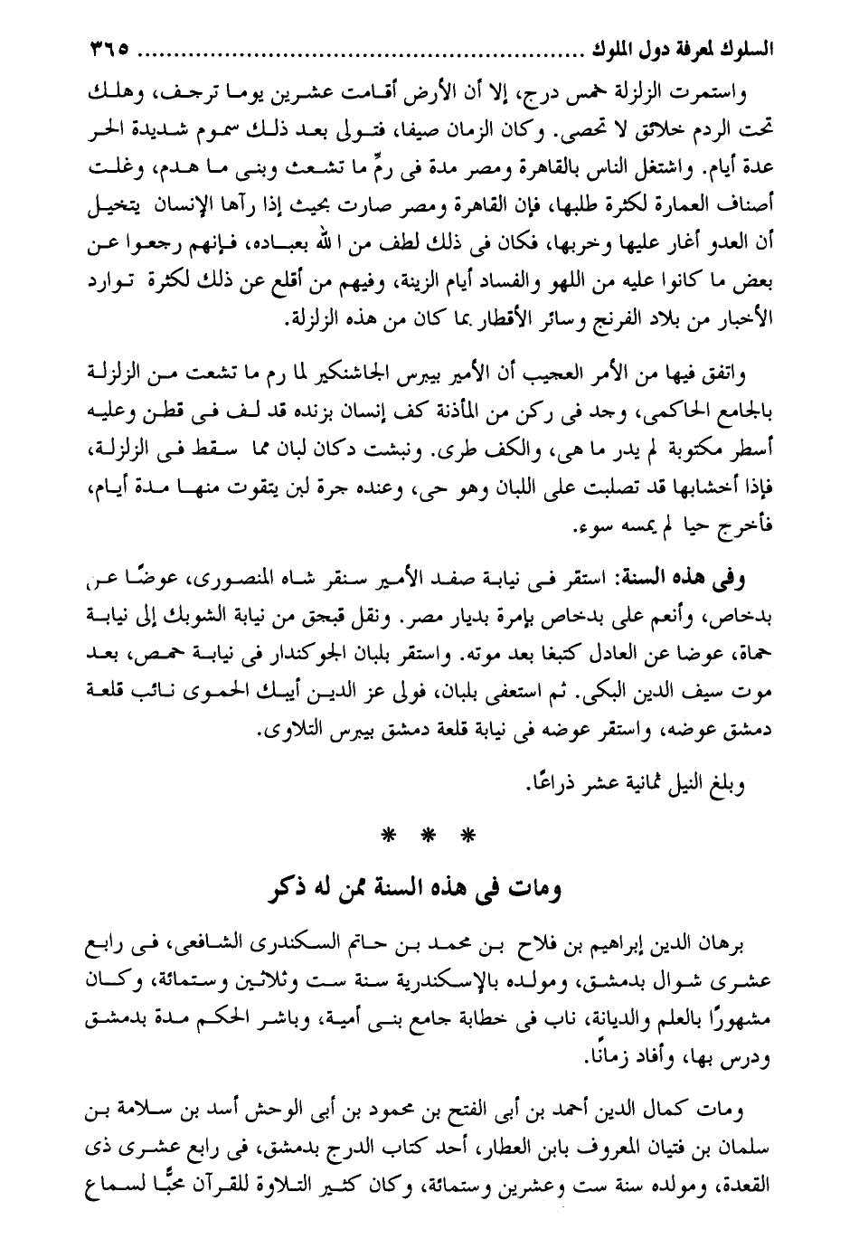 واستمرت الزلزلة خمس درج إِلَّا أَن الأَرْض أَقَامَت عشْرين يَوْمًا ترجف وَهلك تَحت الرَّدْم خلائق لَا تحصى. وَكَانَ الزَّمَان صيفاً فَتَوَلّى بعد ذَلِك سموم شَدِيدَة الْحر عدَّة أَيَّام. واشتغل النَّاس بِالْقَاهِرَةِ ومصر مُدَّة فِي رم مَا تشعث وَبني مَا هدم وغلت أَصْنَاف الْعِمَارَة لِكَثْرَة طلبَهَا فَإِن الْقَاهِرَة ومصر صَارَت بِحَيْثُ إِذا رَآهَا الْإِنْسَان يتخيل أَن الْعَدو أغار عَلَيْهَا وخربها فَكَانَ فِي ذَلِك لطف من الله بعباده فَإِنَّهُم رجعُوا عَن بعض مَا كَانُوا عَلَيْهِ من اللَّهْو وَالْفساد أَيَّام الزِّينَة وَفِيهِمْ من أقلع عَن ذَلِك لِكَثْرَة توارد الْأَخْبَار من بِلَاد الفرنج وَسَائِر الأقطار. مِمَّا كَانَ من هَذِه الزلزلة. وَاتفقَ فِيهَا من الْأَمر العجيب أَن الْأَمِير بيبرس الجاشنكير لما رم مَا تشعت من الزلزلة بالجامع الحاكمي وجد فِي ركن من المأذنة كف إِنْسَان بزنده قد لف فِي قطن وَعَلِيهِ أسطر مَكْتُوبَة لم يدر مَا هِيَ والكف طرى. ونبشت دكان لبان مِمَّا سقط فِي الزلزلة فَإِذا أخشابها قد تصلبت على اللبان وَهُوَ حَيّ وَعِنْده جرة لبن يتقوت مِنْهَا مُدَّة أَيَّام فَأخْرج حَيا لم يمسهُ سوء. وَفِي هده السّنة: اسْتَقر فِي نِيَابَة صفد الْأَمِير سنقر شاه المنصوري عوضا عَن بدخاص وأنعم على بدخاص بإمرة بديار مصر. وَنقل قبجق من نِيَابَة الشوبك إِلَى نِيَابَة حماة عوضا عَن الْعَادِل كتبغا بعد مَوته. وَاسْتقر بلبان الجوكندار فِي نِيَابَة حمص بعد موت سيف الدّين البكي. ثمَّ استعفي بلبان فولى عز الدّين أيبك الْحَمَوِيّ نَائِب قلعة دمشق عوضه وَاسْتقر عوضه فِي نِيَابَة قلعة دمشق بيبرس التلاوي. وَبلغ النّيل ثَمَانِيَة عشر ذِرَاعا. وَمَات فِي هَذِه السّنة مِمَّن لَهُ ذكر برهَان الدّين إِبْرَاهِيم بن فلاح بن مُحَمَّد بن حَاتِم السكندري الشَّافِعِي فِي رَابِع عشرى شَوَّال بِدِمَشْق ومولده بالإسكندرية سنة سِتّ وَثَلَاثِينَ وسِتمِائَة وَكَانَ مَشْهُورا بِالْعلمِ والديانة نَاب فِي خطابة جَامع بنى أُميَّة وباشر الحكم مُدَّة بِدِمَشْق ودرس بهَا وَأفَاد زَمَانا. وَمَات كَمَال الدّين أَحْمد بن أبي الْفَتْح بن مَحْمُود بن أبي الْوَحْش أَسد بن سَلامَة ببن سلمَان بن فتيَان الْمَعْرُوف بِابْن الْعَطَّار أحد كتاب الدرج بِدِمَشْق فِي رَابِع عشرى ذِي الْقعدَة ومولده سنة سِتّ وَعشْرين وسِتمِائَة وَكَانَ كثير التِّلَاوَة لِلْقُرْآنِ محباً لسَمَاع