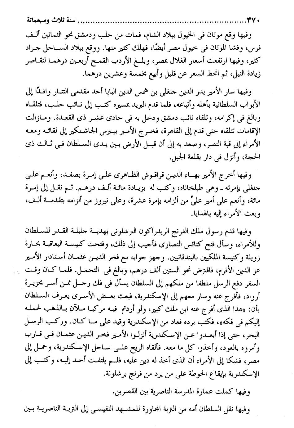 وفيهَا وَقع موتان فِي الْخُيُول بِبِلَاد الشَّام فَمَاتَ من حلب ودمشق نَحْو الثَّمَانِينَ ألف فرس وَفَشَا الموتان فِي خُيُول مصر أَيْضا فَهَلَك كثير مِنْهَا. وَوَقع بِبِلَاد السَّاحِل جَراد كثير وفيهَا ارْتَفَعت أسعار الغلال بِمصْر وَبلغ الأردب الْقَمْح أَرْبَعِينَ درهما لتقاصر زِيَادَة النّيل ثمَّ انحط السّعر عَن قَلِيل وأبيع بِخَمْسَة وَعشْرين درهما. وفيهَا سَار الْأَمِير بدر الدّين جنغلي بن شمس الدّين البابا أحد مقدمي التتار وافداً إِلَى الْأَبْوَاب السُّلْطَانِيَّة بأَهْله وَأَتْبَاعه فَلَمَّا قدم الْبَرِيد بمسيره كتب إِلَى نَائِب حلب فَتَلقاهُ وَبَالغ فِي إكرامه وتلقاه نَائِب دمشق وَدخل بِهِ فِي حادي عشر ذِي الْقعدَة. ومازالت الإقامات تتلقاه حَتَّى قدم إِلَى الْقَاهِرَة فَخرج الْأَمِير بيبرس الجاشنكير إِلَى لِقَائِه وَمَعَهُ الْأُمَرَاء إِلَى قبَّة النَّصْر وَصعد بِهِ إِلَى أَن قبل الأَرْض بَين يَدي السُّلْطَان فِي ثَالِث ذِي الْحجَّة وَأنزل فِي دَار بقلعة الْجَبَل. وفيهَا أخرج الْأَمِير بهاء الدّين قراقوش الظَّاهِرِيّ على إمرة بصفد وأنعم على جنغلي بإمرته - وهى طبلخاناه وَكتب لَهُ بِزِيَادَة مائَة ألف دِرْهَم. ثمَّ نقل إِلَى إمرة مائَة وأنعم على أَمِير على من ألزامه بإمرة عشرَة وعَلى نيروز من ألزامه بتقدمة ألف وَبعث الْأُمَرَاء إِلَيْهِ بالهدايا. وفيهَا قدم رَسُول ملك الفرنج الريدراكون البرشلوني بهدية جليلة الْقدر للسُّلْطَان وللأمراء وَسَأَلَ فتح كنائس النَّصَارَى فَأُجِيب إِلَى ذَلِك وَفتحت كَنِيسَة اليعاقبة بحارة زويلة وكنيسة الملكيين بالبندقانيين. وجهز جَوَابه مَعَ فَخر الدّين عُثْمَان أستادار الْأَمِير عز الدّين الأفرم فاقترض نَحْو السِّتين ألف دِرْهَم وَبَالغ فِي التجمل. فَلَمَّا كَانَ وَقت السّفر دفع الرُّسُل ملطفاً من ملكهم إِلَى السُّلْطَان يسْأَل فِي فك رجل مِمَّن أسر بِجَزِيرَة أرواد فأفرج عَنهُ وَسَار مَعَهم إِلَى الْإسْكَنْدَريَّة فَبعث بعض الأسرى يعرف السُّلْطَان بِأَن: هَذَا الَّذِي أفرج عَنهُ ابْن ملك كَبِير وَلَو أردتم فِيهِ مركبا ملآن بِالذَّهَب لحمله إِلَيْكُم فِي فكه فَكتب برده فَعَاد من الْإسْكَنْدَريَّة وَقيد على مَا كَانَ. وَركب الرُّسُل الْبَحْر حَتَّى إِذا أبعدوا عَن الْإسْكَنْدَريَّة أنزلوا الْأَمِير فَخر الدّين عُثْمَان فِي قَارب وأمروه بِالْعودِ وَأخذُوا كل مَا مَعَه. فَأَلْقَاهُ الرّيح على سَاحل الْإسْكَنْدَريَّة وَحمل إِلَى مصر فَشَكا إِلَى الْأُمَرَاء أَن الَّذِي أَخذ لَهُ دين عَلَيْهِ فَلم يلْتَفت أحد إِلَيْهِ وَكتب إِلَى الْإسْكَنْدَريَّة بإيقاع الحوطة على من يرد من فرنج برشلونة. وفيهَا كملت عمَارَة الْمدرسَة الناصرية بَين القصرين. وفيهَا نقل السُّلْطَان أمه من التربة الْمُجَاورَة للمشهد النفيسي إِلَى التربة الناصرية بَين