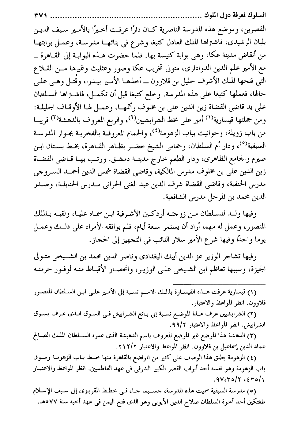 القصرين وَمَوْضِع هَذِه الْمدرسَة الناصرية كَانَ دَارا عرفت أخيراً بالأمير سيف الدّين بلبان الرَّشِيدِيّ فاشتراها الْملك الْعَادِل كتبغا وَشرع فِي بنائها مدرسة وَعمل بوابتها من أنقاض مَدِينَة عكا وهى بوابة كَنِيسَة بهَا. فَلَمَّا حضرت هَذِه البوابة إِلَى الْقَاهِرَة - مَعَ الْأَمِير علم الدّين الدواداري مُتَوَلِّي تخريب عكا وصور وعثليث وَغَيرهَا من القلاع الَّتِي فتحهَا الْملك الْأَشْرَف خَلِيل بن قلاوون - أَخذهَا الْأَمِير بيدرا وَقتل وَهِي على حَالهَا فعملها كتبغا على هَذِه الْمدرسَة. وخلع كتبغا قبل أَن تكمل فاشتراها السُّلْطَان على يَد قَاضِي الْقُضَاة رين الدّين محلى بن مخلوف وأتمها وَعمل لَهَا الْأَوْقَاف الجليلة وَمن جُمْلَتهَا قيسارية أَمِير على بِخَط الشرابشيين وَالرّبع الْمَعْرُوف بالدهشة قَرِيبا من بَاب زويلة وحوانيت بِبَاب الزهومة وَالْحمام الْمَعْرُوفَة بالفخرية بجوار الْمدرسَة السيفية وَدَار أم السُّلْطَان وحمامي الشَّيْخ خضر بِظَاهِر الْقَاهِرَة بِخَط بُسْتَان ابْن صيرم وَالْجَامِع الظافري وَدَار الطّعْم خَارج مَدِينَة دمشق. ورتب بهَا قَاضِي الْقُضَاة زين الدّين على بن مخلوف مدرس الْمَالِكِيَّة وقاضي الْقُضَاة شمس الدّين احْمَد السرُوجِي مدرس الْحَنَفِيَّة وقاضي الْقُضَاة شرف الدّين عبد الْغَنِيّ الْحَرَّانِي مدرس الْحَنَابِلَة وَصدر الدّين مُحَمَّد بن المرحل مدرس الشَّافِعِيَّة. وفيهَا ولد للسُّلْطَان من زَوجته أردكين الأشرفية ابْن على ولقبه بِالْملكِ الْمَنْصُور وَعمل لَهُ مهما أَرَادَ أَن يسْتَمر سَبْعَة أَيَّام فَلم يُوَافقهُ الْأُمَرَاء على ذَلِك وَعمل يَوْمًا وَاحِدًا وفيهَا شرع الْأَمِير سلار النَّائِب فِي التَّجْهِيز إِلَى الْحجاز. وفيهَا تشاجر الْوَزير عز الدّين أيبك الْبَغْدَادِيّ وناصر الدّين مُحَمَّد بن الشيخي مُتَوَلِّي الجيزة وسببها تعاظم ابْن الشيخي على الْوَزير وانحصار الأقباط مِنْهُ لوفور حرمته