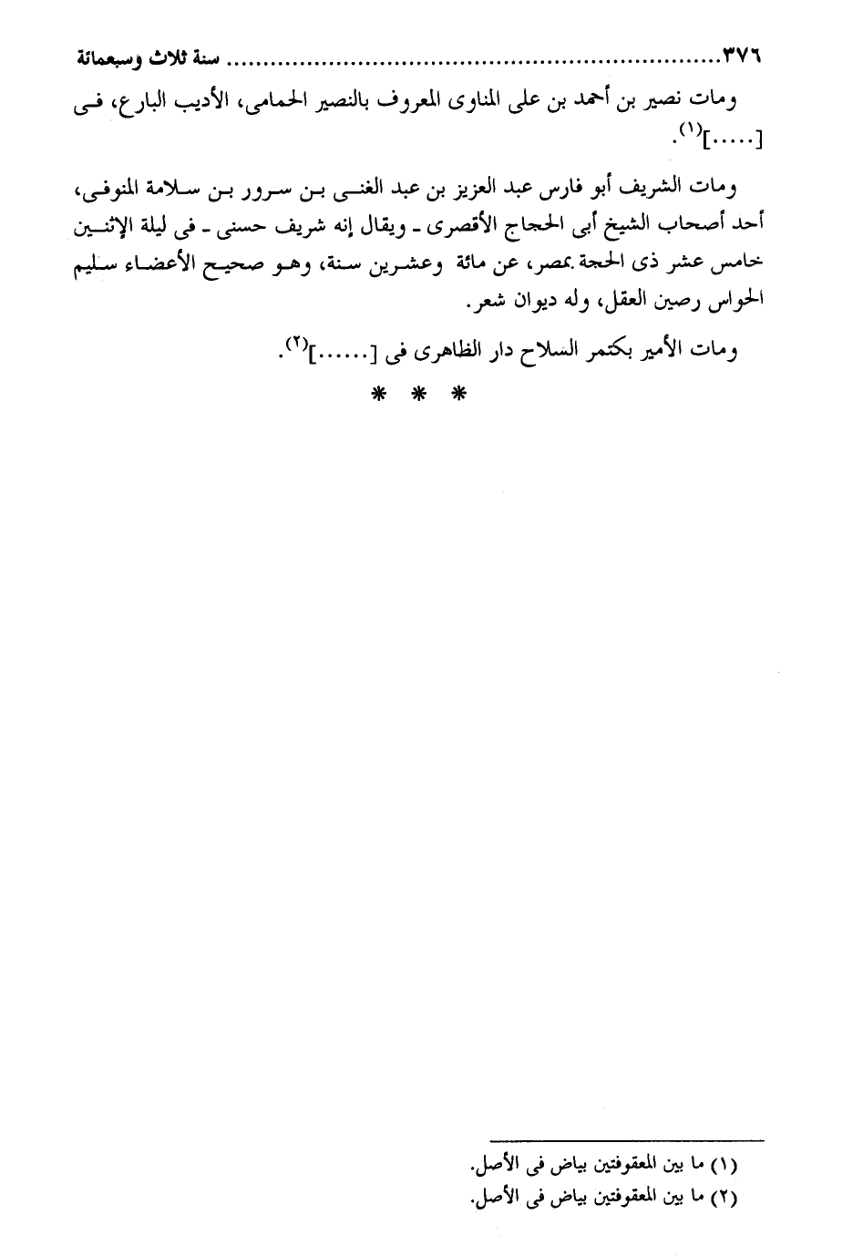 وَمَات نصير بن أَحْمد بن على الْمَنَاوِيّ الْمَعْرُوف بالنصير الحمامي الأديب البارع فِي. وَمَات الشريف أَبُو فَارس عبد الْعَزِيز بن عبد الْغَنِيّ بن سرُور بن سَلامَة المنوفي أحد أَصْحَاب الشَّيْخ أبي الْحجَّاج الأقصري - وَيُقَال إِنَّه شرِيف حسني - فِي لَيْلَة الْإِثْنَيْنِ خَامِس عشر ذِي الْحجَّة بِمصْر عَن مائَة وَعشْرين سنة وَهُوَ صَحِيح الْأَعْضَاء سليم الْحَواس رصين الْعقل وَله ديوَان شعر. وَمَات الْأَمِير بكتمر السِّلَاح دَار الظَّاهِرِيّ فِي. الْجُزْء الثَّانِي