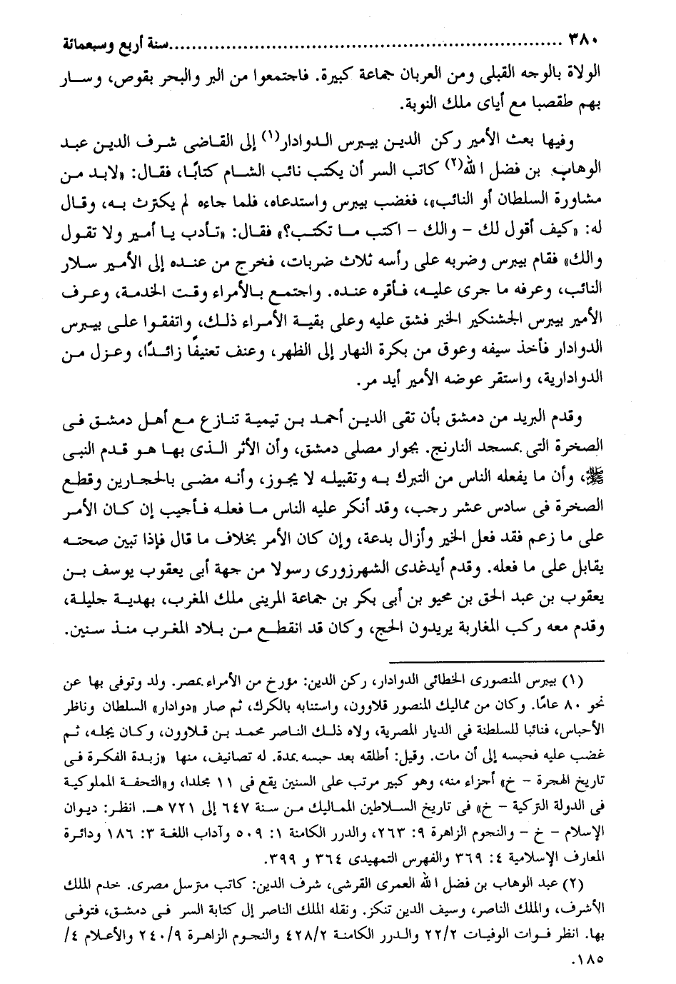 الْوُلَاة بِالْوَجْهِ القبلي وَمن العربان جمَاعَة كَبِيرَة. فَاجْتمعُوا من الْبر وَالْبَحْر بقوص وَسَار بهم طقصبا مَعَ أياي ملك النّوبَة. وفيهَا بعث الْأَمِير ركن الدّين بيبرس الدوادار إِلَى القَاضِي شرف الدّين عبد الْوَهَّاب بن فضل الله كَاتب السِّرّ أَن يكْتب نَائِب الشَّام كتابا فَقَالَ: لابد من مُشَاورَة السُّلْطَان أَو النَّائِب فَغَضب بيبرس واستدعاه فَلَمَّا جَاءَهُ لم يكترث بِهِ وَقَالَ لَهُ: كَيفَ أَقُول لَك - والك - اكْتُبْ مَا تكْتب فَقَالَ: تأدب يَا أَمِير وَلَا تَقول والك فَقَامَ بيبرس وضربه على رَأسه ثَلَاث ضربات فَخرج من عِنْده إِلَى الْأَمِير سلار النَّائِب وعرفه مَا جرى عَلَيْهِ فأقره عِنْده. وَاجْتمعَ بالأمراء وَقت الْخدمَة وَعرف الْأَمِير بيبرس الجاشنكير الْخَبَر فشق عَلَيْهِ وعَلى بَقِيَّة الْأُمَرَاء ذَلِك وَاتَّفَقُوا على بيبرس الدوادار فَأخذ سَيْفه وعوق من بكرَة النَّهَار إِلَى الظّهْر وعنف تعنيفاً زَائِدا وعزل من الدوادارية وَاسْتقر عوضه الْأَمِير أيد مر. وَقدم الْبَرِيد من دمشق بِأَن تَقِيّ الدّين أَحْمد بن تَيْمِية تنَازع مَعَ أهل دمشق فِي الصَّخْرَة الَّتِي بِمَسْجِد النارنج بجوار مصلى دمشق وَأَن الْأَثر الَّذِي بهَا هُوَ قدم النَّبِي صلى الله عَلَيْهِ وَسلم وَأَن مَا يَفْعَله النَّاس من التَّبَرُّك بِهِ وَتَقْبِيله لَا يجوز وَإنَّهُ مضى بالحجارين وَقطع الصَّخْرَة فِي سادس عشر رَجَب وَقد أنكر عَلَيْهِ النَّاس مَا فعله فَأُجِيب إِن كَانَ الْأَمر على مَا زعم فقد فعل الْخَيْر وأزال بِدعَة وان كَانَ الْأَمر بِخِلَاف مَا قَالَ فَإِذا تبين صِحَّته يُقَابل على مَا فعله. وَقدم أيدغدي الشمهرزوري رَسُولا من جِهَة أبي يَعْقُوب يُوسُف بن يَعْقُوب بن عبد الْحق بن محيو بن أبي بكر بن جمَاعَة المريني ملك الْمغرب بهدية جليلة وَقدم مَعَه ركب المغاربة يُرِيدُونَ الْحَج وَكَانَ قد انْقَطع من بِلَاد الْمغرب مُنْذُ سِنِين.