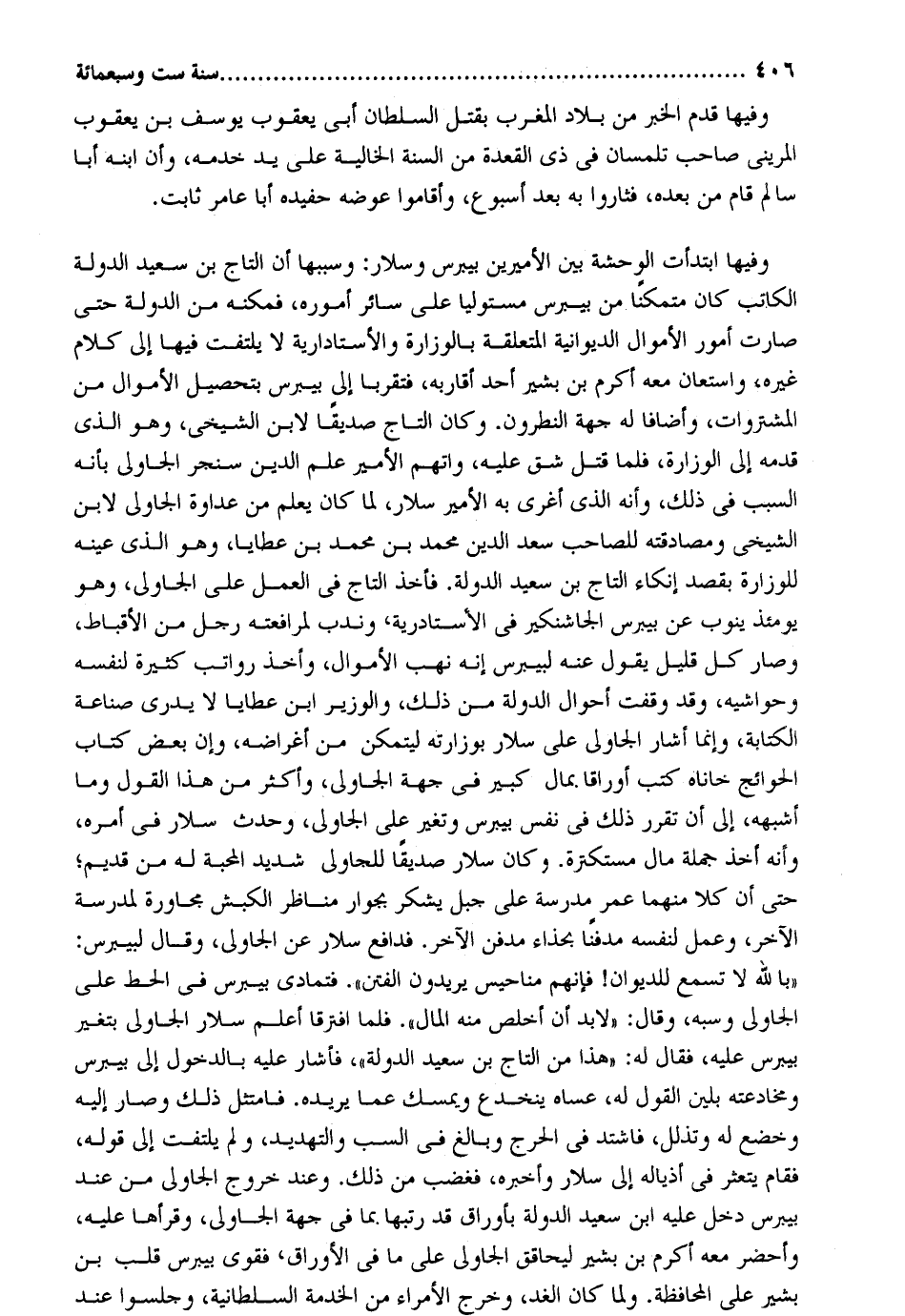 وفيهَا قدم الْخَبَر من بِلَاد الْمغرب بقتل السُّلْطَان أبي يَعْقُوب بوسف بن يَعْقُوب المريني صَاحب تلمسان فِي ذِي الْقعدَة من السّنة الحالية على يَد خدمه وَأَن ابْنه أَبَا سَالم قَامَ من بعده فثاروا بِهِ بعد أُسْبُوع وَأَقَامُوا عوضه حفيده أَبَا عَامر ثَابت. وفيهَا ابتدأت الوحشة بَين الأميرين بيبرس وسلار: وسببها أَن التَّاج بن سعيد الدولة الْكَاتِب كَانَ مُتَمَكنًا من بيبرس مستولياً على سَائِر أُمُوره فمكنه من الدولة حَتَّى صَارَت أُمُور الْأَمْوَال الديوانية الْمُتَعَلّقَة بالوزارة والأستادارية لَا يلْتَفت فِيهَا إِلَى كَلَام غَيره واستعان مَعَه أكْرم بن بشير أحد أَقَاربه فتقربا إِلَى بيبرس بتحصيل الْأَمْوَال من المشتروات وأضافا لَهُ جِهَة النطرون وَكَانَ التَّاج صديقا لِابْنِ الشيخي وَهُوَ الَّذِي قدمه إِلَى الوزارة فَلَمَّا قتل شقّ عَلَيْهِ واتهم الْأَمِير علم الدّين سنجر الجاولي بِأَنَّهُ السَّبَب فِي ذَلِك وَأَنه الَّذِي أغرى بِهِ الْأَمِير سلار لما كَانَ يعلم من عَدَاوَة الجاولي لِابْنِ الشيخي ومصادقته للصاحب سعد الدّين مُحَمَّد بن سعد بن عطايا وَهُوَ الَّذِي عينه للوزارة بِقصد إنكاء التَّاج بن سعيد الدولة. فَأخذ التَّاج فِي الْعَمَل على الجاولي وَهُوَ يَوْمئِذٍ يَنُوب عَن بيبرس الجاشنكير فِي الأستادرية وَندب لمرافقته رجل من الأقباط وَصَارَ كل قَلِيل يَقُول عَنهُ لبيبرس إِنَّه نهب الْأَمْوَال وَأخذ رواتب كَثِيرَة لنَفسِهِ وحواشيه وَمد وقفت أَحْوَال الدولة من ذَلِك والوزير ابْن عطايا لَا يدْرِي صناعَة الْكِتَابَة وَإِنَّمَا أَشَارَ الجاولي على سلار بوزارته ليتَمَكَّن من أغراضه وان بعض كتاب الْحَوَائِج خاناه كتب أوراقاً بِمَال كَبِير فِي جِهَة الجاولي وَأكْثر من هَذَا القَوْل وَمَا أشبهه إِلَى أَن تقرر ذَلِك فِي نفس بيبرس وَتغَير على الجاولي وَحدث سلار فِي أمره وَأَنه أَخذ جملَة مَال مستكترة. وَكَانَ سلار صديقا للجاولي شَدِيد الْمحبَّة لَهُ من قديم حَتَّى أَن كلا مِنْهُمَا عمر مدرسة على جبل يشْكر بجوار مناظر الْكَبْش مجاورة لمدرسة الآخر وَعمل لنَفسِهِ مدفناً بحذاء مدفن الآخر. فدافع سلار عَن الجاولي وَقَالَ لبيبرس: بِاللَّه لَا تسمع للديوان فَإِنَّهُم مناحيس يُرِيدُونَ الْفِتَن. فتمادى بيبرس فِي الْحَط على الجاولي وسبه وَقَالَ: لابد أَن أخْلص مِنْهُ المَال. فَلَمَّا افْتَرقَا أعلم سلار الجاولي بِتَغَيُّر بيبرس عَلَيْهِ فَقَالَ لَهُ: هَذَا من التَّاج بن سعيد الدولة فَأَشَارَ عَلَيْهِ بِالدُّخُولِ إِلَى بيبرس ومخادعته بلين القَوْل لَهُ عساه ينخدع ويمسك عَمَّا يُريدهُ. فامتثل ذَلِك وَصَارَ إِلَيْهِ وخضع لَهُ وتذلل فَاشْتَدَّ فِي الْحَرج وَبَالغ فِي السب والتهديد وَلم يلْتَفت إِلَى قَوْله فَقَامَ يتعثر فِي أذياله إِلَى سلار وَأخْبرهُ فَغَضب من ذَلِك. وَعند خُرُوج الجاولي من عِنْد بيبرس دخل عَلَيْهِ ابْن سعيد الدولة بأوراق قد رتبها. مِمَّا فِي جِهَة الجاولي وَقرأَهَا عَلَيْهِ وأحضر مَعَه أكْرم بن بشير ليحاقق الجاولي على مَا فِي الأوراق فقوى بيبرس قلب بن بشير على الْمُحَافظَة. وَلما كَانَ الْغَد وَخرج الْأُمَرَاء من الْخدمَة السُّلْطَانِيَّة وجلسوا عِنْد