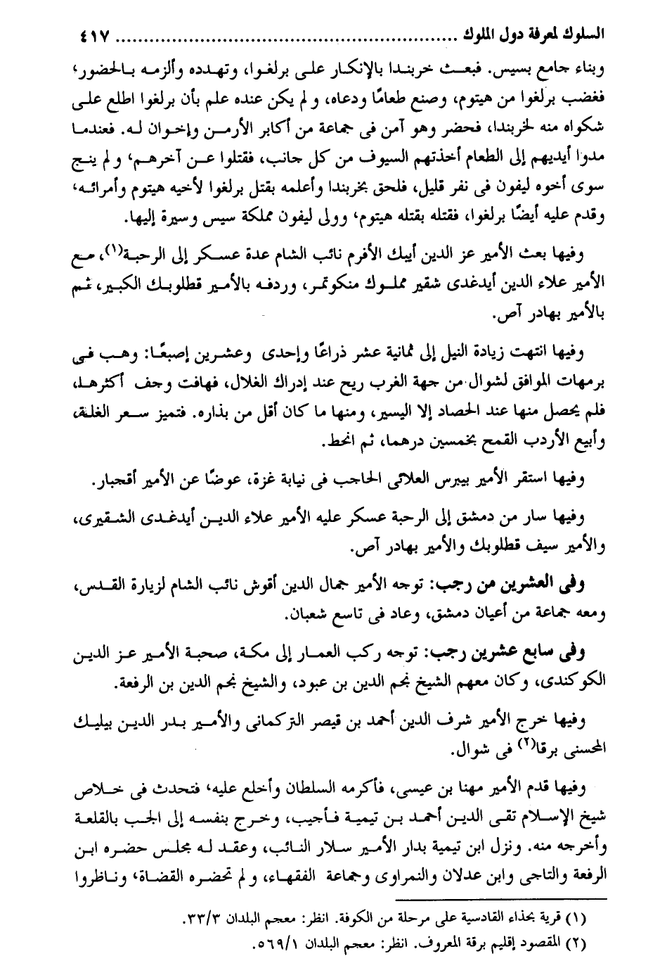 وَبِنَاء جَامع بسيس. فَبعث خربندا بالإنكار على برلغوا وتهدده وألزمه بالحضور فَغَضب برلغوا من هيتوم وصنع طَعَاما وَدعَاهُ وَلم يكن عِنْده علم بِأَن برلغوا اطلع على شكواه مِنْهُ لخربندا فَحَضَرَ وَهُوَ آمن فِي جمَاعَة من أكَابِر الأرمن وإخوان لَهُ. فعندما مدوا أَيْديهم إِلَى الطَّعَام أَخذ تهم السيوف من كل جَانب فَقتلُوا عَن آخِرهم وَلم ينج سوى أَخُوهُ ليفون فِي نفر قَلِيل فلحق بخربندا وأعلمه بقتل برلغوا لِأَخِيهِ هيتوم وأمرائه وَقدم عَلَيْهِ أَيْضا برلغوا فَقتله بقتْله هيتوم وَولى ليفون مملكة سيس وسيرة إِلَيْهَا. وفيهَا بعث الْأَمِير عز الدّين أيبك الأفرم نَائِب الشَّام عدَّة عَسْكَر إِلَى الرحبة مَعَ الْأَمِير عَلَاء الدّين أيدغدي شقير مَمْلُوك منكوتمر وَردفهُ بالأمير قطلوبك الْكَبِير ثمَّ بالأمير بهادر آص. وفيهَا انْتَهَت زِيَادَة النّيل إِلَى ثَمَانِيَة عشر ذِرَاعا وَإِحْدَى وَعشْرين إصبعاُ: وهب فِي برمهات الْمُوَافق لشوال. من جِهَة الغرب ريح عِنْد الحراك الغلال فهافت وجف أَكْثَرهَا فَلم يحصل مِنْهَا عِنْد الْحَصاد إِلَّا الْيَسِير وَمِنْهَا مَا كَانَ أقل من بذاره. فتميز سعر الْغلَّة وأبيع الأردب الْقَمْح بِخَمْسِينَ درهما ثمَّ انحط. وفيهَا اسْتَقر الْأَمِير بيبرس العلائي الْحَاجِب فِي نِيَابَة غَزَّة عوضا عَن الْأَمِير أقجبار. وفيهَا سَار من دمشق إِلَى الرحبة عَسْكَر عَلَيْهِ الْأَمِير عَلَاء الدّين أيدغدي الشقيري والأمير سيف قطلوبك والأمير بهادر أص. وَفِي الْعشْرين من رَجَب: توجه الْأَمِير جمال الدّين أقوش نَائِب الشَّام لزيارة الْقُدس وَمَعَهُ وَفِي سَابِع عشْرين رَجَب: توجه ركب الْعمار إِلَى مَكَّة صُحْبَة الْأَمِير عز الدّين الكوكندي وَكَانَ مَعَهم الشَّيْخ نجم الدّين بن عبود وَالشَّيْخ نجم الدّين بن الرّفْعَة. وفيهَا خرج الْأَمِير شرف الدّين أَحْمد بن قَيْصر التركماني والأمير بدر الدّين بيليك المحسني برقا فِي شَوَّال. وفيهَا قدم الْأَمِير مهنا بن عِيسَى فَأكْرمه السُّلْطَان وأخلع عَلَيْهِ فَتحدث فِي خلاص شيخ الْإِسْلَام تَقِيّ الدّين احْمَد بن تَيْمِية فَأُجِيب وَخرج بِنَفسِهِ إِلَى الْجب بالقلعة وَأخرجه مِنْهُ. وَنزل ابْن تَيْمِية بدار الْأَمِير سلار النَّائِب وَعقد لَهُ مجْلِس حَضَره ابْن الرّفْعَة والتاجي وَابْن عَدْلَانِ والنمراوي وَجَمَاعَة الْفُقَهَاء وَلم تحضره الْقُضَاة وناظروا