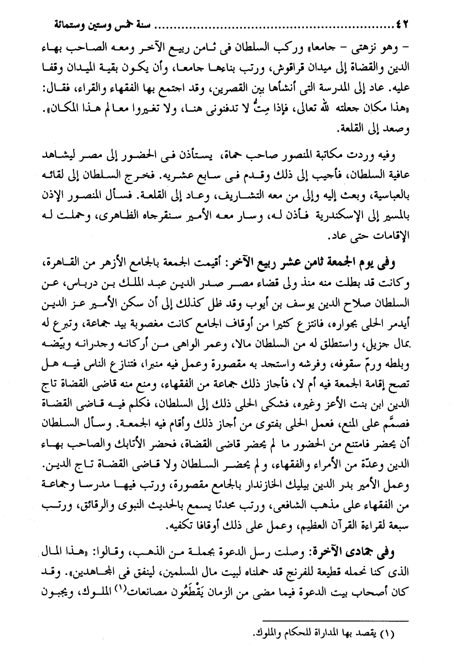 وَهُوَ نزهتي جَامع وَركب السُّلْطَان فِي ثامن ربيع الآخر وَمَعَهُ الصاحب بهاء الدّين والقضاة إِلَى ميدان قراقوش ورتب بناءها جَامعا وَأَن يكون بَقِيَّة الميدان وَقفا عَلَيْهِ. عَاد إِلَى الْمدرسَة الَّتِي أَنْشَأَهَا بَين القصرين وَقد اجْتمع بهَا الْفُقَهَاء والقراء فَقَالَ: هَذَا مَكَان جعلته لله تَعَالَى فَإِذا مت لَا تدفنوني هُنَا وَلَا تغيرُوا معالم هَذَا الْمَكَان. وَصعد إِلَى القلعة. وَفِيه وَردت مُكَاتبَة الْمَنْصُور صَاحب حماة يسْتَأْذن فِي الْحُضُور إِلَى مصر ليشاهد عَافِيَة السُّلْطَان فَأُجِيب إِلَى ذَلِك وَقدم فِي سَابِع عشريه. فَخرج السُّلْطَان إِلَى لِقَائِه بالعباسية وَبعث إِلَيْهِ وَإِلَى من مَعَه التشاريف وَعَاد إِلَى القلعة. فَسَأَلَ الْمَنْصُور الْإِذْن بِالْمَسِيرِ إِلَى الْإسْكَنْدَريَّة فَأذن لَهُ وَسَار مَعَه الْأَمِير سنقرجاه الظَّاهِرِيّ وحملت لَهُ الإقامات حَتَّى عَاد. وَفِي يَوْم الْجُمُعَة ثامن عشر ربيع الآخر: أُقِيمَت الْجُمُعَة بالجامع الْأَزْهَر من الْقَاهِرَة وَكَانَت قد بطلت مِنْهُ مُنْذُ ولي قَضَاء مصر صدر الدّين عبد الْملك بن درباس عَن السُّلْطَان صَلَاح الدّين يُوسُف بن أَيُّوب وَقد ظلّ كَذَلِك إِلَى أَن سكن الْأَمِير عز الدّين أيدمر الْحلِيّ بجواره فَانْتزع كثيرا من أوقاف الْجَامِع كَانَت مغصوبه بيد جمَاعَة وتبرع لَهُ بِمَال جزيل واستطلق لَهُ من السُّلْطَان مَالا وَعمر الواهي من أَرْكَانه وجدرانه وبيضه وبلطه ورم سقوفه وفرشه واستجد بِهِ مَقْصُورَة وَعمل فِيهِ منبرا فَتَنَازَعَ النَّاس فِيهِ هَل تصح إِقَامَة الْجُمُعَة فِيهِ أم لَا فأجار ذَلِك جمَاعَة من الْفُقَهَاء وَمنع مِنْهُ قَاضِي الْقُضَاة تَاج الدّين ابْن بنت الْأَعَز وَغَيره فشكي الْحلِيّ ذَلِك إِلَى السُّلْطَان فَكلم فِيهِ قَاضِي الْقُضَاة فصمم على الْمَنْع فَعمل الْحلِيّ بفتوى من أجَاز ذَلِك وَأقَام فِيهِ الْجُمُعَة. وَسَأَلَ السُّلْطَان أَن يحضر فَامْتنعَ من الْحُضُور مَا لم يحضر قَاضِي الْقُضَاة فَحَضَرَ الأتابك والصاحب بهاء الدّين وعدة من الْأُمَرَاء وَالْفُقَهَاء وَلم يحضر السُّلْطَان وَلَا قَاضِي الْقُضَاة تَاج الدّين. وَعمل الْأَمِير بدر الدّين بيليك الخازندار بالجامع مَقْصُورَة ورتب فِيهَا مدرسا وَجَمَاعَة من الْفُقَهَاء على مَذْهَب الشَّافِعِي ورتب مُحدثا يسمع بِالْحَدِيثِ النَّبَوِيّ وَالرَّقَائِق ورتب سَبْعَة لقِرَاءَة الْقُرْآن الْعَظِيم وَعمل على ذَلِك أوقافا تكفيه. وَفِي جُمَادَى الْآخِرَة: وصلت رسل الدعْوَة بجملة من الذَّهَب وَقَالُوا: هَذَا المَال الَّذِي كُنَّا نحمله قطيعة للفرنج قد حملناه لبيت مَال الْمُسلمين لينفق فِي الْمُجَاهدين. وَقد كَانَ أَصْحَاب بَيت الدعْوَة فِيمَا مضى من الزَّمَان يقطعون مصانعات الْمُلُوك ويجبون