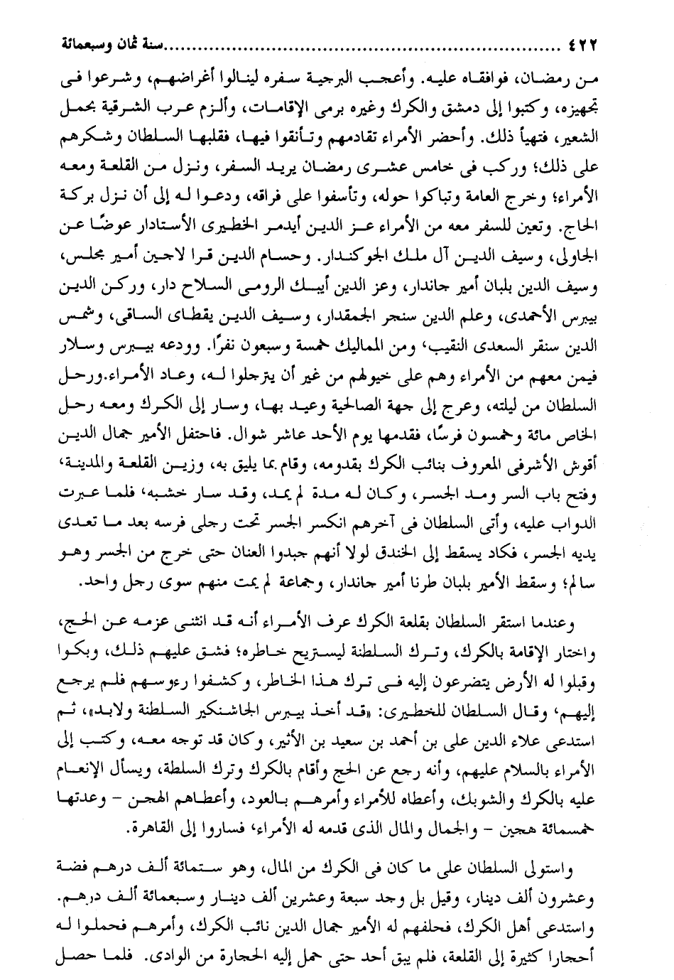 من رَمَضَان فوافقاه عَلَيْهِ. وأعجب البرجية سَفَره لينالوا أغراضهم وشرعوا فِي تَجْهِيزه وَكَتَبُوا إِلَى دمشق والكرك وَغَيره برمي الإقامات وألزم عرب الشرقية بِحمْل الشّعير فتهيأ ذَلِك. وأحضر الْأُمَرَاء تقادمهم وتأنقوا فِيهَا فقلبها السُّلْطَان وشكرهم على ذَلِك وَركب فِي خَامِس عشرى رَمَضَان يُرِيد السّفر وَنزل من القلعة وَمَعَهُ الْأُمَرَاء وَخرج الْعَامَّة وتباكوا حوله وتأسفوا على فِرَاقه ودعوا لَهُ إِلَى أَن نزل بركَة الْحَاج. وَتعين للسَّفر مَعَه من الْأُمَرَاء عز الدّين أيدمر الخطيري الأستادار عوضا عَن الجاولي وَسيف الدّين آل ملك الجوكندار. وحسام الدّين قرا لاجين أَمِير مجْلِس وَسيف الدّين بلبان أَمِير جاندار وَعز الدّين أيبك الرُّومِي السِّلَاح دَار وركن الدّين بيبرس الأحمدي وَعلم الدّين سنجر الجمقدار وَسيف الدّين يقطاي الساقي وشمس الدّين سنقر السَّعْدِيّ النَّقِيب وَمن المماليك خَمْسَة وَسَبْعُونَ نَفرا. وودعه بيبرس وسلار فِيمَن مَعَهم من الْأُمَرَاء وهم على خيولهم من غير أَن يترحلوا لَهُ وَعَاد الْأُمَرَاء. ورحل السُّلْطَان من ليلته وعرج إِلَى جِهَة الصالحية وَعِيد بهَا وَسَار إِلَى الكرك وَمَعَهُ رَحل الْخَاص مائَة وَخَمْسُونَ فرسا فَقَدمهَا يَوْم الْأَحَد عَاشر شَوَّال. فاحتفل الْأَمِير جمال الدّين أقوش الأشرفي الْمَعْرُوف بنائب الكرك بقدومه وَقَامَ بِمَا يَلِيق بِهِ وزين القلعة وَالْمَدينَة وَفتح بَاب السِّرّ وَمد الجسر وَكَانَ لَهُ مُدَّة لم يمد وَقد سَار خشبه فَلَمَّا عبرت الدَّوَابّ عَلَيْهِ وأتى السُّلْطَان فِي أخرهم انْكَسَرَ الجسر تَحت رجْلي فرسه بعد مَا تعدى يَدَيْهِ الجسر فكاد يسْقط إِلَى الخَنْدَق لَوْلَا أَنهم جبدوا الْعَنَان حَتَّى خرج من الجسر وَهُوَ سَالم وَسقط الْأَمِير بلبان طرنا أَمِير جاندار وَجَمَاعَة لم يمت مِنْهُم سوى رجل وَاحِد. وعندما اسْتَقر السُّلْطَان بقلعة الكرك عرف الْأُمَرَاء أَنه قد انثنى عزمه عَن الْحَج وَاخْتَارَ الْإِقَامَة بالكرك وَترك السلطنة ليستريح خاطره فشق عَلَيْهِم ذَلِك وَبكوا وقبلوا لَهُ الأَرْض يَتَضَرَّعُونَ إِلَيْهِ فِي ترك هَذَا الخاطر وكشفوا رؤوسهم فَلم يرجع إِلَيْهِم وَقَالَ السُّلْطَان للخطيري: قد أَخذ بيبرس الجاشنكير السلطنة ولابد ثمَّ استدعى عَلَاء الدّين على بن أَحْمد بن سعيد بن الْأَثِير وَكَانَ قد توجه مَعَه وَكتب إِلَى الْأُمَرَاء بِالسَّلَامِ عَلَيْهِم وَأَنه رَجَعَ عَن الْحَج وَأقَام بالكرك وَترك السلطة ويساً ل الإنعام عَلَيْهِ بالكرك والشوبك وَأَعْطَاهُ لِلْأُمَرَاءِ وَأمرهمْ بِالْعودِ وَأَعْطَاهُمْ الهجن - وعدتها خَمْسمِائَة هجين - وَالْجمال وَالْمَال الَّذِي قدمه لَهُ الْأُمَرَاء فَسَارُوا إِلَى الْقَاهِرَة. واستولي السُّلْطَان على مَا كَانَ فِي الكرك من المَال وَهُوَ سِتّمائَة ألف دِرْهَم فضَّة وَعِشْرُونَ ألف دِينَار وَقيل بل وجد سَبْعَة وَعشْرين ألف دِينَار وَسَبْعمائة ألف دِرْهَم. واستدعى أهل الكرك فحلفهم لَهُ الْأَمِير جمال الدّين نَائِب الكرك وَأمرهمْ فحملوا لَهُ أحجاراً كَثِيرَة إِلَى القلعة فَلم يبْق أحد حَتَّى حمل إِلَيْهِ الْحِجَارَة من الْوَادي. فَلَمَّا حصل