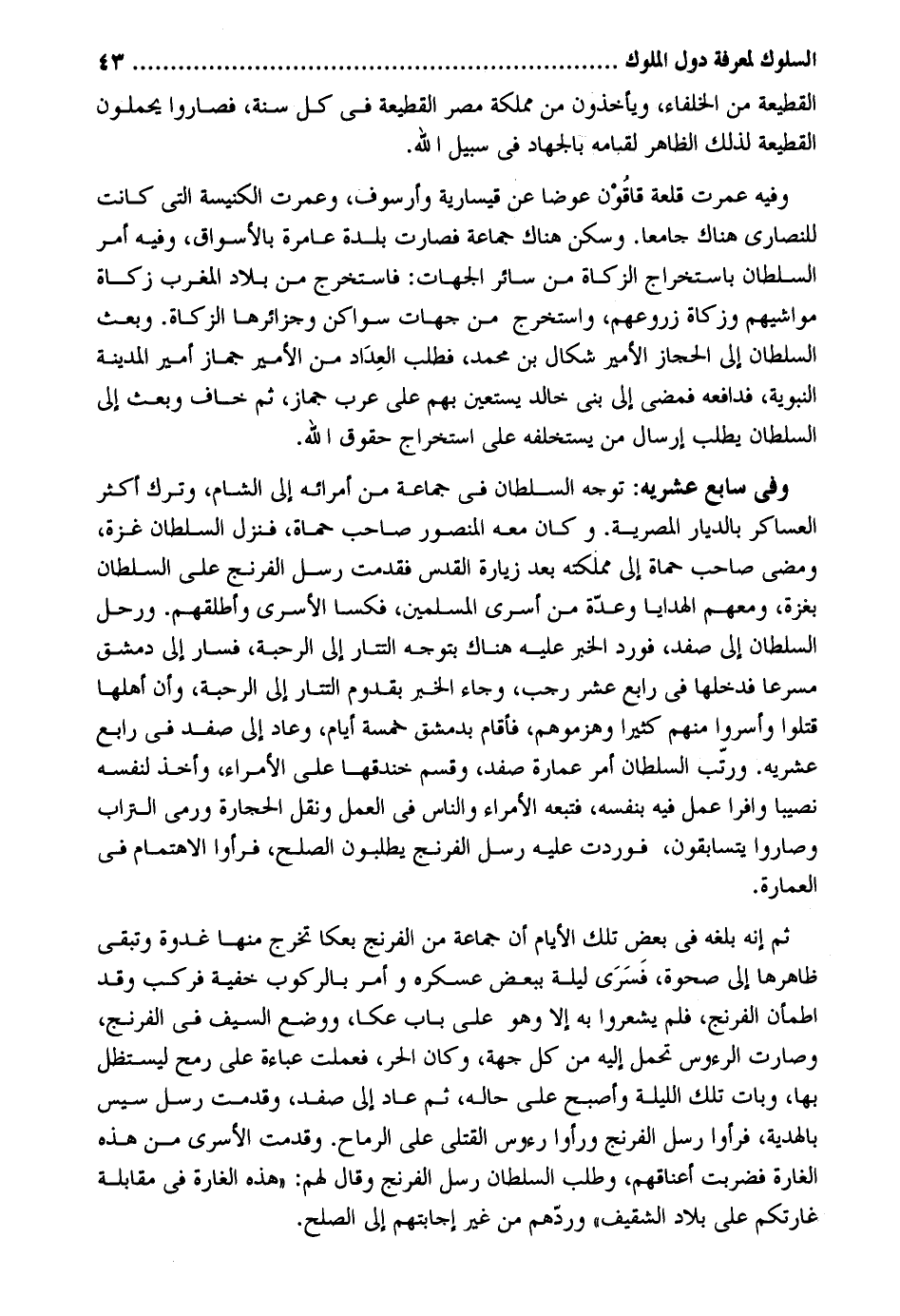 الْقطعَة من الْخُلَفَاء وَيَأْخُذُونَ من مملكة مصر الْقطعَة فِي كل سنة فصاروا يحملون القطيعة لذَلِك الظَّاهِر لقبامه بِالْجِهَادِ فِي سَبِيل الله. وَفِيه عمرت قلعة قاقون عوضا عَن قيسارية وأرسوف وعمرت الْكَنِيسَة الَّتِي كَانَت لِلنَّصَارَى هُنَاكَ جَامعا. وَسكن هُنَاكَ جمَاعَة فَصَارَت بَلْدَة عامرة بالأسواق وَفِيه أَمر السُّلْطَان باستخراج الزَّكَاة من سَائِر الْجِهَات: فاستخرج من بِلَاد الْمغرب زَكَاة مَوَاشِيهمْ وَزَكَاة زُرُوعهمْ واستخرج من جِهَات سواكن وجزائرها الزَّكَاة. وَبعث السُّلْطَان إِلَى الْحجاز الْأَمِير شكال بن مُحَمَّد فَطلب الْعداد من الْأَمِير جماز أَمِير الْمَدِينَة النَّبَوِيَّة فدافعه فَمضى إِلَى بني خَالِد يَسْتَعِين بهم على عرب جماز ثمَّ خَافَ وَبعث إِلَى السُّلْطَان يطْلب إرْسَال من يستخلفه على اسْتِخْرَاج حُقُوق الله. وَفِي سَابِع عشريه: توجه السُّلْطَان فِي جمَاعَة من أمرائه إِلَى الشَّام وَترك أَكثر العساكر بالديار المصرية. وَكَانَ مَعَه الْمَنْصُور صَاحب حماة فَنزل السُّلْطَان غَزَّة وَمضى صَاحب حماة إِلَى مَمْلَكَته بعد زِيَارَة الْقُدس فَقدمت رسل الفرنج على السُّلْطَان بغزه وَمَعَهُمْ الْهَدَايَا وعدة من أسرِي الْمُسلمين فكسا الأسري وأطلقهم. ورحل السُّلْطَان إِلَى صفد فورد الْخَبَر عَلَيْهِ هُنَاكَ بتوجه التتار إِلَى الرحبة فَسَار إِلَى دمشق مسرعا فَدَخلَهَا فِي رَابِع عشر رَجَب وَجَاء الْخَبَر بقدوم التتار إِلَى الرحبة وَأَن أَهلهَا قتلوا وأسروا مِنْهُم كثيرا وهزموهم فَأَقَامَ بِدِمَشْق خَمْسَة أَيَّام وَعَاد إِلَى صفد فِي رَابِع عشريه. ورتب السُّلْطَان أَمر عمَارَة صفد وَقسم خندقها على الْأُمَرَاء وَأخذ لنَفسِهِ نَصِيبا وافرا عمل فِيهِ بِنَفسِهِ فَتَبِعَهُ الْأُمَرَاء وَالنَّاس فِي الْعَمَل وَنقل الْحِجَارَة وَرمي التُّرَاب وصاروا يتسابقون فوردت عَلَيْهِ رسل الفرنج يطْلبُونَ الصُّلْح فَرَأَوْا الاهتمام فِي الْعِمَارَة. ثمَّ إِنَّه بلغه فِي بعض تِلْكَ الْأَيَّام أَن جمَاعَة من الفرنج بكما تخرج مِنْهَا غدْوَة وتبقي ظَاهرهَا إِلَى صحوة فَسرِّي لَيْلَة بِبَعْض عسكره وَأمر بالركوب خُفْيَة فَركب وَقد اطْمَأَن الفرنج فَلم يشعروا بِهِ إِلَّا وَهُوَ على بَاب عكا وَوضع السَّيْف فِي الفرنج وَصَارَت الرُّءُوس تحمل إِلَيْهِ من كل جِهَة وَكَانَ الْحر فَعمِلت عباءة على رمح ليستظل بهَا وَبَات تِلْكَ اللَّيْلَة وَأصْبح على حَاله ثمَّ عَاد إِلَى صفد وقدمت رسل سيس بالهدية فَرَأَوْا رسل الفرنج وَرَأَوا رُءُوس الْقَتْلَى على الرماح. وقدمت الأسري من هَذِه الْغَارة فَضربت أَعْنَاقهم وَطلب السُّلْطَان رسل الفرنج وَقَالَ لَهُم: هَذِه الْغَارة فِي مُقَابلَة غارتكم على بِلَاد الشقيف وردهم من غير إجابتهم إِلَى الصُّلْح.