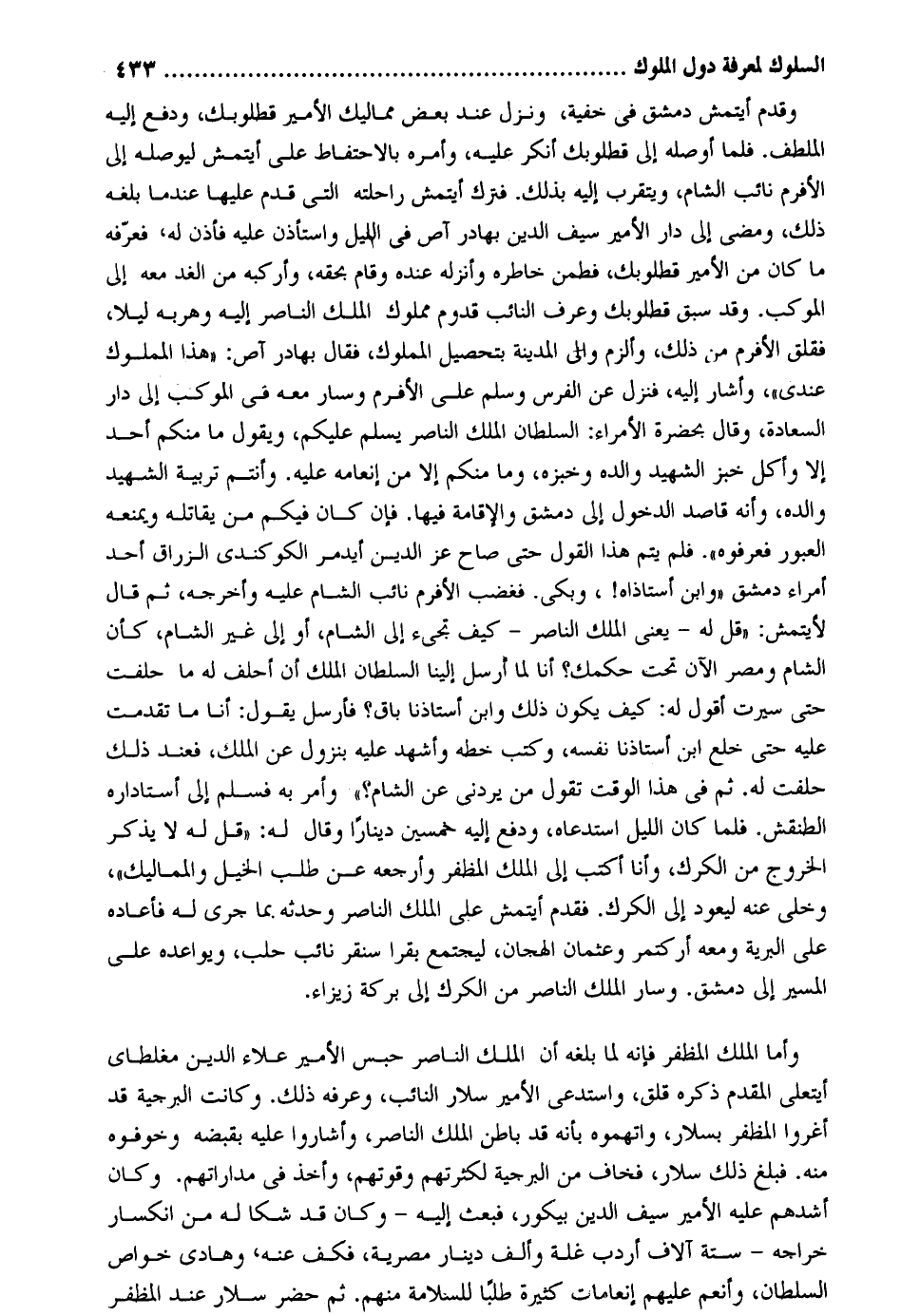 وَقدم أيتمش دمشق فِي خُفْيَة وَنزل عِنْد بعض مماليك الْأَمِير قطلوبك وَدفع إِلَيْهِ الملطف. فَلَمَّا أوصله إِلَى قطلوبك أنكر عَلَيْهِ وَأمره بالاحتفاظ على أيتمش ليوصله إِلَى الأفرم نَائِب الشَّام ويتقرب إِلَيْهِ بذلك. فَترك أيتمش رَاحِلَته الَّتِي قدم عَلَيْهَا عِنْدَمَا بلغه ذَلِك وَمضى إِلَى دَار الْأَمِير سيف الدّين بهادر آص فِي اللَّيْل وَاسْتَأْذَنَ عَلَيْهِ فَأذن لَهُ فَعرفهُ مَا كَانَ من الْأَمِير قطلوبك فطمن خاطره وأنزله عِنْده وَقَامَ بِحقِّهِ وأركبه من الْغَد مَعَه إِلَى الموكب. وَقد سبق قطلوبك وَعرف النَّائِب قدوم مَمْلُوك الْملك النَّاصِر إِلَيْهِ وهربه لَيْلًا فقلق الأفرم من ذَلِك وألزم وَالِي الْمَدِينَة بتحصيل الْمَمْلُوك فَقَالَ بهادر آص: هَذَا الْمَمْلُوك عِنْدِي وَأَشَارَ إِلَيْهِ فَنزل عَن الْفرس وَسلم على الأفرم وَسَار مَعَه فِي الموكب إِلَى دَار السَّعَادَة وَقَالَ بِحَضْرَة الْأُمَرَاء: السُّلْطَان الْملك النَّاصِر يسلم عَلَيْكُم وَيَقُول مَا مِنْكُم أحد إِلَّا وَأكل خبز الشَّهِيد وَالِده وخبزه وَمَا مِنْكُم إِلَّا من إنعامه عَلَيْهِ. وَأَنْتُم تربية الشَّهِيد وَالِده وَأَنه قَاصد الدُّخُول إِلَى دمشق وَالْإِقَامَة فِيهَا. فَإِن كَانَ فِيكُم من يقاتله ويمنعه العبور فعرفعوه. فَلم يتم هَذَا القَوْل حَتَّى صَاح عز الدّين أيدمر الكوكندي الزراق أحد أُمَرَاء دمشق وَابْن أستاذاه! وَبكى. فَغَضب الأفرم نَائِب الشَّام عَلَيْهِ وَأخرجه ثمَّ قَالَ لأيتمش: قل لَهُ - يَعْنِي الْملك النَّاصِر - كَيفَ تَجِيء إِلَى الشَّام أَو إِلَى غير الشَّام كَأَن الشَّام ومصر الْآن تَحت حكمك أَنا لما أرسل إِلَيْنَا السُّلْطَان الْملك أَن أَحْلف لَهُ مَا حَلَفت حَتَّى سيرت أَقُول لَهُ: كَيفَ يكون ذَلِك وَابْن أستاذنا بَاقٍ فَأرْسل يَقُول: أَنا مَا تقدّمت عَلَيْهِ حَتَّى خلع ابْن أستاذنا نَفسه وَكتب خطه وَأشْهد عَلَيْهِ بنزول عَن الْملك فَعِنْدَ ذَلِك حَلَفت لَهُ. ثمَّ فِي هَذَا الْوَقْت تَقول من يردني عَن الشَّام وَأمر بِهِ فَسلم إِلَى أستاداره الطنقش. فَلَمَّا كَانَ اللَّيْل استدعاه وَدفع إِلَيْهِ خمسين دِينَارا وَقَالَ لَهُ: قل لَهُ لَا يذكر الْخُرُوج من الكرك وَأَنا أكتب إِلَى الْملك المظفر وأرجعه عَن طلب الْخَيل والمماليك وخلى عَنهُ ليعود إِلَى الكرك. فَقدم أيتمش على الْملك النَّاصِر وحدثه بِمَا جرى لَهُ فَأَعَادَهُ على الْبَريَّة وَمَعَهُ أر كتمر وَعُثْمَان الهجان ليجتمع بقرًا سنقر نَائِب حلب ويواعده على الْمسير إِلَى دمشق. وَسَار الْملك النَّاصِر من الكرك إِلَى بركَة زيزاء. وَأما الْملك المظفر فَإِنَّهُ لما بلغه أَن الْملك النَّاصِر حبس الْأَمِير عَلَاء الدّين مغلطاي أيتعلى الْمُقدم ذكره قلق واستدعى الْأَمِير سلار النَّائِب وعرفه ذَلِك. وَكَانَت البرجية قد أغروا المظفر بسلار واتهموه بِأَنَّهُ قد بَاطِن الْملك النَّاصِر وأشاروا عَلَيْهِ بِقَبْضِهِ وخوفوه مِنْهُ. فَبلغ ذَلِك سلار فخاف من البرجية لكثرتهم وقوتهم وَأخذ فِي مداراتهم. وَكَانَ أَشَّدهم عَلَيْهِ الْأَمِير سيف الدّين بيكور فَبعث إِلَيْهِ - وَكَانَ قد شكا لَهُ من انكسار خراجه - سِتَّة أُلَّاف أردب غلَّة وَألف دِينَار مصرية فَكف عَنهُ وهادى خَواص السُّلْطَان وأنعم عَلَيْهِم اٍ نعامات كَثِيرَة طلبا للسلامة مِنْهُم. ثمَّ حضر سلار عِنْد المظفر