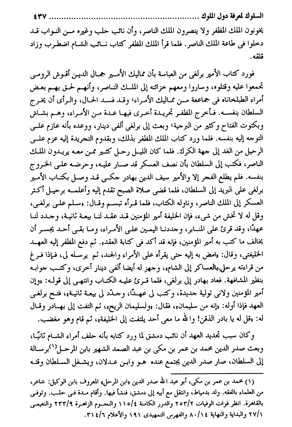 يخونون الْملك المظفر وَلَا ينْصرُونَ الْملك النَّاصِر وَأَن نَائِب حلب وَغَيره من النواب قد دخلُوا فِي طَاعَة الْملك النَّاصِر. فَلَمَّا قَرَأَ الْملك المظفر كتاب نَائِب الشَّام اضْطربَ وَزَاد قلقه. فورد كتاب الْأَمِير برلغي من العباسة بِأَن مماليك الْأَمِير جمال الدّين أقوش الرُّومِي تجمعُوا عَلَيْهِ وقتلوه وَسَارُوا وَمَعَهُمْ خزائنه إِلَى الْملك النَّاصِر وَأَنَّهُمْ لحق بهم بعض أُمَرَاء الطبلخاناه فِي جمَاعَة من مماليك الْأُمَرَاء وَقد فسد الْحَال والرأي أَن يخرج السُّلْطَان بِنَفسِهِ. فَأخْرج المظفر تجريدة أُخْرَى فِيهَا عدَّة من الْأُمَرَاء وهم بشاش وبكتوت الفتاح وَكثير من البرجية وَبعث إِلَى برلغي ألفي دِينَار ووعده بِأَنَّهُ عازم على التَّوَجُّه إِلَيْهِ بِنَفسِهِ. فَلَمَّا ورد كتاب الْملك المظفر بذلك وبقدوم التجريدة إِلَيْهِ عزم على الرحيل من الْغَد إِلَى جِهَة الكرك. فَلَمَّا كَانَ اللَّيْل رَحل كثير مِمَّن مَعَه يُرِيدُونَ الْملك النَّاصِر فَكتب إِلَى السُّلْطَان بِأَن نصف الْعَسْكَر قد صَار عَلَيْهِ وحرضه على الْخُرُوج بِنَفسِهِ. فَلم يطلع الْفجْر إِلَّا والأمير سيف الدّين بهادر جكي قد وصل بِكِتَاب الْأَمِير برلغي على الْبَرِيد إِلَى السُّلْطَان فَلَمَّا قضي صَلَاة الصُّبْح تقدم إِلَيْهِ وأعلمه برحيل أَكثر الْعَسْكَر إِلَى الْملك النَّاصِر وناوله الْكتاب فَلَمَّا قَرَأَهُ تَبَسم وَقَالَ: سلم على برلغي وَقل لَهُ لَا تخش من شَيْء فَإِن الْخَلِيفَة أَمِير الْمُؤمنِينَ قد عقد لنا بيعَة ثَانِيَة وجدد لنا عهدا وَقد قرئَ على المنابر وجددنا الْيَمين على الْأُمَرَاء وَمَا بَقِي أحد يَجْسُر أَن يُخَالف مَا كتب بِهِ أَمِير الْمُؤمنِينَ فَإِنَّهُ قد أكد فِي كِتَابَة العقد. ثمَّ دفع المظفر إِلَيْهِ الْعَهْد الخليفتي وَقَالَ: امْضِ بِهِ إِلَيْهِ حَتَّى يقرأه على الْأُمَرَاء والجند ثمَّ يُرْسِلهُ لي فَإِذا فرغ من قرائته يرحل بالعساكر إِلَى الشَّام وجهز لَهُ أَيْضا ألفي دِينَار أُخْرَى وَكتب جَوَابه بنظير المشافهة. فَعَاد بهادر إِلَى برلغي فَلَمَّا قرئَ عَلَيْهِ الْكتاب وانتهي إِلَى قَوْله: وَإِن أَمِير الْمُؤمنِينَ ولاني تَوْلِيَة جَدِيدَة وَكتب لي عهدا وجدد لي بيعَة ثَانِيَة فتح برلغي الْعَهْد فَإِذا أَوله: إِنَّه من سُلَيْمَان فَقَالَ: ولسليمان الرّيح ثمَّ الْتفت إِلَى بهادر وَقَالَ لَهُ: قل لَهُ يَا بَادر الذقن! وَالله مَا معي أحد يلْتَفت إِلَى الْخَلِيفَة ثمَّ قَامَ وَهُوَ مغضب. وَكَانَ سَبَب تَجْدِيد الْعَهْد أَن نَائِب دمشق لما ورد كِتَابه بِأَنَّهُ حلف أُمَرَاء الشَّام ثَانِيًا وَبعث صدر الدّين مُحَمَّد بن عمر بن مكي بن عبد الصَّمد الشهير بِابْن المرحل برسالة إِلَى السُّلْطَان صَار صدر الدّين يجْتَمع عِنْده هُوَ وَابْن عَدْلَانِ ويشغل السُّلْطَان وقته