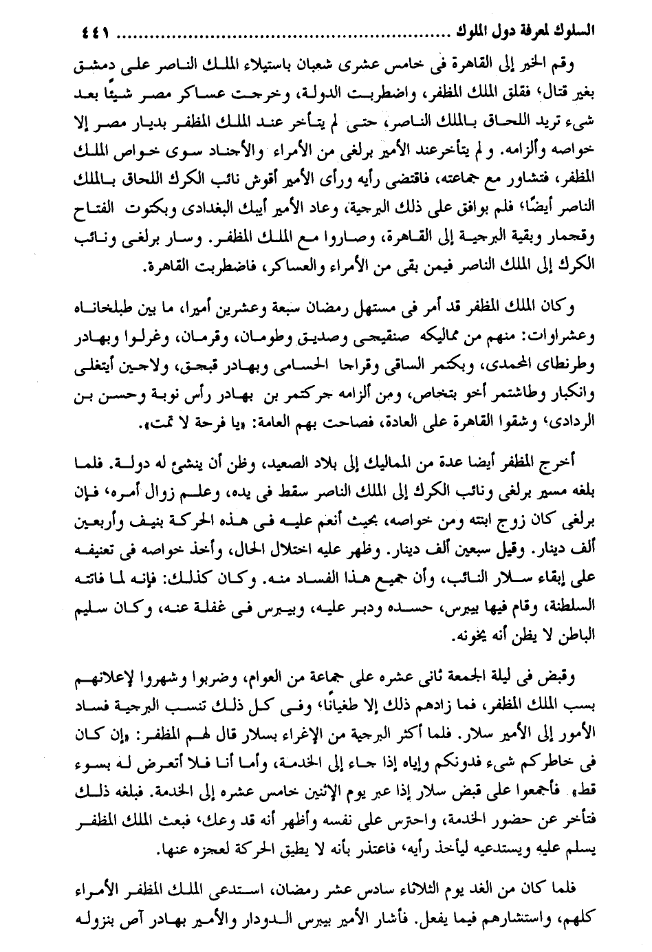 وقم الْخَيْر إِلَى الْقَاهِرَة فِي خَامِس عشرى شعْبَان باستيلاء الْملك النَّاصِر على دمشق بِغَيْر قتال فقلق الْملك المظفر واضطربت الدولة وَخرجت عَسَاكِر مصر شَيْئا بعد شَيْء تُرِيدُ اللحاق بِالْملكِ النَّاصِر حَتَّى لم يتَأَخَّر عِنْد الْملك المظفر بديار مصر إِلَّا خواصه وألزامه. وَلم يتَأَخَّر عِنْد الْأَمِير برلغي من الْأُمَرَاء والأجناد سوي خَواص الْملك المظفر فتشاور مَعَ جماعته فَاقْتضى رَأْيه وَرَأى الْأَمِير أقوش نَائِب الكرك اللحاق بِالْملكِ النَّاصِر أَيْضا فَلم يُوَافق على ذَلِك البرجية وَعَاد الْأَمِير أيبك الْبَغْدَادِيّ وبكتوت الفتاح وقجمار وَبَقِيَّة البرجية إِلَى الْقَاهِرَة وصاروا مَعَ الْملك المظفر. وَسَار برلغي ونائب الكرك إِلَى الْملك النَّاصِر فِيمَن بَقِي من الْأُمَرَاء والعساكر فاضطربت الْقَاهِرَة. وَكَانَ الْملك المظفر قد أَمر فِي مستهل رَمَضَان سَبْعَة وَعشْرين أَمِيرا مَا بَين طبلخاناه وعشراوات: مِنْهُم من مماليكه صنقبحي وصديق وطومان وقرمان وغرلوا وبهادر وطرنطاي المحمدي وبكتمر الساقي وقراجا الحسامي وبهادر قبجق ولاجين أيتغلي وانكبار وطاشتمر أَخُو بتخاص وَمن ألزامه جركتمر بن بهادر رَأس نوبَة وَحسن بن الردادي وشقوا الْقَاهِرَة على الْعَادة فصاحت بهم الْعَامَّة: يَا فرحة لَا تمت. أخرج المظفر أَيْضا عدَّة من المماليك إِلَى بِلَاد الصَّعِيد وَظن أَن ينشئ لَهُ دولة. فَلَمَّا بلغه مسير برلغي ونائب الكرك إِلَى الْملك النَّاصِر سقط فِي يَده وَعلم زَوَال أمره فَإِن برلغي كَانَ زوج ابْنَته وَمن خواصه بِحَيْثُ أنعم عَلَيْهِ فِي هَذِه الْحَرَكَة بنيف وَأَرْبَعين ألف دِينَار. وَقيل سبعين ألف دِينَار. وَظهر عَلَيْهِ اختلال الْحَال وَأخذ خواصه فِي تعنيفه على إبْقَاء سلار النَّائِب وَأَن جَمِيع هَذَا الْفساد مِنْهُ. وَكَانَ كَذَلِك: فَإِنَّهُ لما فَاتَتْهُ السلطنة وَقَامَ فِيهَا بيبرس حسده ودبر عَلَيْهِ وبيبرس فِي غَفلَة عَنهُ وَكَانَ سليم الْبَاطِن لَا يظنّ أَنه يخونه. وَقبض فِي لَيْلَة الْجُمُعَة ثَانِي عشره على جمَاعَة من الْعَوام وضربوا وشهروا لإعلانهم بسب الْملك المظفر فَمَا زادهم ذَلِك إِلَّا طغيانًا وَفِي كل ذَلِك تنْسب البرجية فَسَاد الْأُمُور إِلَى الْأَمِير سلار. فَلَمَّا أَكثر البرجية من الإغراء بسلار قَالَ لَهُم المظفر: إِن كَانَ فِي خاطركم شَيْء فدونكم وإياه إِذا جَاءَ إِلَى الْخدمَة وَأما أَنا فَلَا أتعرض لَهُ بِسوء قطّ فَأَجْمعُوا على قبض سلار إِذا عبر يَوْم الْإِثْنَيْنِ خَامِس عشره إِلَى الْخدمَة. فَبَلغهُ ذَلِك فَتَأَخر عَن حُضُور الْخدمَة واحترس على نَفسه وَأظْهر أَنه قد وعك فَبعث الْملك المظفر يسلم عَلَيْهِ ويستدعيه ليَأْخُذ رَأْيه فَاعْتَذر بِأَنَّهُ لَا يُطيق الْحَرَكَة لعَجزه عَنْهَا. فَلَمَّا كَانَ من الْغَد يَوْم الثُّلَاثَاء سادس عشر رَمَضَان استدعى الْملك المظفر الْأُمَرَاء كلهم واستشارهم فِيمَا يفعل. فَأَشَارَ الْأَمِير بيبرس الدودار والأمير بهادر آص بنزوله
