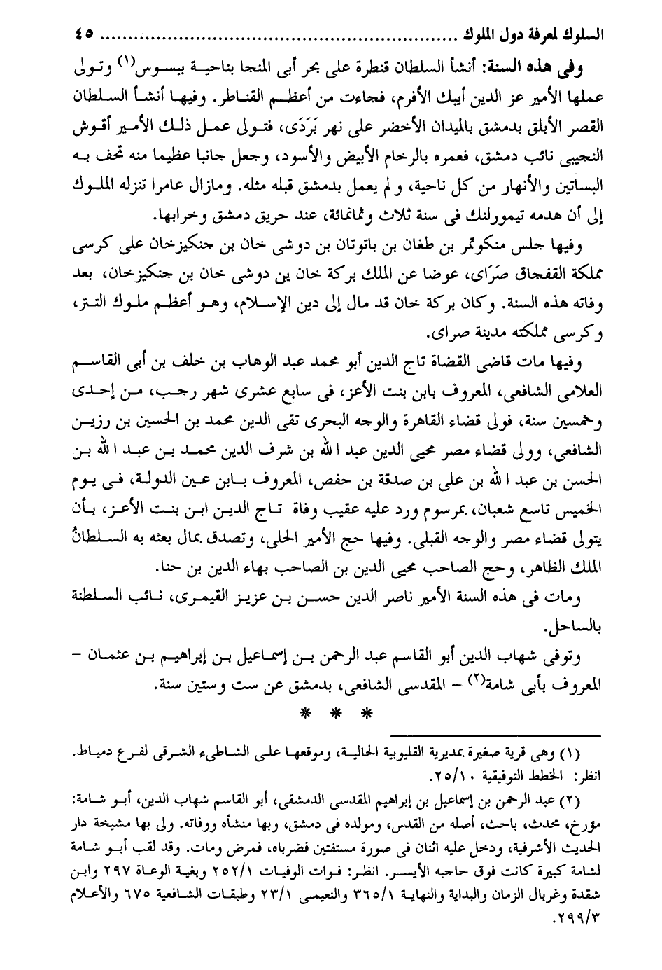 وَفِي هَذِه السّنة: أنشأ السُّلْطَان قنطرة على بَحر أبي المنجا بِنَاحِيَة ببسوس وتولي عَملهَا الْأَمِير عز الدّين أيبك الأفرم فَجَاءَت من أعظم القناطر. وفيهَا أنشأ السُّلْطَان الْقصر الأبلق بِدِمَشْق بالميدان الْأَخْضَر على نهر بردي فتولي عمل ذَلِك الْأَمِير أقوش النجيبي نَائِب دمشق فعمره بالرخام الْأَبْيَض وَالْأسود وَجعل جانبا عَظِيما مِنْهُ تحف بِهِ الْبَسَاتِين والأنهار من كل نَاحيَة وَلم يعْمل بِدِمَشْق قبله مثله. ومازال عَامِرًا تنزله الْمُلُوك إِلَى أَن هَدمه تيمورلنك فِي سنة ثَلَاث وَثَمَانمِائَة عِنْد حريق دمشق وخرابها. وفيهَا جلس منكوتمر بن طغان بن باتوتان بن دوشي خَان بن جنكيزخان على كرْسِي مملكة القفجاق صراي عوضا عَن الْملك بركَة خَان بن دوشي خَان بن جنكيزخان بعد وَفَاته هَذِه السّنة. وَكَانَ بركَة خَان قد مَال إِلَى دين الْإِسْلَام وَهُوَ أعظم مُلُوك التتر وكرسي مَمْلَكَته مَدِينَة صراي. وفيهَا مَاتَ قَاضِي الْقُضَاة تَاج الدّين أَبُو مُحَمَّد عبد الْوَهَّاب بن خلف بن أبي الْقَاسِم العلامي الشَّافِعِي الْمَعْرُوف بِابْن بنت الْأَعَز فِي سَابِع عشري شهر رَجَب من إِحْدَى وَخمسين سنة فولي قَضَاء الْقَاهِرَة وَالْوَجْه البحري تَقِيّ الدّين مُحَمَّد بن الْحُسَيْن بن رزين الشَّافِعِي وَولي قَضَاء مصر محيي الدّين عبد الله بن شرف الدّين مُحَمَّد بن عبد الله بن الْحسن بن عبد الله بن على بن صَدَقَة بن حَفْص الْمَعْرُوف بِابْن عين الدولة فِي يَوْم الْخَمِيس تَاسِع شعْبَان. بمرسوم ورد عَلَيْهِ عقيب وَفَاة تَاج الدّين ابْن بنت الْأَعَز بِأَن يتَوَلَّى قَضَاء مصر وَالْوَجْه القبلي. وفيهَا حج الْأَمِير الْحلِيّ وَتصدق بِمَال بَعثه بِهِ السُّلْطَان الْملك الظَّاهِر وَحج الصاحب محيي الدّين بن الصاحب بهاء الدّين بن حنا. وَمَات فِي هَذِه السّنة الْأَمِير نَاصِر الدّين حسن بن عَزِيز القيمري نَائِب السلطنة بالسَّاحل. وَتُوفِّي شهَاب الدّين أَبُو الْقَاسِم عبد الرَّحْمَن بن إِسْمَاعِيل بن إِبْرَاهِيم بن عُثْمَان الْمَعْرُوف بِأبي شامة الْمَقْدِسِي الشَّافِعِي بِدِمَشْق عَن سِتّ وَسِتِّينَ سنة.