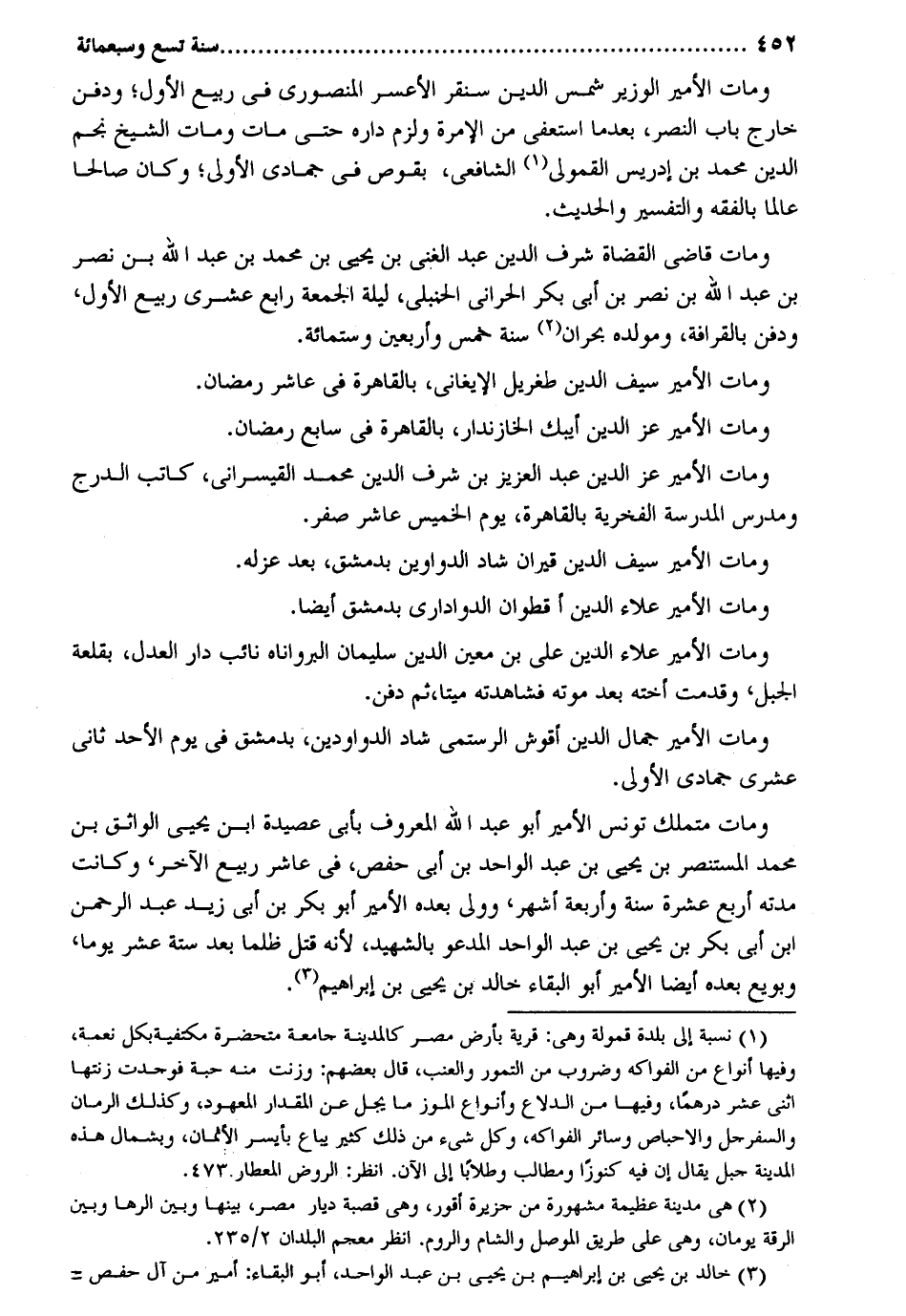 وَمَات الْأَمِير الْوَزير شمس الدّين سنقر الأعسر المنصوري فِي ربيع الأول وَدفن خَارج بَاب النَّصْر بَعْدَمَا استعفى من الإمرة وَلزِمَ دَاره حَتَّى مَاتَ وَمَات الشَّيْخ نجم الدّين مُحَمَّد بن إِدْرِيس الْقَمُولِيّ الشَّافِعِي بقوص فِي جُمَادَى الأولى وَكَانَ صَالحا عَالما بالفقه وَالتَّفْسِير والْحَدِيث. وَمَات قَاضِي الْقُضَاة شرف الدّين عبد الْغَنِيّ بن يحيى بن مُحَمَّد بن عبد الله بن نصر بن عبد الله بن نصر بن أبي بكر الْحَرَّانِي الْحَنْبَلِيّ لَيْلَة الْجُمُعَة رَابِع عشرى ربيع الأول وَدفن بالقرافة ومولده بحران سنة خمس وَأَرْبَعين وسِتمِائَة. وَمَات الْأَمِير سيف الدّين طغريل الإيغاني بِالْقَاهِرَةِ فِي عَاشر رَمَضَان. وَمَات الْأَمِير عز الدّين أيبك الخازندار بِالْقَاهِرَةِ فِي سَابِع رَمَضَان. وَمَات الْأَمِير عز الدّين عبد الْعَزِيز بن شرف الدّين مُحَمَّد القيسراني كَاتب الدرج ومدرس الْمدرسَة الفخرية بِالْقَاهِرَةِ يَوْم الْخَمِيس عَاشر صفر. وَمَات الْأَمِير عَلَاء الدّين أقطوان الدواداري بِدِمَشْق أَيْضا. وَمَات الْأَمِير عَلَاء الدّين عَليّ بن معِين الدّين سُلَيْمَان البرواناه نَائِب دَار الْعدْل بقلعة الْجَبَل وقدمت أُخْته بعد مَوته فشاهدته مَيتا ثمَّ دفن. وَمَات الْأَمِير جمال الدّين أقوش الرستمي شاد الدواودين بِدِمَشْق فِي يَوْم الْأَحَد ثَانِي عشرى جُمَادَى الأولى. وَمَات متملك تونس الْأَمِير أَبُو عبد الله الْمَعْرُوف بِأبي عصيدة ابْن يحيى الواثق بن مُحَمَّد الْمُسْتَنْصر بن يحيى بن عبد الْوَاحِد بن أبي حَفْص فِي عَاشر ربيع الآخر وَكَانَت مدَّته أَربع عشرَة سنة وَأَرْبَعَة أشهر ووفى بعده الْأَمِير أَبُو بكر بن أبي زيد عبد الرَّحْمَن ابْن أبي بكر بن يحيى بن عبد الْوَاحِد الْمَدْعُو بالشهيد لِأَنَّهُ قتل ظلما بعد سِتَّة عشر يَوْمًا وبويع بعده أَيْضا الْأَمِير أَبُو الْبَقَاء خَالِد بن يحيى بن إِبْرَاهِيم.