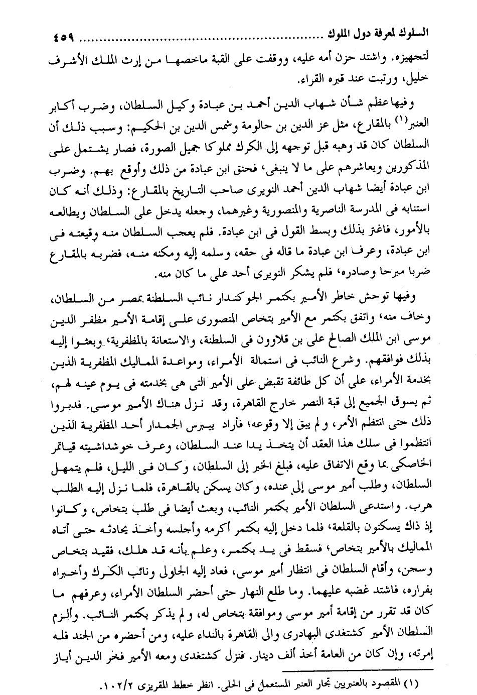 لتجهيزه. وَاشْتَدَّ حزن أمه عَلَيْهِ ووقفت على الْقبَّة مَا خصها من إِرْث الْملك الْأَشْرَف خَلِيل ورتبت عِنْد قَبره الْقُرَّاء. وفيهَا عظم شَأْن شهَاب الدّين أَحْمد بن عبَادَة وَكيل السُّلْطَان وَضرب أكَابِر العنبر بالمقارع مثل عز الدّين بن حالومة وشمس الدّين بن الْحَكِيم: وَسبب ذَلِك أَن السُّلْطَان كَانَ قد وهبه قبل توجهه إِلَى الكرك مَمْلُوكا جميل الصُّورَة فَصَارَ يشْتَمل على الْمَذْكُورين ويعاشرهم على مَا لَا يَنْبَغِي فحنق ابْن عبَادَة من ذَلِك وأوقع بهم. وَضرب ابْن عبَادَة أَيْضا شهَاب الدّين أَحْمد النويري صَاحب التَّارِيخ بالمقارع: وَذَلِكَ أَنه كَانَ استنابه فِي الْمدرسَة الناصرية والمنصورية وَغَيرهمَا وَجعله يدْخل على السُّلْطَان ويطالعه بالأمور فاغتر بذلك وَبسط القَوْل فِي ابْن عبَادَة. فَلم يعجب السُّلْطَان مِنْهُ وقيعته فِي ابْن عبَادَة وَعرف ابْن عبَادَة مَا قَالَه فِي حَقه وَسلمهُ إِلَيْهِ ومكنه مِنْهُ فَضَربهُ بالمقارع ضربا مبرحاً وصادره فَلم يشْكر النويري أَحد على مَا كَانَ مِنْهُ. وفيهَا توحش خاطر الْأَمِير بكتمر الجوكندار نَائِب السلطة بِمصْر من السُّلْطَان وَخَافَ مِنْهُ وَاتفقَ بكتمر مَعَ الْأَمِير بتخاص المنصوري على إِقَامَة الْأَمِير مظفر الدّين مُوسَى ابْن الْملك الصَّاع عَليّ بن قلاوون فِي السلطنة والاستعانة بالمظفرية وبعثوا إِلَيْهِ بذلك فوافقهم. وَشرع النَّائِب فِي استمالة الْأُمَرَاء ومواعدة المماليك المظفرية الَّذين بِخِدْمَة الْأُمَرَاء على أَن كل طَائِفَة تقبض على الْأَمِير الَّتِي هِيَ بخدمته فِي يَوْم عينه لَهُم ثمَّ يَسُوق الْجَمِيع إِلَى قبَّة النَّصْر خَارج الْقَاهِرَة وَقد نزل هُنَاكَ الْأَمِير مُوسَى. فدبروا ذَلِك حَتَّى انتظم الْأَمر وَلم يبْق إِلَّا وُقُوعه فَأَرَادَ بيبرس الجمدار أحد المظفرية الَّذين انتظموا فِي سلك هَذَا العقد أَن يتَّخذ يدا عِنْد السُّلْطَان وَعرف خوشداشيته قياتمر الخاصكي بِمَا وَقع الِاتِّفَاق عَلَيْهِ فَبلغ الْخَبَر إِلَى السُّلْطَان وَكَانَ فِي اللَّيْل فَلم يتمهل السُّلْطَان وَطلب أَمِير مُوسَى إِلَى عِنْده وَكَانَ يسكن بِالْقَاهِرَةِ فَلَمَّا نزل إِلَيْهِ الطّلب هرب. واستدعى السُّلْطَان الْأَمِير بكتمر النَّائِب وَبعث أَيْضا فِي طلب بتخاص وَكَانُوا إِذْ ذَاك يسكنون بالقلعة فَلَمَّا دخل إِلَيْهِ بكتمر أكْرمه وَأَجْلسهُ وَأخذ يحادثه حَتَّى أَتَاهُ المماليك بالأمير بتخاص فَسقط فِي يَد بكتمر وَعلم بِأَنَّهُ قد هلك فقيد بتخاص وسجن وَأقَام السُّلْطَان فِي انْتِظَار أَمِير مُوسَى فَعَاد إِلَيْهِ الجاولي ونائب الكرك وأخبراه بفراره فَاشْتَدَّ غَضَبه عَلَيْهِمَا. وَمَا طلع النَّهَار حَتَّى أحضر السُّلْطَان الْأُمَرَاء وعرفهم مَا كمان قد تقرر من إِقَامَة أَمِير مُوسَى وموافقة. بتخاص لَهُ وَلم يذكر بكتمر النَّائِب. وألزم السُّلْطَان الْأَمِير كشتغدي البهادري وَالِي الْقَاهِرَة بالنداء عَلَيْهِ وَمن أحضرهُ من الْجند فَلهُ إمرته وَإِن كَانَ من الْعَامَّة أَخذ ألف دِينَار. فَنزل كشتغدي وَمَعَهُ الْأَمِير فَخر الدّين أياز