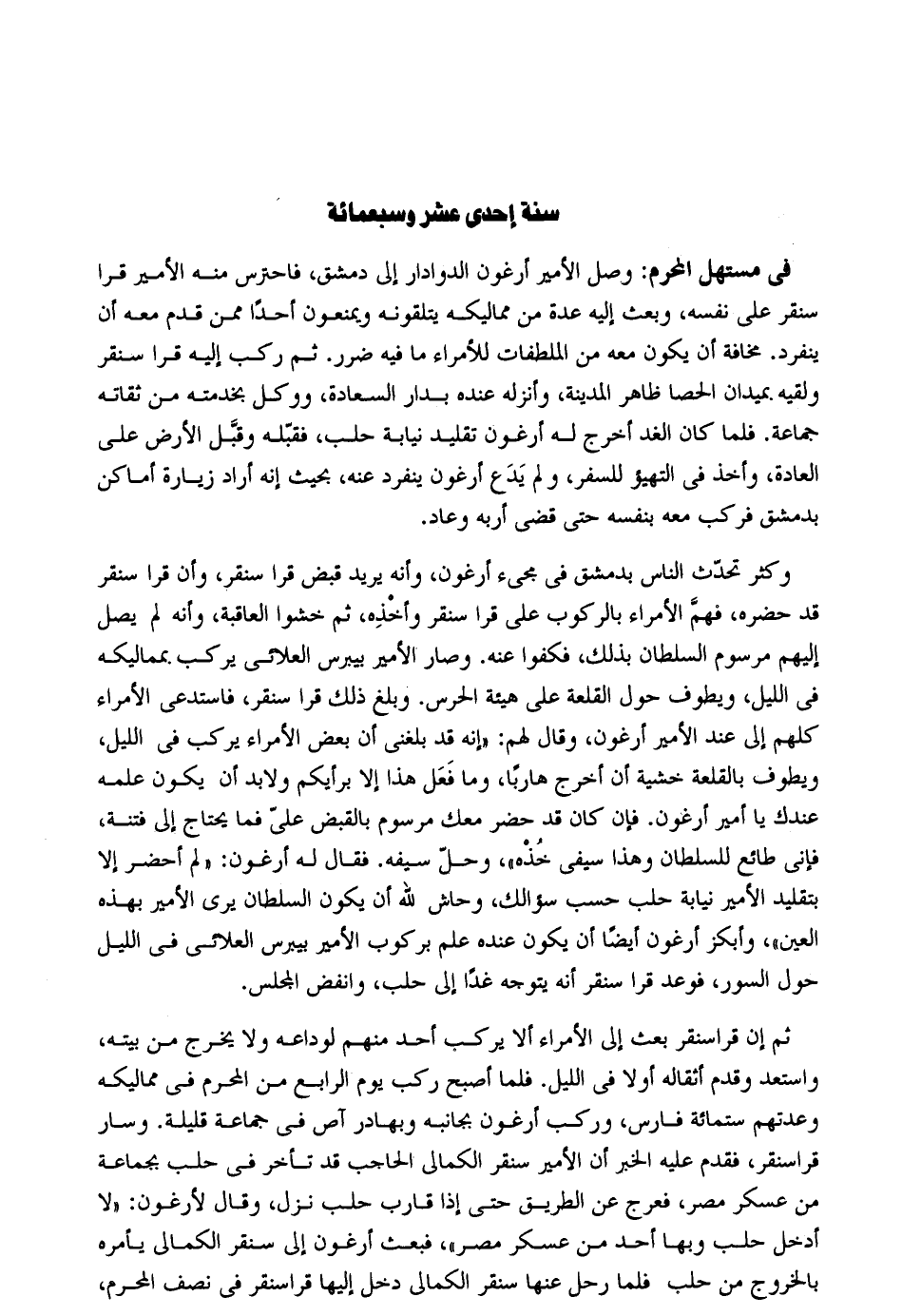 فِي مستهل الْمحرم: وصل الْأَمِير أرغون الدوادار إِلَى دمشق فاحترس مِنْهُ الْأَمِير قرا سنقر على نَفسه وَبعث إِلَيْهِ عدَّة من مماليكه يتلقونه وَيمْنَعُونَ أحدا مِمَّن قدم مَعَه أَن ينْفَرد. مَخَافَة أَن يكون مَعَه من الملطفات لِلْأُمَرَاءِ مَا فِيهِ ضَرَر. ثمَّ ركب إِلَيْهِ قرا سنقر ولقيه بميدان الْحَصَا ظَاهر الْمَدِينَة وأنزله عِنْده بدار السَّعَادَة ووكل بخدمته من ثقاته جمَاعَة. فَلَمَّا كَانَ الْغَد أخرج لَهُ أرغون تَقْلِيد نِيَابَة حلب فقبّله وقَّبل الأَرْض على الْعَادة وَأخذ فِي التهيؤ للسَّفر وَلم يدع أرغون ينْفَرد عَنهُ بِحَيْثُ إِنَّه أَرَادَ زِيَارَة أَمَاكِن بِدِمَشْق فَركب مَعَه بِنَفسِهِ حَتَّى قضى أربه وَكثر تحدث النَّاس بِدِمَشْق فِي مَجِيء أرغون وَأَنه يُرِيد قبص قرا سنقر وَأَن قرا سنقر قد حَضَره فهم الْأُمَرَاء بالركوب على قرا سنقر وَأَخذه ثمَّ خَشوا الْعَاقِبَة وَأَنه لم يصل إِلَيْهِم مرسوم السُّلْطَان بذلك فكفوا عَنهُ. وَصَارَ الْأَمِير بيبرس العلائي يركب بمماليكه فِي اللَّيْل وَيَطوف حول القلعة على هَيْئَة الحرس. وَبلغ ذَلِك قرا سنقر فاستدعى الْأُمَرَاء كلهم إِلَى عِنْد الْأَمِير أرغون وَقَالَ لَهُم: إِنَّه قد بَلغنِي أَن بعض الْأُمَرَاء يركب فِي اللَّيْل وَيَطوف بالقلعة خشيَة أَن أخرج هَارِبا وَمَا فعل هَذَا إِلَّا برأيكم ولابد أَن يكون علمه عنْدك يَا أَمِير أرغون. فَإِن كَانَ قد حضر مَعَك مرسوم بِالْقَبْضِ عَليّ فَمَا يحْتَاج إِلَى فتْنَة فَإِنِّي طالع للسُّلْطَان وَهَذَا سَيفي خُذْهُ وَحل سَيْفه. فَقَالَ لَهُ أرغون: لم أحضر إِلَّا بتقليد الْأَمِير نِيَابَة حلب حسب سؤالك وحاش الله أَن يكون السُّلْطَان يرى الْأَمِير بِهَذِهِ الْعين وأبكز أرغون أَيْضا أَن يكون عِنْده علم بركوب الْأَمِير بيبرس العلائي فِي اللَّيْل حول السُّور فوعد قرا سنقر أَنه يتَوَجَّه غَدا إِلَى حلب وانفض الْمجْلس. ثمَّ إِن قراسنقر بعث إِلَى الْأُمَرَاء أَلا يركب أحد مِنْهُم لوداعه وَلَا يخرج من بَيته واستعد وَقدم أثقاله أَولا فِي اللَّيْل. فَلَمَّا أصبح ركب يَوْم الرَّابِع من الْمحرم فِي مماليكه وعدتهم سِتّمائَة فَارس وَركب أرغون بجانبه وبهادر آص فِي جمَاعَة قَليلَة. وَسَار قرا سنقر فَقدم عَلَيْهِ الْخَبَر أَن الْأَمِير سنقر الكمالي الْحَاجِب قد تَأَخّر فِي حلب بِجَمَاعَة من عَسْكَر مصر فعرج عَن الطَّرِيق حَتَّى إِذا قَارب حلب نزل وَقَالَ لأرغون: لَا أَدخل حلب وَبهَا أحد من عَسْكَر مصر فَبعث أرغون إِلَى سنقر الكمالي يَأْمُرهُ بِالْخرُوجِ من حلب فَلَمَّا رَحل عَنْهَا سنقر الكمالي دخل إِلَيْهَا قراسنقر فِي نصف الْمحرم