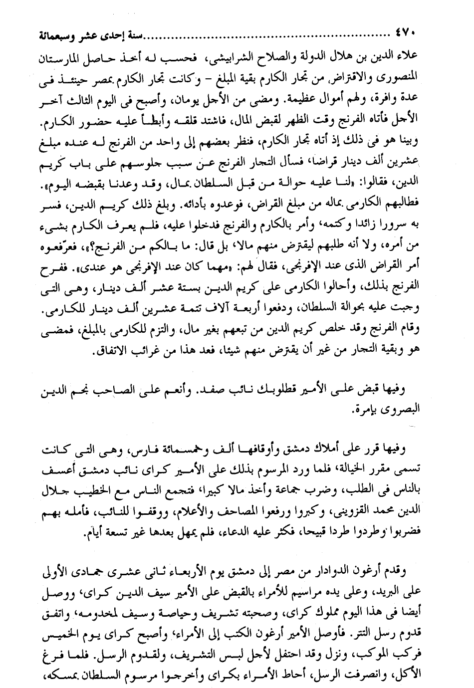عَلَاء الدّين بن هِلَال الدولة وَالصَّلَاح الشرابيشي فَحسب لَهُ أَخذ حَاصِل المارستان المنصوري والاقتراض من تجار الكارم بَقِيَّة الْمبلغ وَكَانَت تجار الكارم بِمصْر حِينَئِذٍ فِي عدَّة وافرة وَلَهُم أَمْوَال عَظِيمَة. وَمضى من الْأَجَل يَوْمَانِ وَأصْبح فِي الْيَوْم الثَّالِث آخر الْأَجَل فَأَتَاهُ الفرنج وَقت الظّهْر لقبض المَال فَاشْتَدَّ قلقه وَأَبْطَأ عَلَيْهِ حُضُور الكارم. وَبينا هُوَ فِي ذَلِك إِذْ أَتَاهُ تجار الكارم فَنظر بَعضهم إِلَى وَاحِد من الفرنج لَهُ عِنْده مبلغ عشْرين ألف دِينَار قراضا فَسَأَلَ التُّجَّار الفرنج عَن سَبَب جلوسهم على بَاب كريم الدّين فَقَالُوا: لنا عَلَيْهِ حِوَالَة من قبل السُّلْطَان بِمَال وَقد وعدنا بِقَبْضِهِ الْيَوْم. فطالبهم الكارمي بِمَالِه من مبلغ الْقَرَاض فوعدوه بِأَدَائِهِ. وَبلغ ذَلِك كريم الدّين فسر بِهِ سُرُورًا زَائِدا وكتمه وَأمر بالكارم والفرنج فَدَخَلُوا عَلَيْهِ فَلم يعرف الكارم بِشَيْء من أمره وَلَا أَنه طَلَبهمْ ليقترض مِنْهُم مَالا بل قَالَ: مَا بالكم من الفرنج فعرفوه أَمر الْقَرَاض الَّذِي عِنْد الافرنجي فَقَالَ لَهُم: مهما كَانَ عِنْد الإفرنجي هُوَ عِنْدِي. ففرح الفرنج بذلك وأحالوا الكارمي على كريم الدّين بِسِتَّة عشر ألف دِينَار وَهِي الَّتِي وَجَبت عَلَيْهِ بحوالة السُّلْطَان ودفعوا أَرْبَعَة آلَاف تَتِمَّة عشْرين ألف دِينَار للكارمي. وَقَامَ الفرنج وَقد خلص كريم الدّين من تَبِعَهُمْ بِغَيْر مَال وَالْتزم للكارمي بالمبلغ فَمضى هُوَ وَبَقِيَّة التُّجَّار من غير أَن يقترض مِنْهُم شَيْئا فعد هَذَا من غرائب الِاتِّفَاق. وفيهَا قبض على الْأَمِير قطلوبك نَائِب صفد. وأنعم على الصاحب نجم الدّين البصروي بإمرة. وفيهَا قرر على أَمْلَاك دمشق وأوقافها ألف وَخَمْسمِائة فَارس وَهِي الَّتِي كَانَت تسمى مُقَرر الخيالة فَلَمَّا ورد المرسوم بذلك على الْأَمِير كراي نَائِب دمشق أعسف بِالنَّاسِ فِي الطّلب وَضرب جمَاعَة وَأخذ مَالا كَبِيرا فتجمع النَّاس مَعَ الْخَطِيب جلال الدّين مُحَمَّد الْقزْوِينِي وَكَبرُوا وَرفعُوا الْمَصَاحِف والأعلام ووقفوا للنائب فأمله بهم فَضربُوا وطردوا طرداً قبيحا فَكثر عَلَيْهِ الدُّعَاء فَلم يُمْهل بعْدهَا غير تِسْعَة أَيَّام. وَقدم أرغون الدوادار من مصر إِلَى دمشق يَوْم الْأَرْبَعَاء ثَانِي عشرى جُمَادَى الأولى على الْبَرِيد وعَلى يَده مراسيم لِلْأُمَرَاءِ بِالْقَبْضِ على الْأَمِير سيف الدّين كراي وَوصل أَيْضا فِي هَذَا الْيَوْم مَمْلُوك كراي وصحبته تشريف وحياصة وَسيف لمخدومه وَاتفقَ قدوم رسل التتر. فأوصل الْأَمِير أرغون الْكتب إِلَى الْأُمَرَاء وَأصْبح كراي يَوْم الْخَمِيس فَركب الْمركب وَنزل وَقد احتفل لأجل لبس التشريف ولقدوم الرُّسُل. فَلَمَّا فرغ الْأكل وانصرفت الرُّسُل أحَاط الْأُمَرَاء بكراي وأخرجوا مرسوم السُّلْطَان بمسكه
