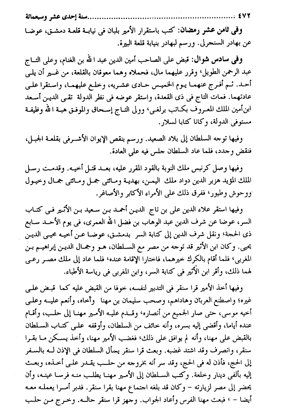 وَفِي ثامن عشر رَمَضَان: كتب باستقرار الْأَمِير بلبان فِي نِيَابَة قلعة دمشق عوضا عَن بهادر السنجرلي. ورسم لبهادر بنيابة قلعة البيرة. وَفِي سادس شَوَّال: قبض على الصاحب أَمِين الدّين عبد الله بن الغنام وعَلى التَّاج عبد الرَّحْمَن الطَّوِيل وَقرر عَلَيْهِمَا مَال فحملاه وهما معوقان بالقلعة من غر أَن يَلِي أحد. ثمَّ أفرج عَنْهُمَا يَوْم الْخَمِيس حادي عشريه وخلع عَلَيْهِمَا واستقرا على عَادَتهمَا. فَمَاتَ التَّاج فِي ذِي الْقعدَة وإستقر عوضه فِي نظر الدولة تَقِيّ الدّين أسعد ابْن أَمِين الْملك الْمَعْرُوف بكاتب برلغي وَولى التَّاج إِسْحَاق والموفق هبة الله وَظِيفَة مُسْتَوْفِي الدولة وَكَانَا كتابا لسلار. وفيهَا توجه السُّلْطَان إِلَى بِلَاد الصَّعِيد. ورسم بِنَقص الإيوان الأشرفي بقلعة الْجَبَل فنقض وجدد فَلَمَّا عَاد السُّلْطَان جلس فِيهِ على الْعَادة. وفيهَا وصل كرنبس ملك النّوبَة بالقود الْمُقَرّر عَلَيْهِ بعد قتل أَخِيه. وقدمت رسل الْملك الْمُؤَيد هزبر الدّين دواد ملك الْيمن بهدية ومائتي جمل ومائتي جمال وخيول ووحوش وطيور فَفرق ذَلِك على الْأُمَرَاء الأكابر والأصاغر. وفيهَا اسْتَقر عَلَاء الدّين عَليّ بن تَاج الدّين أَحْمد بن سعيد بن الْأَثِير فِي كتاب السِّرّ عوضا عَن شرف الدّين عبد الْوَهَّاب بن فضل الله الْعمريّ فِي يَوْم الْأَحَد سَابِع ذِي الْحجَّة وَنقل شرف الدّين إِلَى كِتَابَة السِّرّ بِدِمَشْق عوضا عَن أَخِيه محيي الدّين يحيى. وَكَانَ ابْن الْأَثِير قد توجه من مصر مَعَ السُّلْطَان هُوَ وجمال الدّين إِبْرَاهِيم بن المغربي فَلَمَّا أَقَامَ بالكرك خيرهما فاختارا الْإِقَامَة عِنْده فَلَمَّا عَاد إِلَى ملك مصر رعى لَهما ذَلِك وَأقر ابْن الْأَثِير فِي كِتَابَة السِّرّ وَابْن المغربي فِي رياسة الْأَطِبَّاء. وفيهَا أَخذ الْأَمِير قرا سنقر فِي التَّدْبِير لنَفسِهِ خوفًا من الْقَبْض عَلَيْهِ كَمَا قبض على غَيره واصطنع العربان وهاداهم وَصَحب سُلَيْمَان بن مهنا وأخاه وأنعم عَلَيْهِ وعَلى أَخِيه مُوسَى حَتَّى صَار الْجَمِيع من أنصاره وَقدم عَلَيْهِ الْأَمِير مهنا إِلَى حلب وَأقَام عِنْده أَيَّامًا وأفضى إِلَيْهِ بسره وَأَنه خَائِف من السُّلْطَان وَأَوْقفهُ على كتاب السُّلْطَان بِالْقَبْضِ على مهنا وَأَنه لم يُوَافق على ذَلِك فَغَضب الْأَمِير مهنا وَأخذ يسكن مَا بقرًا سنقر وَانْصَرف وَقد اشْتَدَّ غَضَبه. وَبعث قرا سنقر يسْأَل السُّلْطَان فِي الْإِذْن لَهُ بِالسَّفرِ إِلَى الْحَج فَأذن لَهُ فِي الْحَج وَقد سر أَنه بِخُرُوجِهِ من حلب يقدر على أَخذه وَبعث إِلَيْهِ بألفي دِينَار وخلعة. وَكتب السُّلْطَان إِلَى الْأَمِير مهنا يطْلب مِنْهُ فرسا عينه وَأَن يحضر إِلَى مصر لزيارته - وَكَانَ قد بلغه اجْتِمَاع مهنا بقرًا سنقر. فدبر أمرا يعمله مَعَه أَيْضا - فَبعث مهنا الْفرس وَأعَاد الْجَواب. وجهز قرا سنقر حَاله. وَخرج من حلب