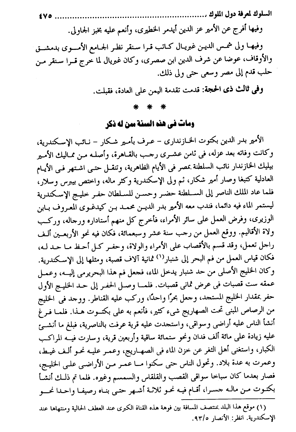 وفيهَا أفرج عَن الْأَمِير عز الدّين أيدمر الخطيري وأنعم عَلَيْهِ بِخبْز الجاولي. وفيهَا ولي شمس الدّين غبريال كَاتب قرا سنقر نظر الْجَامِع الْأمَوِي بِدِمَشْق والأوقاف عوضا عَن شرف الدّين ابْن صصري وَكَانَ غبريال لما خرج قرا سنقر من حلب قدم إِلَى مصر وسعى حَتَّى ولى ذَلِك. وَفِي ثَالِث ذِي الْحجَّة: قدمت تقدمة الْيمن على الْعَادة فَقبلت. وَمَات فِي هَذِه السّنة مِمَّن لَهُ ذكر الْأَمِير بدر الدّين بكتوت الخازنداري - عرف بأمير شكار - نَائِب الْإسْكَنْدَريَّة وَكَانَت وَفَاته بعد عَزله فِي ثامن عشرى رَجَب بِالْقَاهِرَةِ وَأَصله من مماليك الْأَمِير بيليك الخازندار نَائِب السلطنة بِمصْر فِي الْأَيَّام الظَّاهِرِيَّة وتنقل حَتَّى اشْتهر فِي الْأَيَّام العادلية كتبغا وَصَارَ أَمِير شكار ثمَّ ولى الْإسْكَنْدَريَّة وَكثر مَاله واختص بيبرس وسلار فَلَمَّا عَاد الْملك النَّاصِر إِلَى السلطنة حضر وَحسن للسُّلْطَان حفر خليج الْإسْكَنْدَريَّة ليستمر المَاء فِيهِ دَائِما فندب مَعَه الْأَمِير بدر الدّين مُحَمَّد بن كيدغوي الْمَعْرُوف بِابْن الوزيري وَفرض الْعَمَل على سَائِر الْأُمَرَاء فَأخْرج كل مِنْهُم أستاداره وَرِجَاله وَركب وُلَاة الأقاليم. وَوَقع الْعَمَل من رَجَب سنة عشر وَسَبْعمائة فَكَانَ فِيهِ نَحْو الْأَرْبَعين ألف راجل تعْمل وَقد قسم بالأقصاب على الْأُمَرَاء والولاة وحفر كل أحظ مَا حد لَهُ فَكَانَ قِيَاس الْعَمَل من فَم الْبَحْر إِلَى شنبار ثَمَانِيَة آلَاف قَصَبَة وَمثلهَا إِلَى الْإسْكَنْدَريَّة. وَكَانَ الخليج الْأَصْلِيّ من حد شنبار يدْخل المَاء فَجعل فَم هَذَا الْبَحْر يَرْمِي إِلَيْهِ وَعمل عمقه سِتّ قصبات فِي عرض ثَمَانِي قصبات. فَلَمَّا وصل الْحفر إِلَى حد الخليج الأول حفر بِمِقْدَار الخليج المستجد وَجعل بحراً وَاحِدًا وَركب عَلَيْهِ القناطر. وَوجد فِي الخليج من الرصاص الْمَبْنِيّ تَحت الصهاريج شَيْء كثير فأنعم بِهِ على بكتوت هَذَا. فَلَمَّا فرغ أنشأ النَّاس عَلَيْهِ أَرَاضِي وسواقي واستجدت عَلَيْهِ قَرْيَة عرفت بالناصرية فَبلغ مَا أنشئ عَلَيْهِ زِيَادَة على مائَة ألف فدان وَنَحْو سِتّمائَة ساقية وَأَرْبَعين قَرْيَة وسارت فِيهِ المراكب الْكِبَار وَاسْتغْنى أهل الثغر عَن خزن المَاء فِي الصهاريج وَعمر عَلَيْهِ نَحْو ألف غيط وعمرت بِهِ عدَّة بِلَاد. وتحول النَّاس حَتَّى سكنوا مَا عمر من الْأَرَاضِي على الخليج فَصَارَ بَعْدَمَا كَانَ سباخاً سواقي الْقصب والقلقاس والسمسم وَغَيره. فَلَمَّا تمّ ذَلِك أنشأ بكتوت من مَاله جِسْرًا أَقَامَ فِيهِ نَحْو ثَلَاثَة أشهر حَتَّى بناه رصيفا وَاحِدًا نَحْو