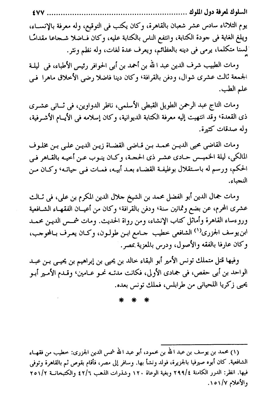 يَوْم الثُّلَاثَاء سادس عشر شعْبَان بِالْقَاهِرَةِ وَكَانَ يكْتب فِي التوقيع وَله معرفَة بالإنشاء وَبلغ الْغَايَة فِي جودة الْكِتَابَة وانتفع النَّاس بِالْكِتَابَةِ عَلَيْهِ وَكَانَ فَاضلا شجاعاً مقداماً لسناً متكلماً يَرْمِي فِي دينه بالعظائم وَيعرف عدَّة لُغَات وَله نظم ونثر. وَمَات الطَّبِيب شرف الدّين عبد الله بن أَحْمد بن أبي الحوافر رَئِيس الْأَطِبَّاء فِي لَيْلَة الْجُمُعَة ثَالِث عشرى شَوَّال وَدفن بالقرافة وَكَانَ دينا فَاضلا رَضِي الْأَخْلَاق ماهراً فِي علم الطِّبّ. وَمَات التَّاج عبد الرَّحْمَن الطَّوِيل القبلي الْأَسْلَمِيّ نَاظر الدَّوَاوِين فِي ثَانِي عشرى ذِي الْقعدَة وَقد انْتَهَيْت إِلَيْهِ معرفَة الْكِتَابَة الديوانية وَكَانَ إِسْلَامه فِي الْأَيَّام الأشرفية وَله صدقَات كَثِيرَة. وَمَات القَاضِي محيي الدّين مُحَمَّد بن قَاضِي الْقُضَاة زين الدّين على بن مخلوف الْمَالِكِي لَيْلَة الْخَمِيس حادي عشر ذِي الْحجَّة وَكَانَ يَنُوب عَن أَخِيه بالقاهر فِي الحكم ورسم لَهُ باستقلال بوظيفة الْقَضَاء بعد أَبِيه فَمَاتَ فِي حَيَاته وَكَانَ من النجباء. وَمَات جمال الدّين أَبُو الْفضل مُحَمَّد بن الشَّيْخ جلال الدّين المكرم بن عَليّ فِي ثَالِث عشرى الْمحرم عَن بضع وَثَمَانِينَ سنة وَدفن بالقرافة وَكَانَ من أَعْيَان الْفُقَهَاء الشَّافِعِيَّة وروءساء الْقَاهِرَة وأماثل كتاب الْإِنْشَاء وَمن رُوَاة الحَدِيث. وَمَات شمس الدّين مُحَمَّد ابْن يُوسُف الْجَزرِي الشَّافِعِي خطيب جَامع ابْن طولون وَكَانَ يعرف بالمحوجب وَكَانَ عَارِفًا بالفقه وَالْأُصُول ودرس بالمعزية بِمصْر. وفيهَا قتل متملك تونس الْأَمِير أَبُو الْبَقَاء خَالِد بن يحيى بن إِبْرَاهِيم بن يحيى بن عبد الْوَاحِد بن أبي حَفْص فِي جُمَادَى الأولى فَكَانَت مدَّته نَحْو عَاميْنِ وَقدم الْأَمِير أَبُو يحيى زَكَرِيَّا اللحياني منطرابلس، فَملك تونس بعده.