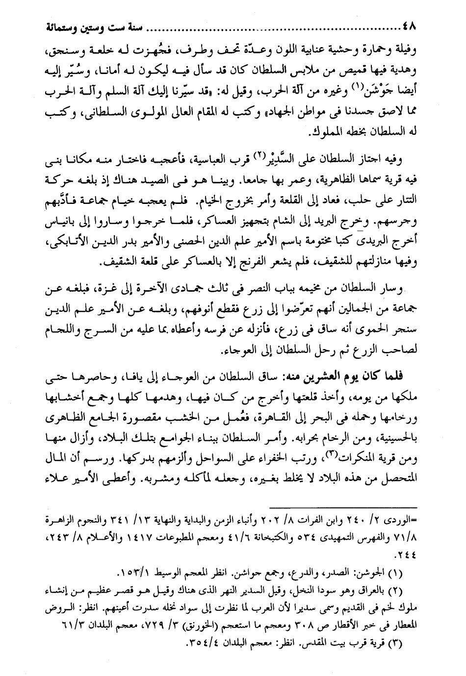 وفيلة وحمارة وحشية عنابية اللَّوْن وعدة تحف وطرف فجهزت لَهُ خلعة وسنجق وهدية فِيهَا قَمِيص من ملابس السُّلْطَان كَانَ قد سَأَلَ فِيهِ ليَكُون لَهُ أَمَانًا وسير إِلَيْهِ أَيْضا جوشن وَغَيره من آلَة الْحَرْب وَقيل لَهُ: قد سيرنا إِلَيْك آلَة السّلم وَآلَة الْحَرْب مِمَّا لاصق جسدنا فِي مَوَاطِن الْجِهَاد وَكتب لَهُ الْمقَام العالي المولوي السلطاني وَكتب لَهُ السُّلْطَان بِخَطِّهِ الْمَمْلُوك. وَفِيه اجتاز السُّلْطَان على السدير قرب العباسية فأعجبه فَاخْتَارَ مِنْهُ مَكَانا بني فِيهِ قَرْيَة سَمَّاهَا الظَّاهِرِيَّة وَعمر بهَا جَامعا. وَبينا هُوَ فِي الصَّيْد هُنَاكَ إِذْ بلغه حَرَكَة التتار على حلب فَعَاد إِلَى القلعة وَأمر بِخُرُوج الْخيام. فَلم يُعجبهُ خيام جمَاعَة فأدبهم وجرسهم. وَخرج الْبَرِيد إِلَى الشَّام بتجهيز العساكر فَلَمَّا خَرجُوا وَسَارُوا إِلَى بانياس أخرج البريدي كتبا مختومة باسم الْأَمِير علم الدّين الحصني والأمير بدر الدّين الأتابكي وفيهَا منازلتهم للشقيف فَلم يشْعر الفرنج إِلَّا بالعساكر على قلعة الشقيف. وَسَار السُّلْطَان من مخيمه بِبَاب النَّصْر فِي ثَالِث جُمَادَى الْآخِرَة إِلَى غَزَّة فَبَلغهُ عَن جمَاعَة من الجمالين إِنَّهُم تعرضوا إِلَى زرع فَقطع أنوفهم وبلغه عَن الْأَمِير علم الدّين سنجر الْحَمَوِيّ إِنَّه سَاق فِي زرع فأنزله عَن فرسه وَأَعْطَاهُ بِمَا عَلَيْهِ من السرج واللجام لصَاحب الزَّرْع ثمَّ رَحل السُّلْطَان إِلَى العوجاء. فَلَمَّا كَانَ يَوْم الْعشْرين مِنْهُ: سَاق السُّلْطَان من العوجاء إِلَى يافا وحاصرها حَتَّى ملكهَا من يَوْمه وَأخذ قلعتها وَأخرج من كَانَ فِيهَا وهدمها كلهَا وَجمع أخشابها ورخامها وَحمله فِي الْبَحْر إِلَى الْقَاهِرَة فَعمل من الْخشب مَقْصُورَة الْجَامِع الظَّاهِرِيّ بالحسينية وَمن الرخام بحرابه. وَأمر السُّلْطَان بِبِنَاء الْجَوَامِع بِتِلْكَ الْبِلَاد وأزال مِنْهَا وَمن قَرْيَة الْمُنْكَرَات ورتب الخفراء على السواحل وألزمهم بدركها. ورسم أَن المَال المتحصل من هَذِه الْبِلَاد لَا يخلط بِغَيْرِهِ وَجعله لمأكله ومشربه. وَأعْطِي الْأَمِير عَلَاء
