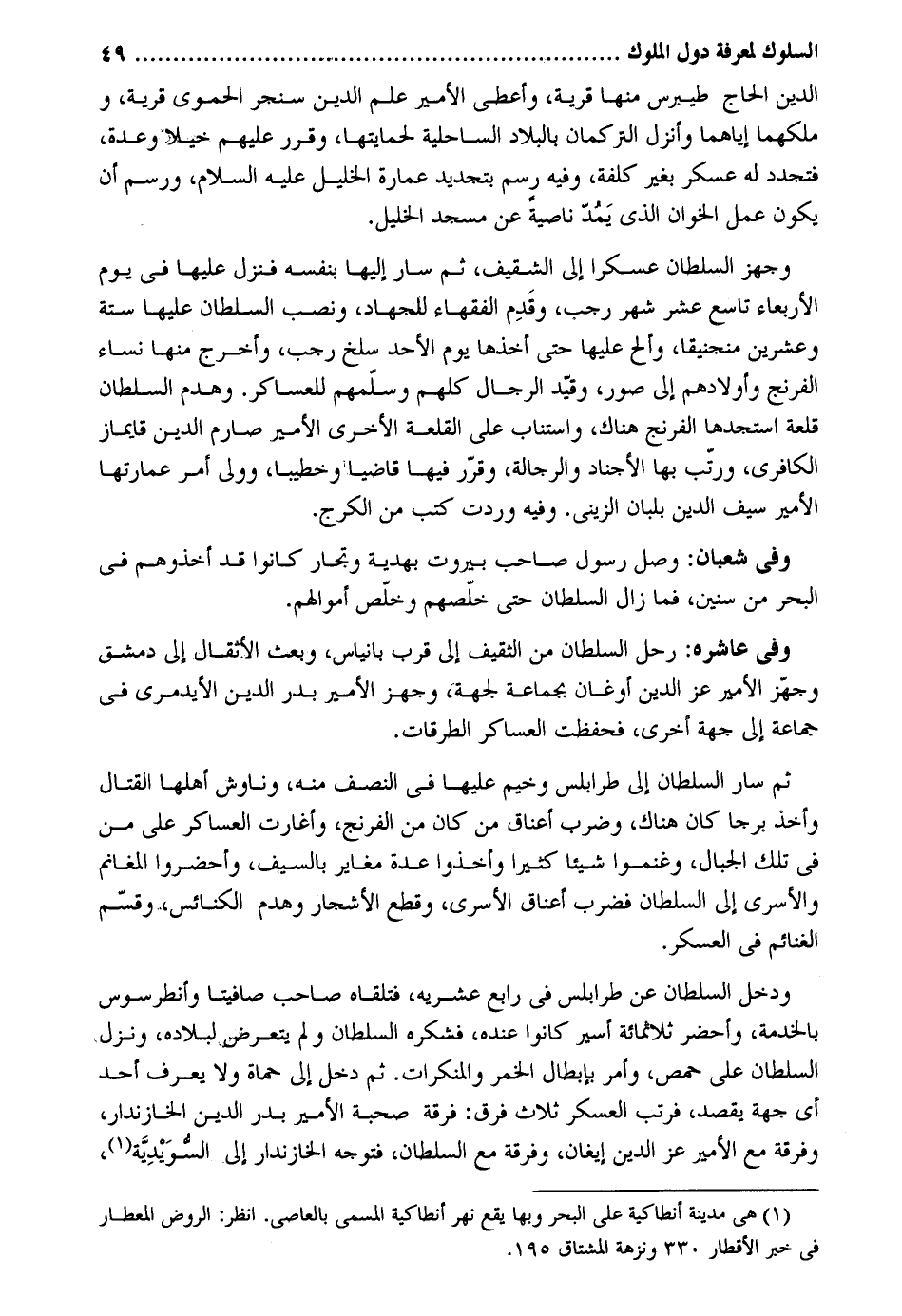 الدّين الْحَاج طيبرس مِنْهَا قَرْيَة وَأعْطِي الْأَمِير علم الدّين سنجر الْحَمَوِيّ قَرْيَة وملكهما إيَّاهُمَا وَأنزل التركمان بالبلاد الساحلية لحمايتها وَقرر عَلَيْهِم خيلا وعدة فتجدد لَهُ عَسْكَر بِغَيْر كلفة وَفِيه رسم بتجديد عمَارَة الْخَلِيل عَلَيْهِ السَّلَام ورسم أَن يكون عمل الخوان الَّذِي يمد نَاصِيَة عَن مَسْجِد الْخَلِيل. وجهز السُّلْطَان عسكرا إِلَى الشقيف ثمَّ سَار إِلَيْهَا بِنَفسِهِ فَنزل عَلَيْهَا فِي يَوْم الْأَرْبَعَاء تَاسِع عشر شهر رَجَب وَقدم الْفُقَهَاء للْجِهَاد وَنصب السُّلْطَان عَلَيْهَا سِتَّة وَعشْرين منجنيقا وألح عَلَيْهَا حَتَّى أَخذهَا يَوْم الْأَحَد سلخ رَجَب وَأخرج مِنْهَا نسَاء الفرنج وَأَوْلَادهمْ إِلَى صور وَقيد الرِّجَال كلهم وسلمهم للعساكر. وَهدم السُّلْطَان قلعة استجدها الفرنج هُنَاكَ واستناب على القلعة الْأُخْرَى الْأَمِير صارم الدّين قايماز الكافري ورتب بهَا الأجناد والرجالة وَقرر فِيهَا قَاضِيا وخطيبا وَولي أَمر عمارتها الْأَمِير سيف الدّين بلبان الزيني. وَفِيه وَردت كتب من وَفِي شعْبَان: وصل رَسُول صَاحب بيروت بهدية وتجار كَانُوا قد أخذوهم فِي الْبَحْر من سِنِين فَمَا زَالَ السُّلْطَان حَتَّى خلصهم وخلص أَمْوَالهم. وَفِي عاشره: رَحل السُّلْطَان من الثقيف إِلَى قرب بانياس وَبعث الأثقال إِلَى دمشق وجهز الْأَمِير عز الدّين أوغان بِجَمَاعَة لجِهَة وجهز الْأَمِير بدر الدّين الأيدمري فِي جمَاعَة إِلَى جِهَة أُخْرَى فَحفِظت العساكر الطرقات. ثمَّ سَار السُّلْطَان إِلَيّ طرابلس وخيم عَلَيْهَا فِي النّصْف مِنْهُ وناوش أَهلهَا الْقِتَال وَأخذ برجا كَانَ هُنَاكَ وَضرب أَعْنَاق من كَانَ من الفرنج وأغارت العساكر على من فِي تِلْكَ الْجبَال وغنموا شَيْئا كثيرا وَأخذُوا عدَّة مُغَاير بِالسَّيْفِ وأحضروا الْمَغَانِم والأسري إِلَى السُّلْطَان فَضرب أَعْنَاق الأسري وَقطع الْأَشْجَار وَهدم الْكَنَائِس وَقسم الْغَنَائِم فِي الْعَسْكَر. وَدخل السُّلْطَان عَن طرابلس فِي رَابِع عشريه فَتَلقاهُ صَاحب صافيتا وأنطرسوس بِالْخدمَةِ وأحضر ثَلَاثمِائَة أَسِير كَانُوا عِنْده فشكره السُّلْطَان وَلم يتَعَرَّض لبلاده وَنزل السُّلْطَان على حمص وَأمر بِإِبْطَال الْخمر والمنكرات. ثمَّ دخل إِلَى حماة وَلَا يعرف أحد أَي جِهَة يقْصد فرتب الْعَسْكَر ثَلَاث فرق: فرقة صُحْبَة الْأَمِير بدر الدّين الخازندار وَفرْقَة مَعَ الْأَمِير عز الدّين إيغان وَفرْقَة مَعَ السُّلْطَان فَتوجه الخازندار إِلَى السويدية