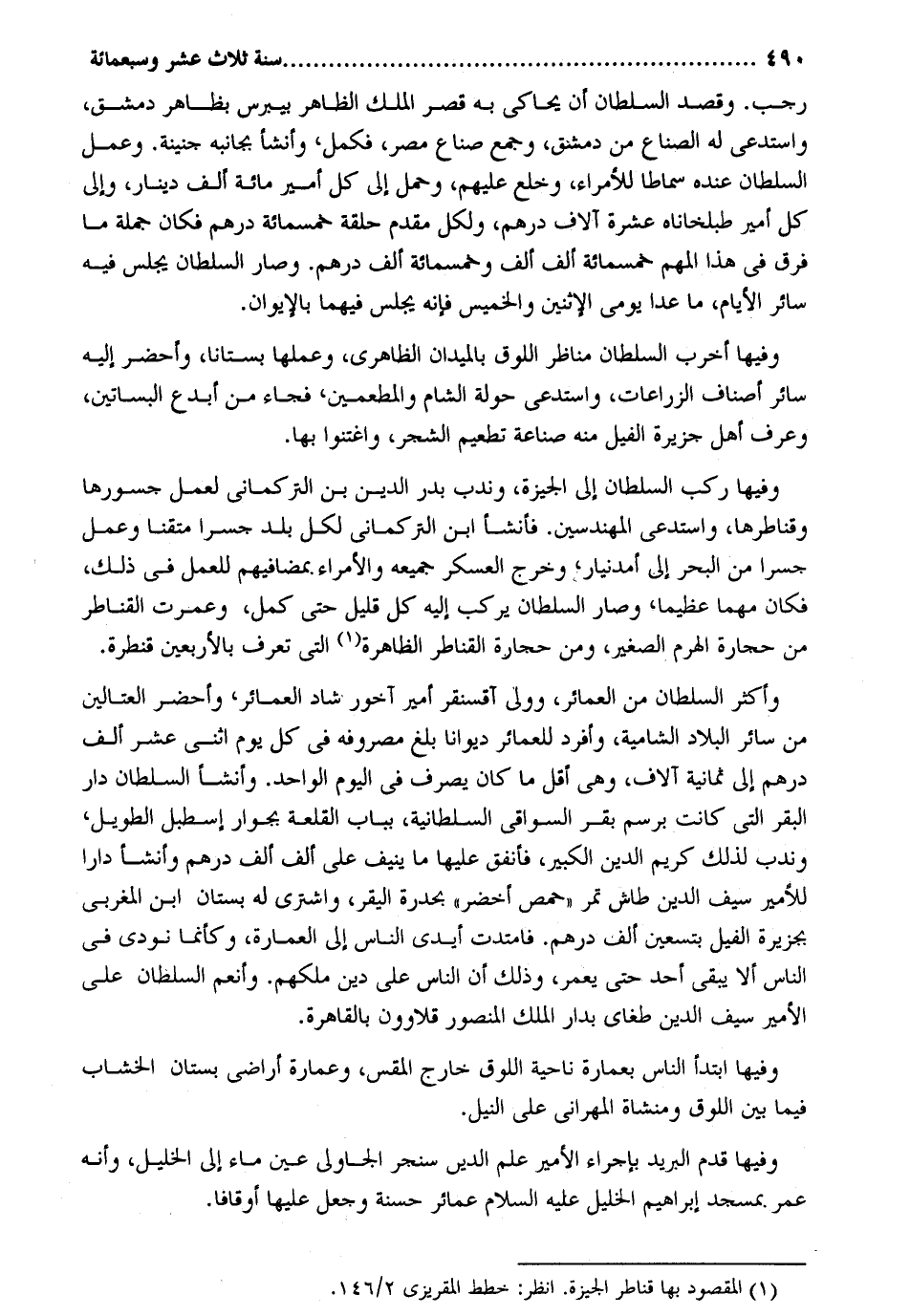 رَجَب. وَقصد السُّلْطَان أَن يحاكى بِهِ قصر الْملك الظَّاهِر بيبرس بطاهر دمشق، واستدعى لَهُ الصناع من دمشق، وَجمع صناع مصر، فكمل، وَأَنْشَأَ بجانبه جنينة. وَعمل السُّلْطَان عِنْده سماطا لِلْأُمَرَاءِ، وخلع عَلَيْهِم، وَحمل إِلَى كل أَمِير مائَة ألف دِينَار، وَإِلَى كل أَمِير طبلخاناه عشرَة آلَاف دِرْهَم، وَلكُل مقدم حَلقَة خَمْسمِائَة دِرْهَم فَكَانَ جملَة مَا فرق فِي هَذَا المهم خَمْسمِائَة ألف ألف وَخَمْسمِائة ألف دِرْهَم. وَصَارَ السُّلْطَان يجلس فِيهِ سَائِر الْأَيَّام، مَا عدا يومى الْإِثْنَيْنِ وَالْخَمِيس فَإِنَّهُ يجلس فيهمَا بالإيوان. وفيهَا أخرب السُّلْطَان مناظر اللوق بالميدان الظَّاهِرِيّ، وعملها بستانا، وأحضر إِلَيْهِ سَائِر أَصْنَاف الزراعات، واستدعى حولة الشَّام والمطعمين، فجَاء من أبدع الْبَسَاتِين، وَعرف أهل جَزِيرَة الْفِيل مِنْهُ صناعَة تطعيم الشّجر، واغتنوا بهَا. وفيهَا ركب السُّلْطَان إِلَى الجيزة، وَندب بدر الدّين بن التركماني لعمل جسورها وقناطرها، واستدعى المهندسين. فَأَنْشَأَ ابْن التركماني لكل بلد جِسْرًا متقنا وَعمل جِسْرًا من الْبَحْر إِلَى أمدنيار، وَخرج الْعَسْكَر جَمِيعه والأمراء بمضافيهم للْعَمَل فِي ذَلِك، فَكَانَ مهما عَظِيما، وَصَارَ السُّلْطَان يركب إِلَيْهِ كل قَلِيل حَتَّى كمل، وعمرت القناطر من حِجَارَة الْهَرم الصَّغِير، وَمن حجار القناطر الظَّاهِرَة الَّتِي تعرف بالأربعين قنطرة. وَأكْثر السُّلْطَان من العمائر، وَولى آقسنقر أَمِير آخور شاد العمائر، وأحضر العتالين من سَائِر الْبِلَاد الشامية، وأفرد للعمائر ديوانا بلغ مصروفه فِي كل يَوْم اثنى عشر ألف دِرْهَم إِلَى ثَمَانِيَة آلَاف، وَهِي أقل مَا كَانَ يصرف فِي الْيَوْم الْوَاحِد. وَأَنْشَأَ السُّلْطَان دَار الْبَقر الَّتِي كَانَت برسم بقر السواقي السُّلْطَانِيَّة، بِبَاب القلعة بجوار إسطبل الطَّوِيل، وَندب لذَلِك كريم الدّين الْكَبِير، فأنفق عَلَيْهَا مَا ينيف على ألف ألف دِرْهَم وَأَنْشَأَ دَارا للأمير سيف الدّين طاش تمر " حمص أَخْضَر " بحدرة اليقر، وَاشْترى لَهُ بُسْتَان ابْن المغربي بِجَزِيرَة الْفِيل بتسعين ألف دِرْهَم. فامتدت أَيدي النَّاس إِلَى الْعِمَارَة، وكأنما نُودي فِي النَّاس أَلا يبْقى أحد حَتَّى يعمر، وَذَلِكَ أَن النَّاس على دين ملكهم. وأنعم السُّلْطَان على الْأَمِير سيف الدّين طغاي دبار الْملك الْمَنْصُور قلاوون بِالْقَاهِرَةِ. وفيهَا ابْتَدَأَ النَّاس بعمارة نَاحيَة اللوق خَارج المقس، وَعمارَة أَرَاضِي بُسْتَان الخشاب فِيمَا بَين اللوق ومنشأة المهراني على النّيل. وفيهَا قدم الْبَرِيد بإجراء الْأَمِير علم الدّين سنجر الجاولي عين مَاء إِلَى الْخَلِيل، وَأَنه عمر بِمَسْجِد إِبْرَاهِيم الْخَلِيل عَلَيْهِ السَّلَام عمائر حَسَنَة وَجعل عَلَيْهَا أوقافا.